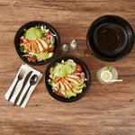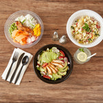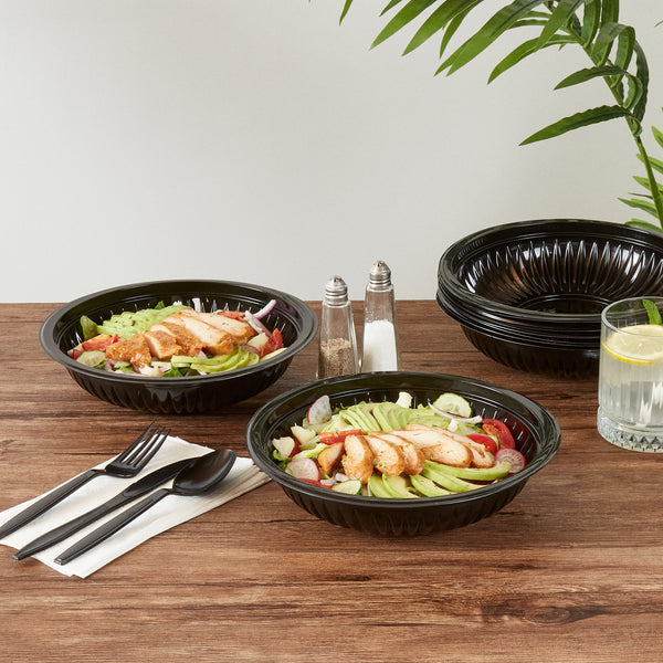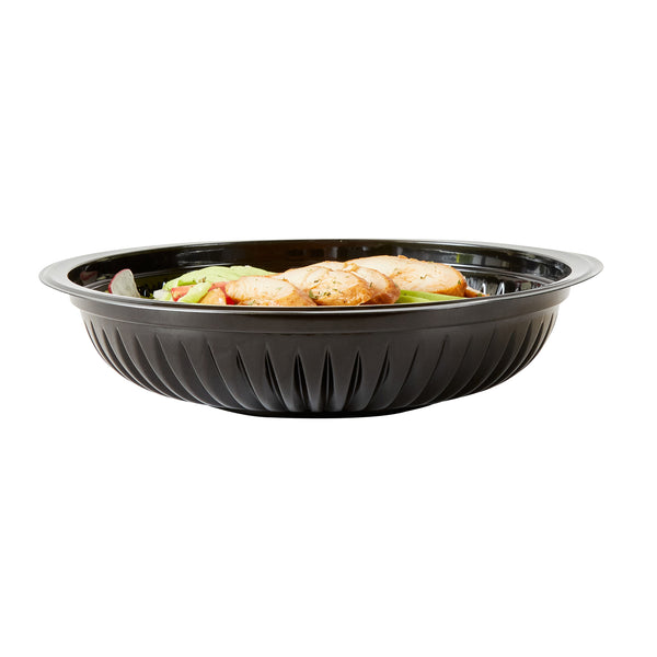 Elevate your dining experience with our Chef 101 34-ounce Round Black Plastic Bowls. These disposable bowls are designed to be microwave-safe and allow you to reheat meals easily without any hassle. Created from premium plastic, these serving bowls are suitable for both hot and cold food items, ensuring versatility in your kitchen. The sleek black finish of these food bowls enhances your food presentation and makes them ideal for serving food on various occasions. These plastic serving bowls are disposable and can be tossed after use, providing an easy cleanup solution. Plus, these pasta bowls are recyclable, offering an eco-friendly way to serve meals and reduce your carbon footprint. Measuring 9 inches in diameter by 2 inches in height, these plastic bowls have an ample capacity of 34 ounces and accommodate generous portions. Sold in a 100 count box.
