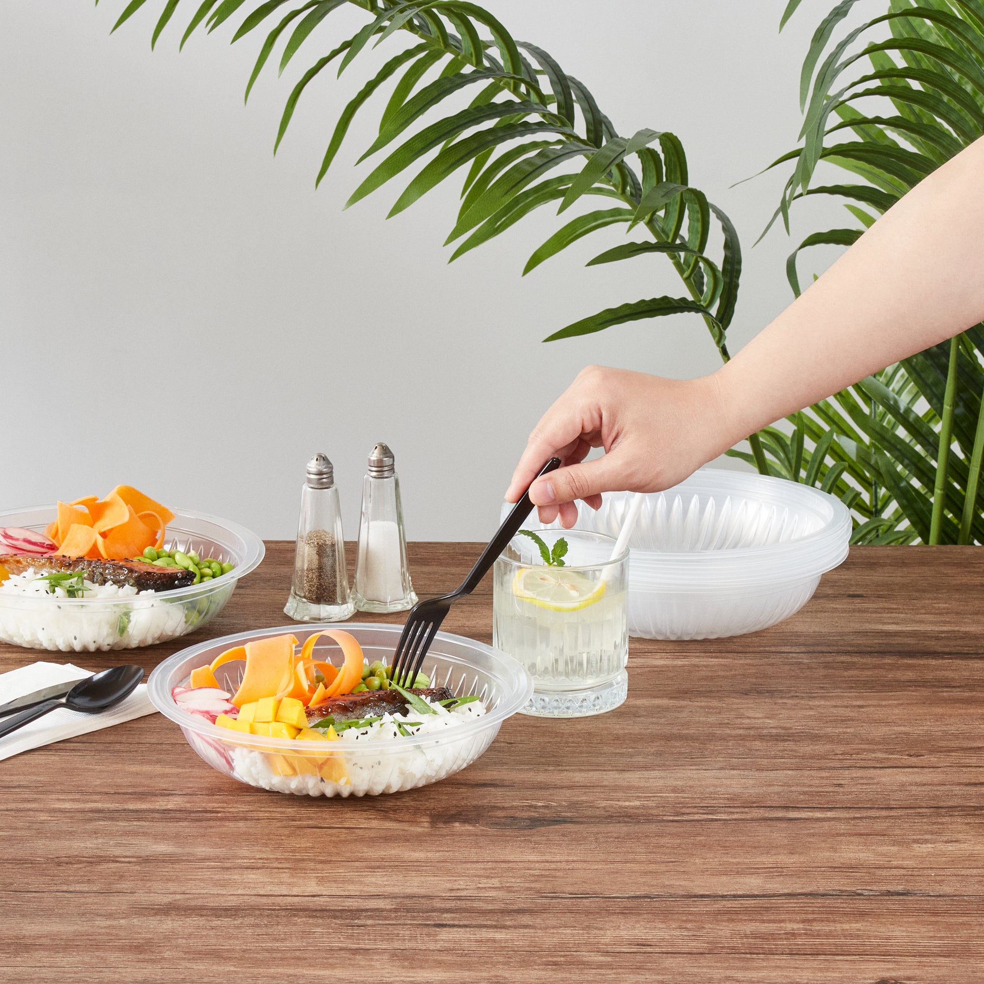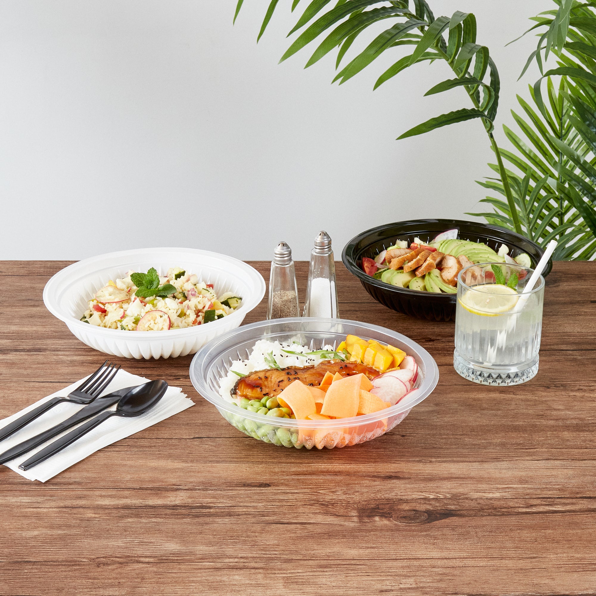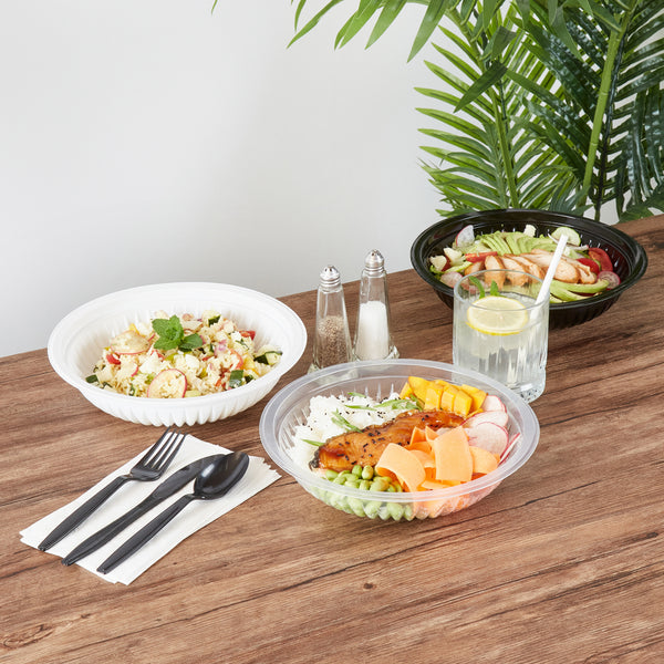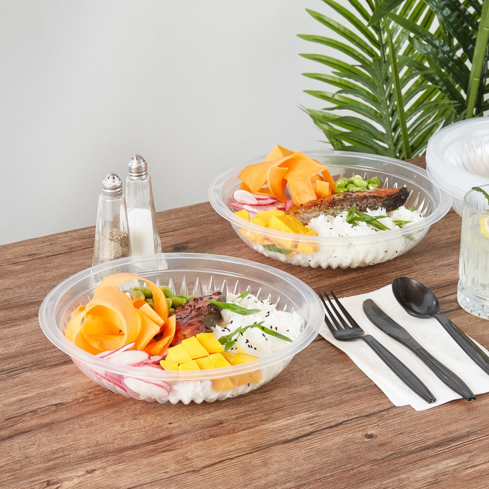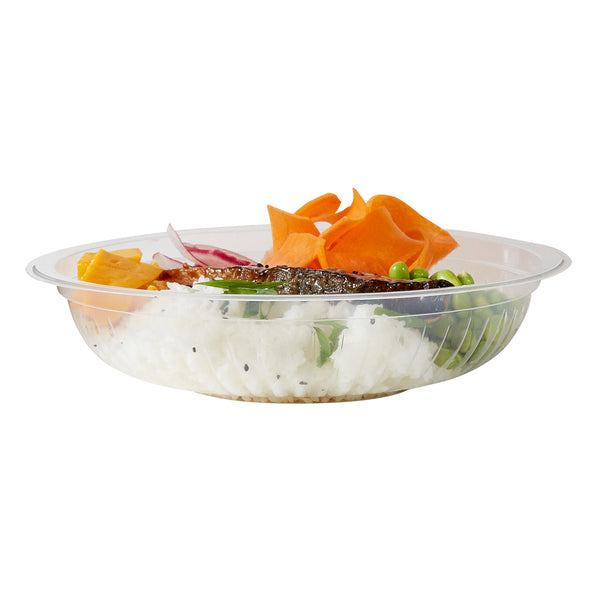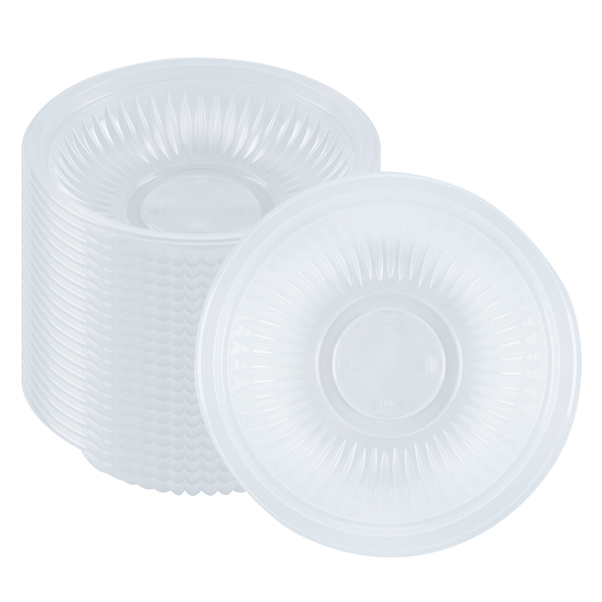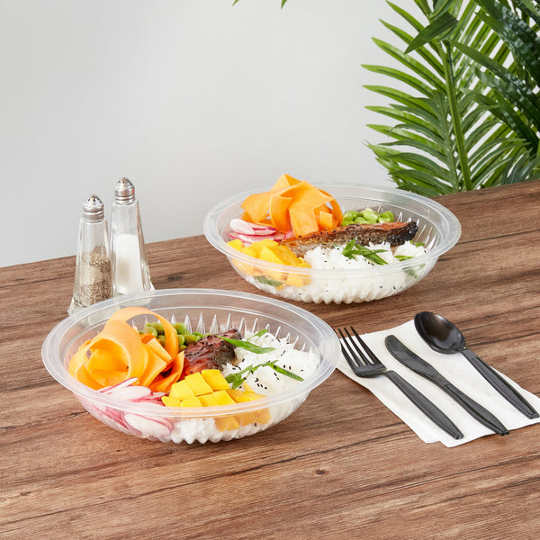 Serve your signature dishes with our Chef 101 34-ounce Round Clear Plastic Bowls. These serving bowls are microwave-safe to easily reheat meals, ensuring you can quickly and conveniently enjoy hot meals whenever you desire. Made from premium plastic, these disposable bowls are perfect for both hot and cold food items, allowing your culinary creations to shine. The clear finish of these plastic serving bowls provides a sleek and modern look, perfect for any occasion. These food bowls are disposable and can be disposed of after use, facilitating an efficient post-meal cleaning experience. Plus, these round bowls are recyclable and provide an eco-friendly food serving option, ideal for eco-conscious restaurants. Measuring 9 inches in diameter by 2 inches in height, these plastic bowls can hold up to 34 ounces and offer ample space for generous servings. Sold in a 50 count box.