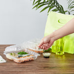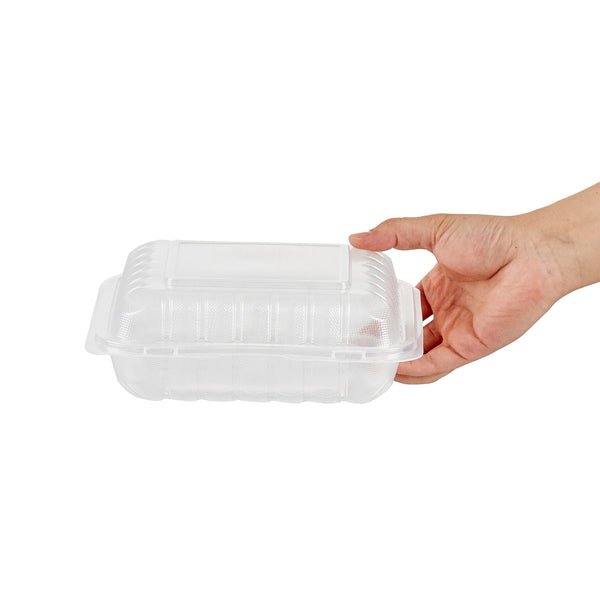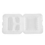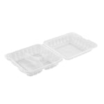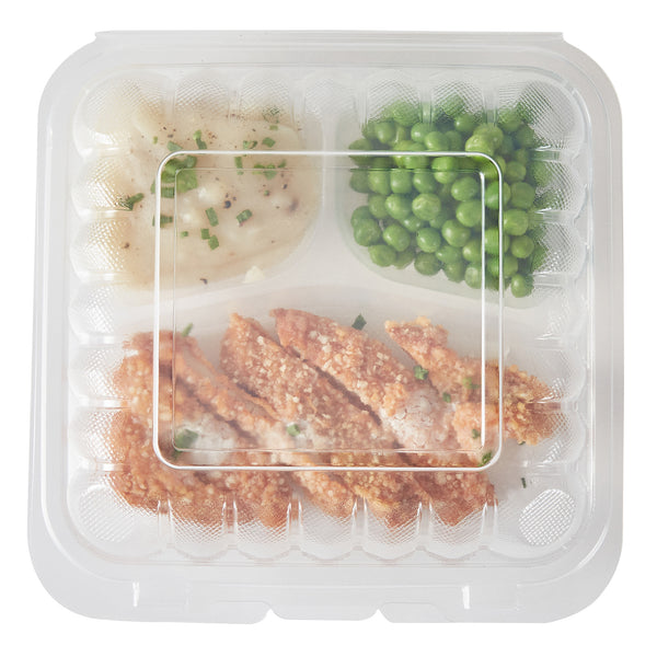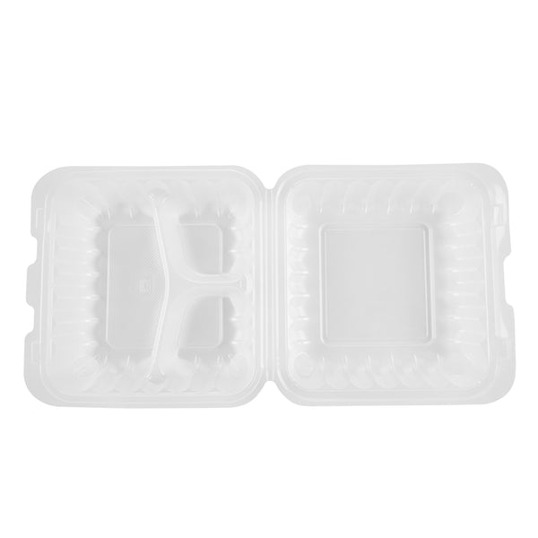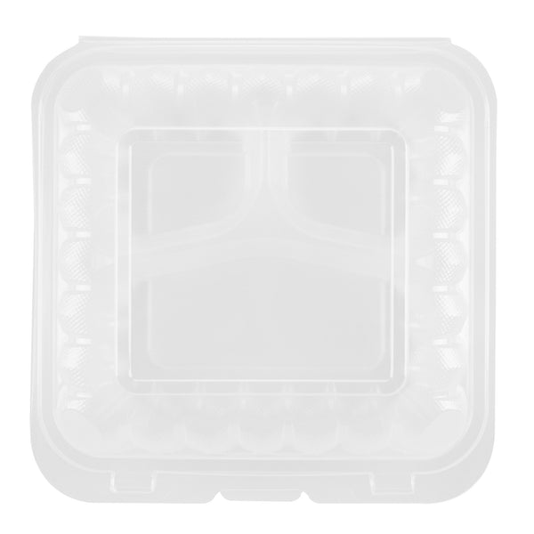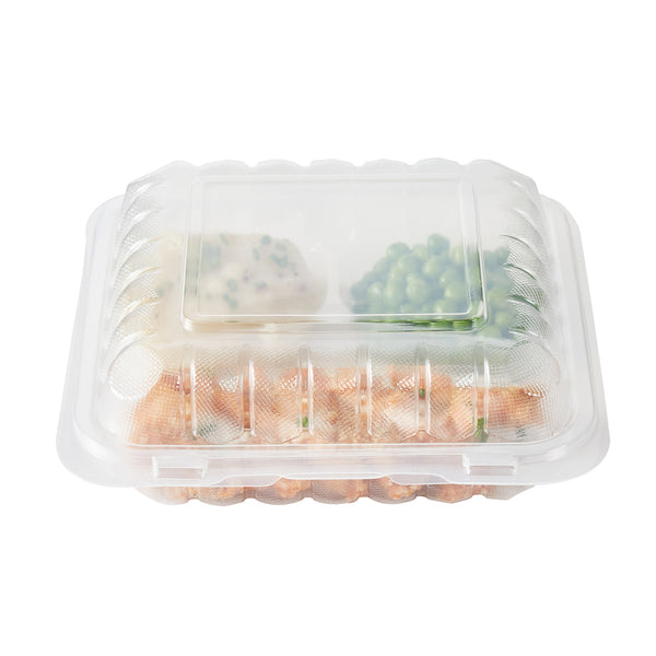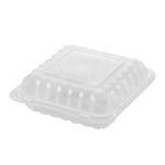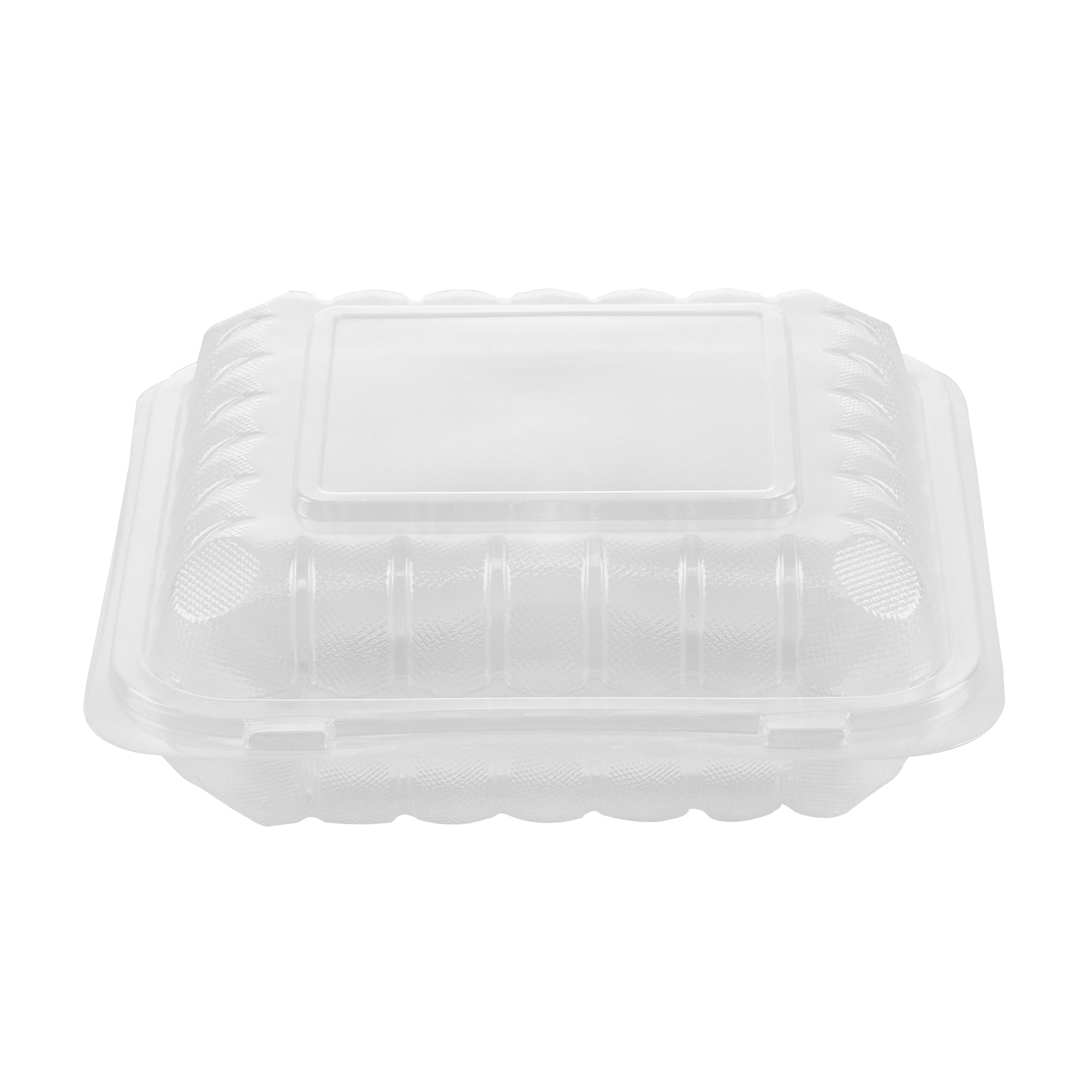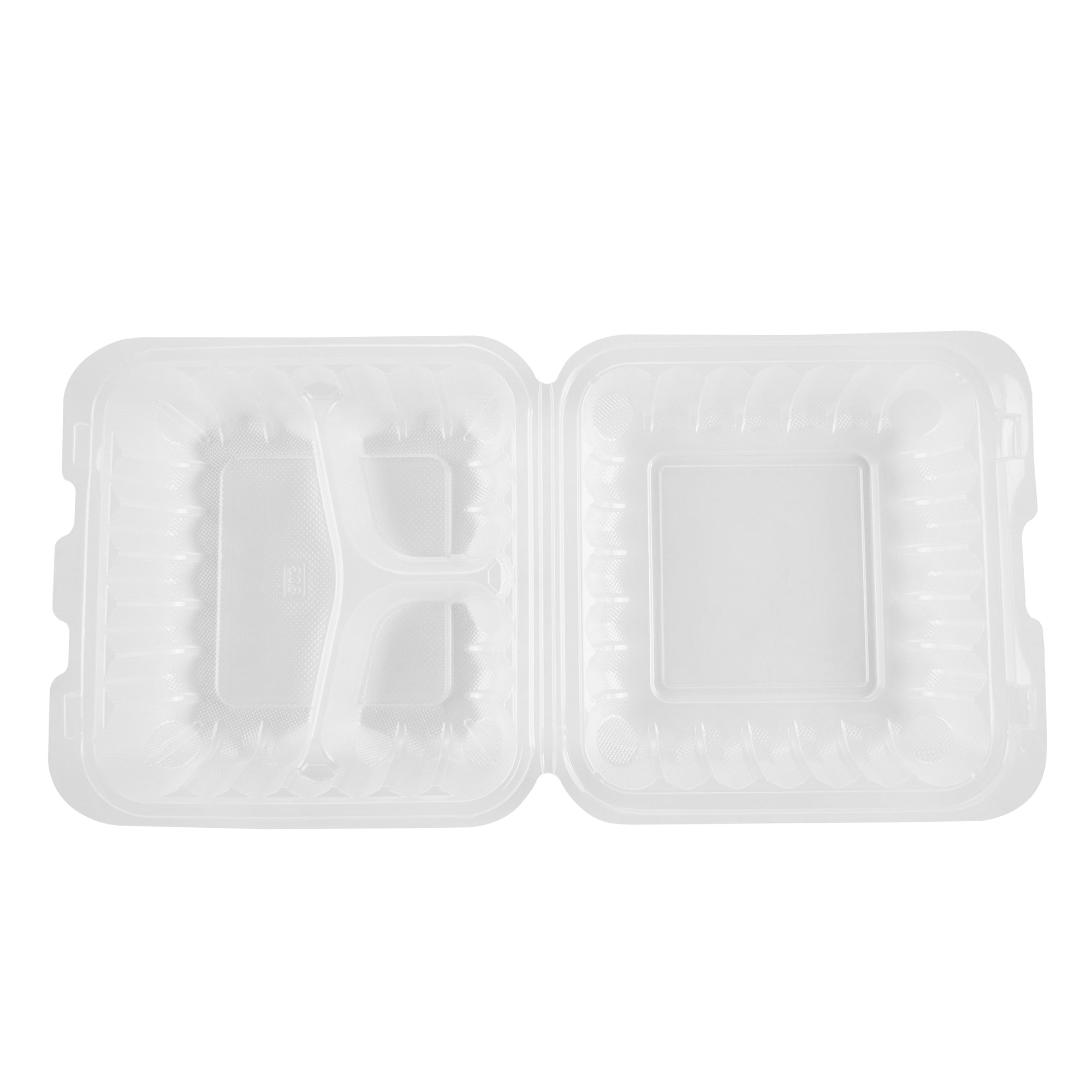 Keep your dishes fresh and appetizing with our Chef 101 34-ounce Square Clear Plastic Clamshell Containers. With 3 compartments, these take out containers keep food items neatly separated for effortless transport and storage. Designed to be microwave-safe, these carry out containers allow customers to easily heat their meals. Featuring a built-in hinged lid, these to go boxes form a secure seal to keep your food intact for a mess-free take out solution. These take out boxes are crafted from durable plastic and suitable for holding various hot and cold food items. The clear finish of these clamshell containers allows for easy visibility of the contents, making them ideal for displaying food items attractively. These to go containers are freezer-safe and allow you to refrigerate your leftovers. To facilitate an efficient post-meal cleanup, these disposable containers can be discarded after use. These plastic food containers are recyclable and offer an eco-friendly way to serve and pack food. Measuring 8 inches in length by 8 inches in width by 3 inches in height, these takeaway containers have a 34-ounce capacity, perfect for a variety of meal portions. Sold in a 50 count box.