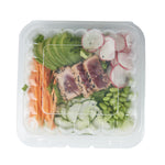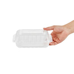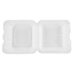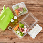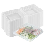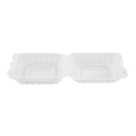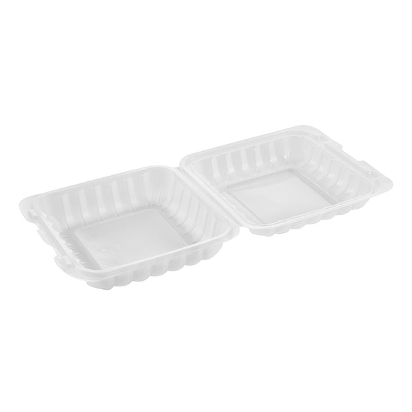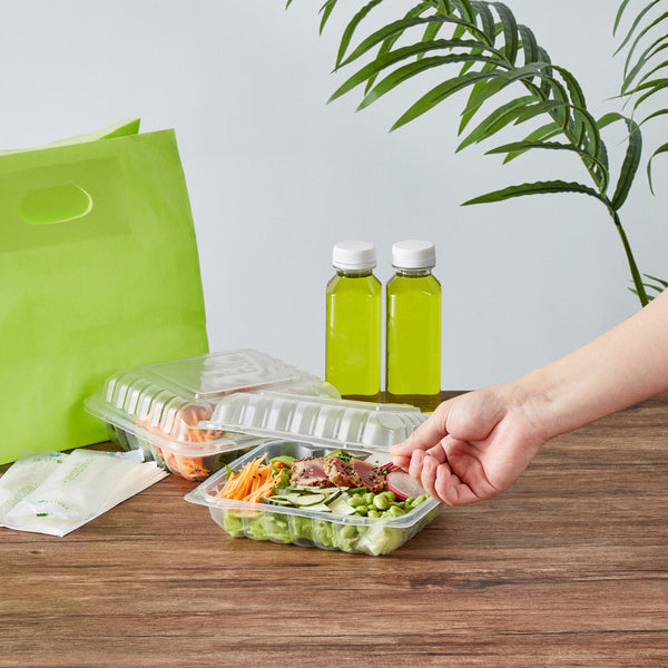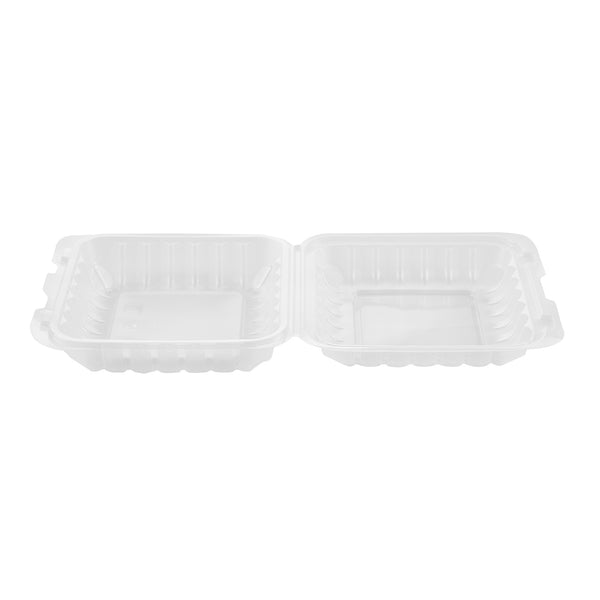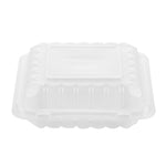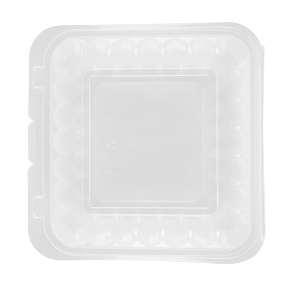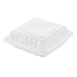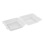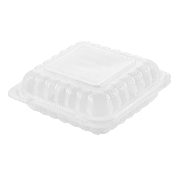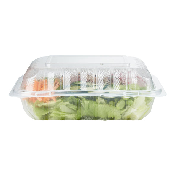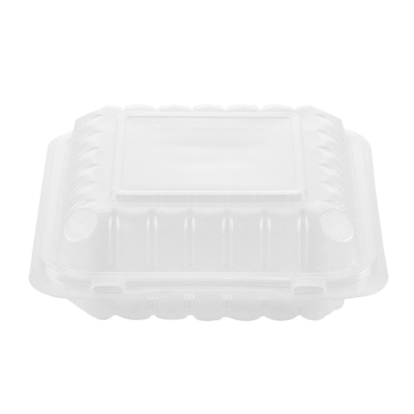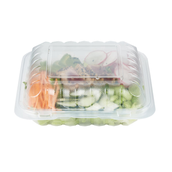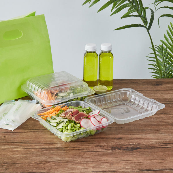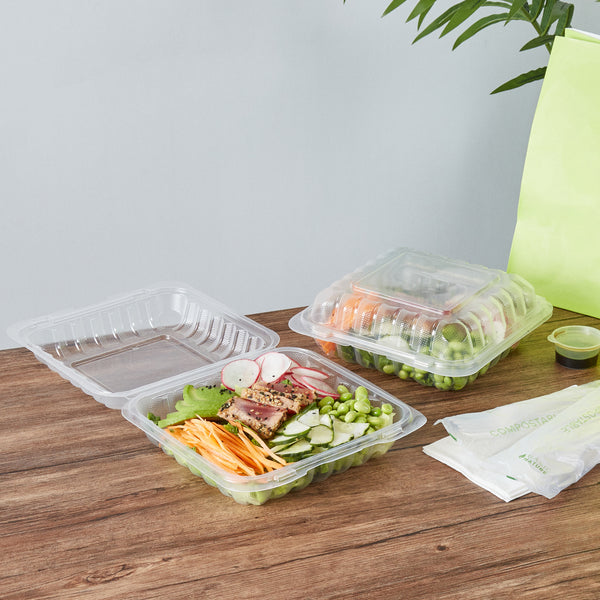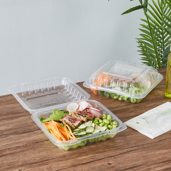Pack your signature food with our Chef 101 34-ounce Square Clear Plastic Clamshell Containers. Designed to be microwave-safe, these to go containers facilitate quick and easy meal reheating. These clamshell containers feature an attached hinged lid and form a secure seal, keeping your food intact in transit. The clear finish on these take out containers expertly showcases the contents, making them ideal for display. Crafted from durable plastic, these to go boxes are suitable for serving both hot and cold dishes. For convenient storage of leftovers, these carry out containers are freezer-safe. These take out boxes are disposable and can be discarded after use, offering an easy cleanup, perfect for fast-paced environments. Ideal for eco-conscious foodservice establishments, these disposable food containers are recyclable and help reduce your carbon footprint. Measuring 8 inches in length by 8 inches in width by 3 inches in height, these plastic clamshell containers have a capacity of 34 ounces. Sold in a 50 count box.