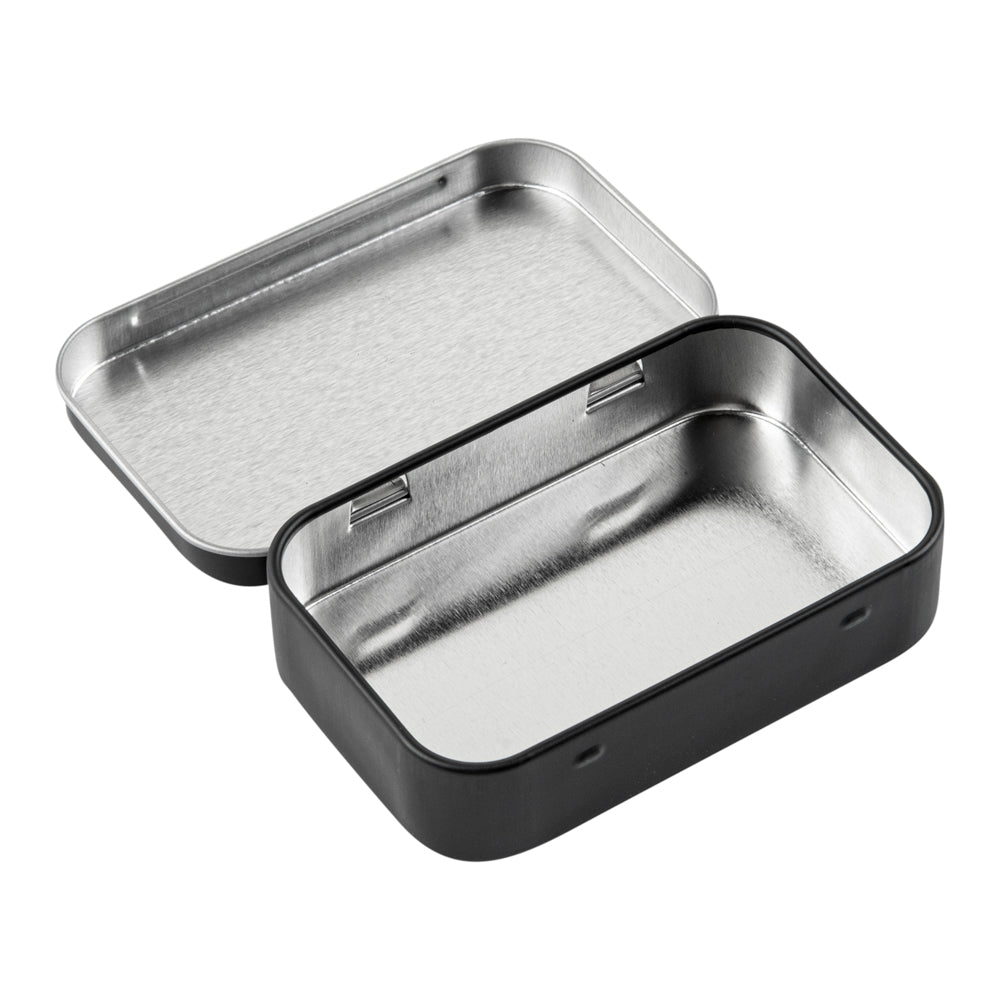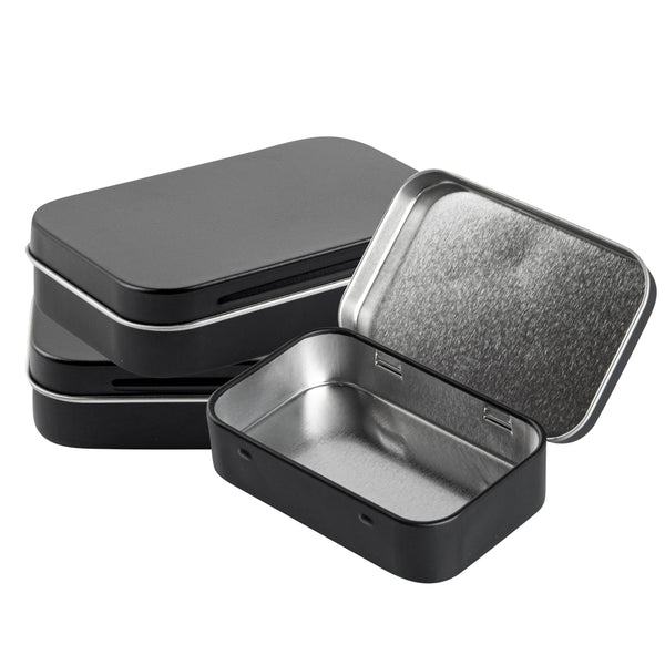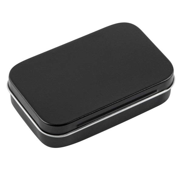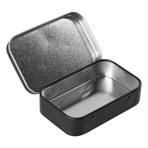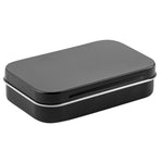 4 OZ RECTANGLE BLACK TIN CONTAINER - WITH HINGED LID