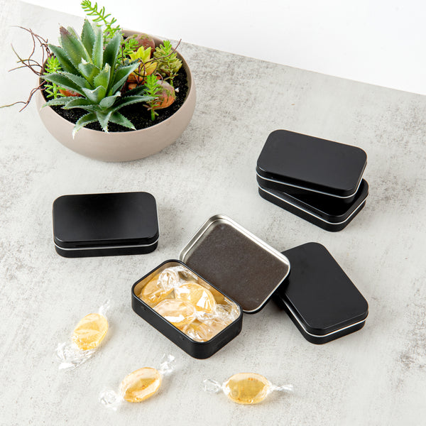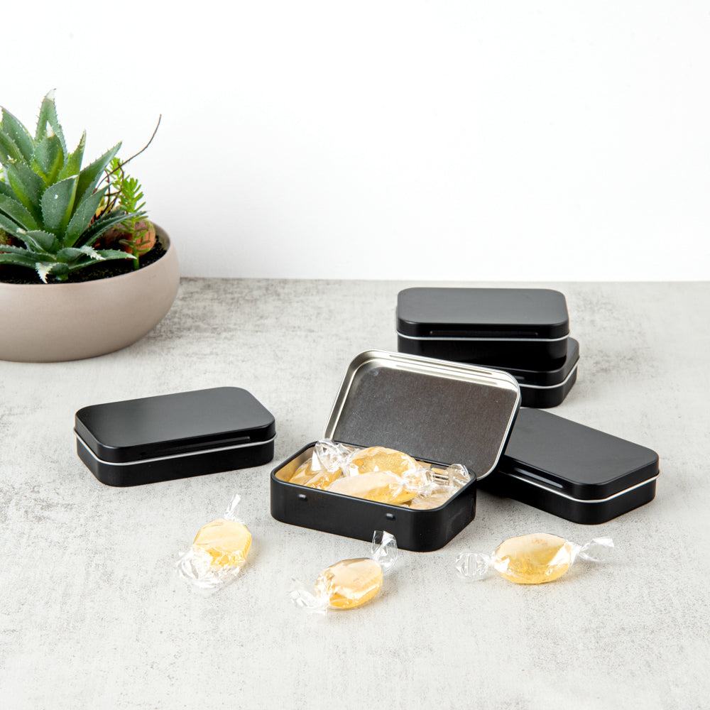 Take your tea bags everywhere you travel using our Chef 101 4-ounce Rectangle Black Tin Containers. Made of high-quality tinplate material, these tin storage containers are durable and virtually unbreakable. For easy opening and closing, these rectangular metal storage boxes come with hinged lids, avoiding the chances of losing the lids. Plus, these airtight tin boxes have press-on lids to secure the contents inside during transit. These tin storage boxes have smooth rounded edges, protecting your hands from any possible damage. With a sleek and compact design, these tin storage containers with lids are lightweight and can fit inside your handbags. These rectangular metal storage boxes come with a plain black finish, allowing you to label or decorate them according to your style. Measuring 3.75 inches in length by 2.25 inches in width, these storage tines with lids can hold up to 4 ounces. Sold in a 10 count box.