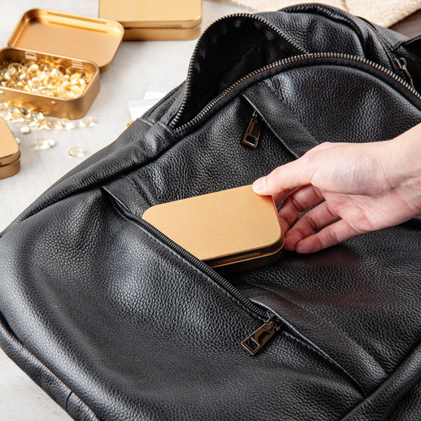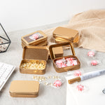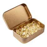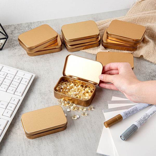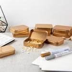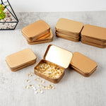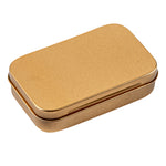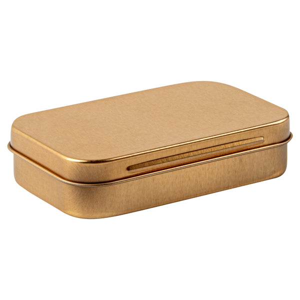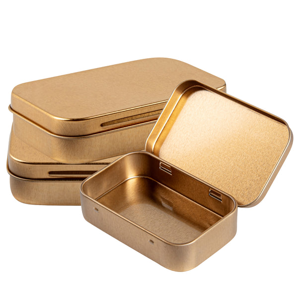 Always take your mints using our Chef 101 4-ounce Rectangle Gold Tin Containers. These metal storage boxes are made of durable tin material, allowing them to withstand rigorous use for a long time. These rectangular storage containers come with lids attached at the hinge, allowing you to easily open or close them. With the press-on mechanism, these metal storage containers with lids avoid leakage of the contents inside during transit. The round edges of these storage tins with lids provide a comfortable hold without hurting your hands. These tin storage boxes with lids are lightweight and come in a compact design, allowing you to fit them inside your bags easily. The classy gold finish of these rectangular tin boxes with hinged lids allows you to customize them. Each of these tin containers for storage measures 3.75 inches in length by 2.25 inches in width and holds up to 4 ounces. Sold in a 100 count box.