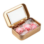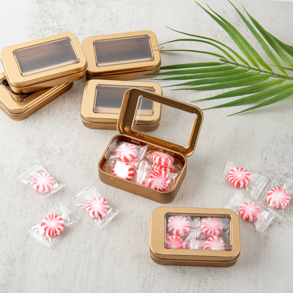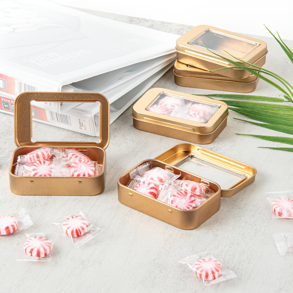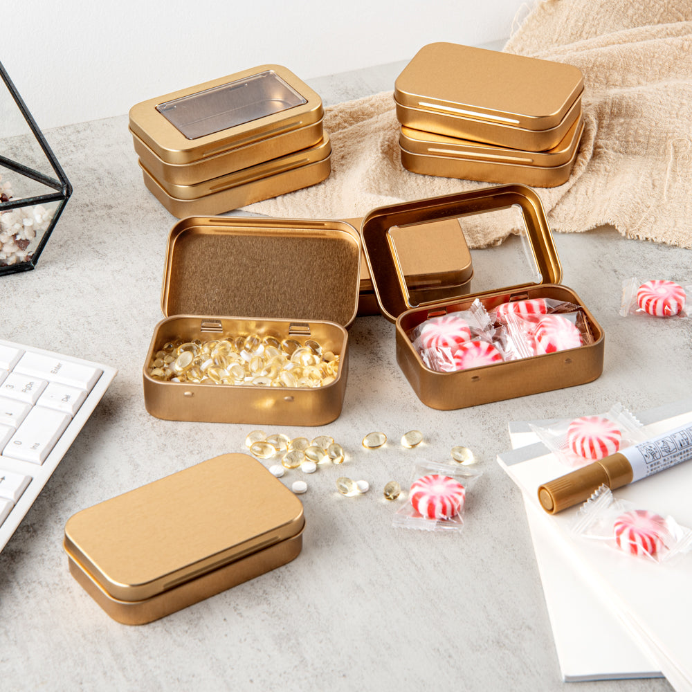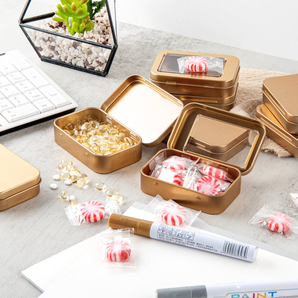Carry your tiny hairclips wherever you go using our Chef 101 4-ounce Rectangle Gold Tin Containers. These rectangular storage boxes are made of premium tin material, making them highly durable for efficient use. To avoid misplacing items, these metal storage boxes come with lids with a transparent PVC window that lets you see the contents inside, avoiding any package or delivery errors. With a press-on lid, these tin storage containers secure the contents during transit. The smooth edges of these tin containers for storage provide you with a comfortable hold while carrying them along. Manufactured to fit in all your bags, these rectangular metal storage containers have a slim and sleek structure. Plus, the plain gold finish of these airtight tin boxes lets you customize them with your DIY ideas. Each of these 4-ounce tin storage boxes measures 3.75 inches in length by 2.25 inches in width. Sold in a 100 count box.