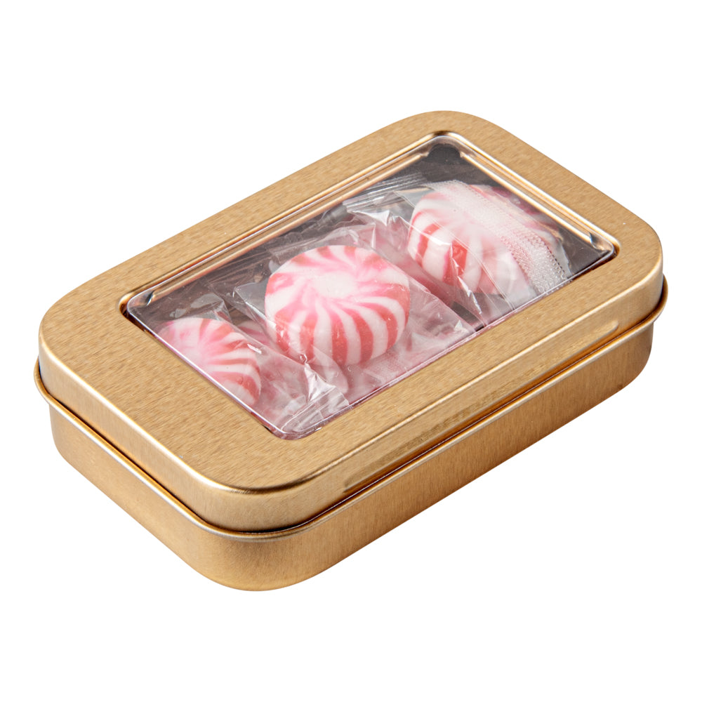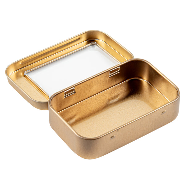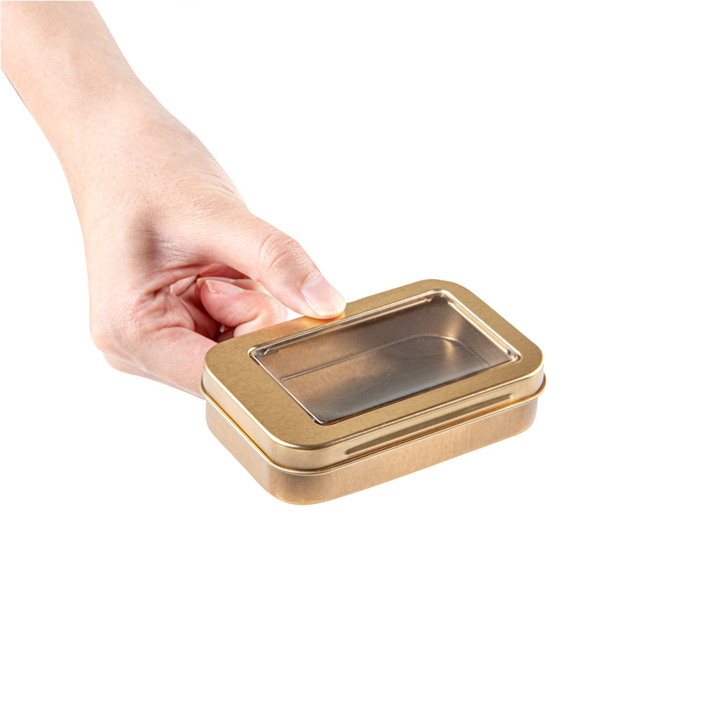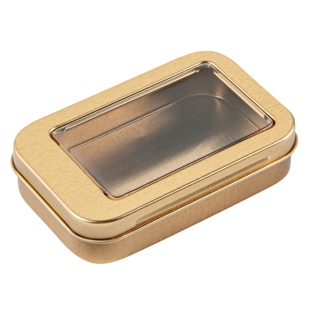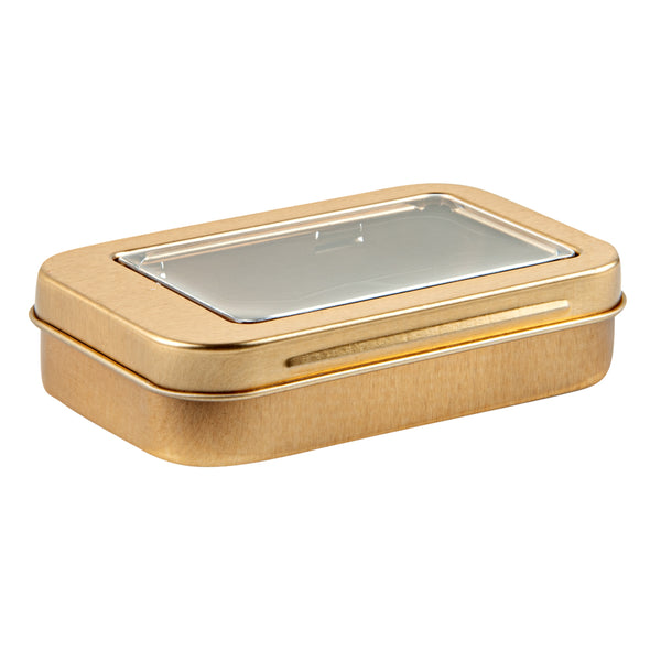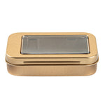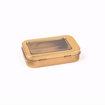 4 OZ RECTANGLE GOLD TIN CONTAINER - WITH WINDOW LID