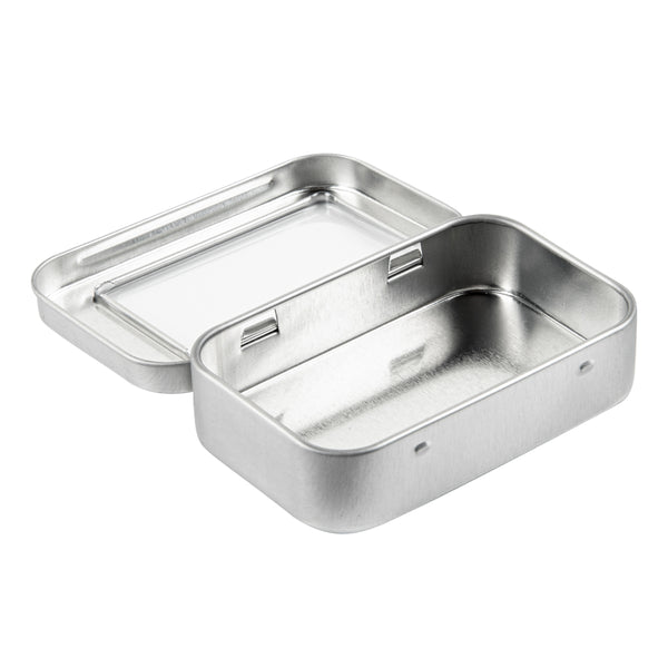Carry your mints everywhere using our Chef 101 4-ounce Rectangle Silver Tin Containers. These metal storage boxes are made of high-quality tinplate material, allowing them to withstand rigorous use for a long time. The press-on lids with the clear PVC window fit tightly to the body of these tin storage boxes, securing the contents inside while allowing you to see them too. With smooth, rounded edges, these metal storage containers protect your hand from accidental cuts. The sleek design of these rectangular storage tin boxes lets you carry them on the go or fit them comfortably in any of your bags. With a plain silver finish on the surface of these metal storage containers with lids, you can stick labels on them or tie ribbons for decoration. Measuring 3.75 inches in length by 2.25 inches in width, these storage tins with lids can hold up to 4 ounces. Sold in a 10 count box.