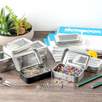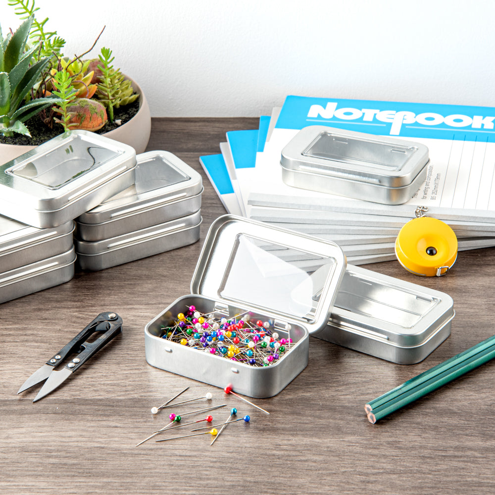Carry your mints everywhere using our Chef 101 4-ounce Rectangle Silver Tin Containers. These metal storage boxes are made of high-quality tinplate material, allowing them to withstand rigorous use for a long time. The press-on lids with the clear PVC window fit tightly to the body of these tin storage boxes, securing the contents inside while allowing you to see them too. With smooth, rounded edges, these metal storage containers protect your hand from accidental cuts. The sleek design of these rectangular storage tin boxes lets you carry them on the go or fit them comfortably in any of your bags. With a plain silver finish on the surface of these metal storage containers with lids, you can stick labels on them or tie ribbons for decoration. Measuring 3.75 inches in length by 2.25 inches in width, these storage tins with lids can hold up to 4 ounces. Sold in a 100 count box.