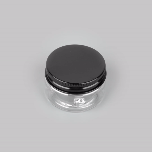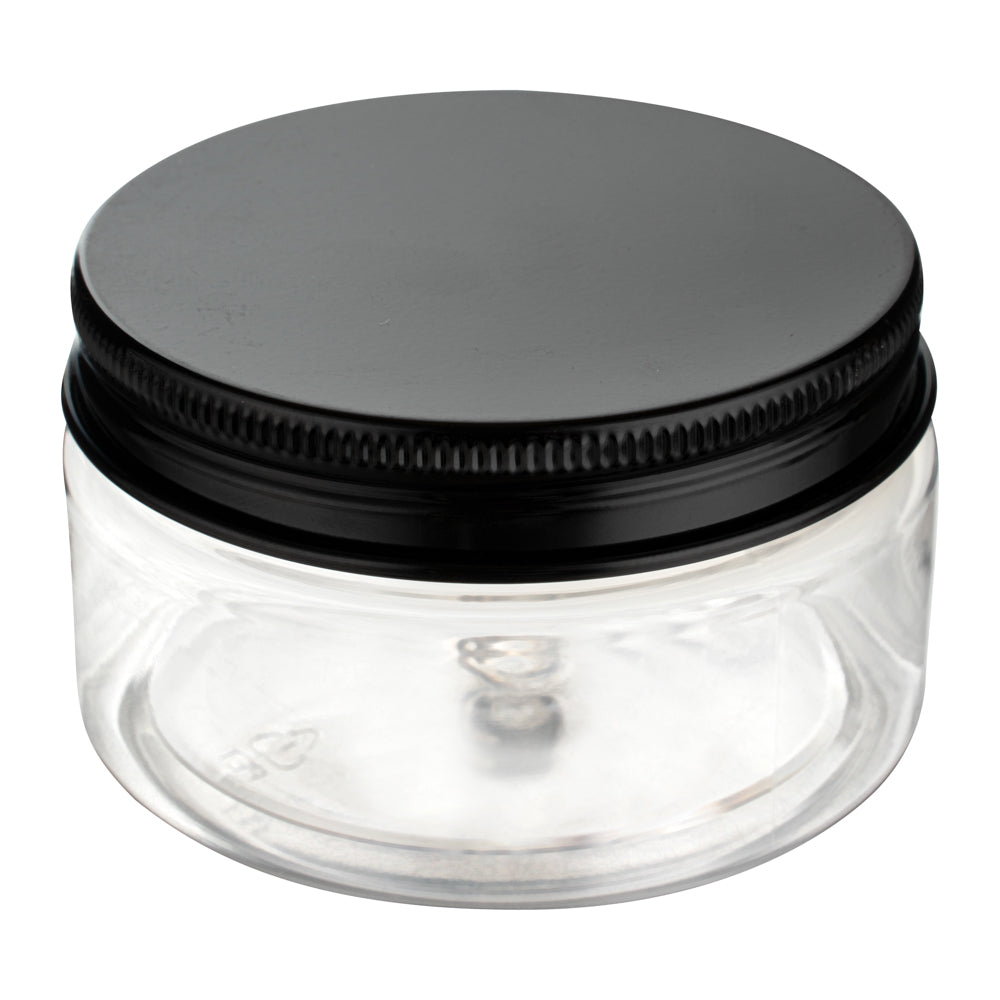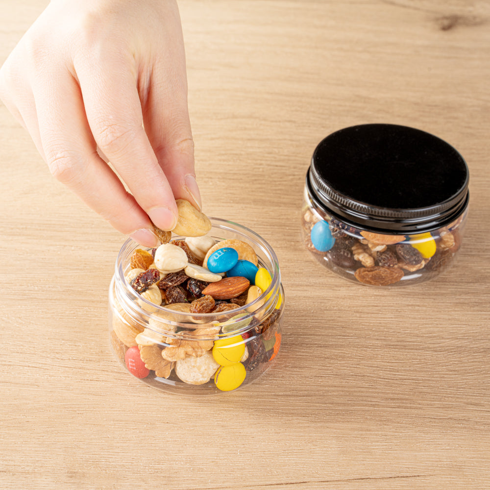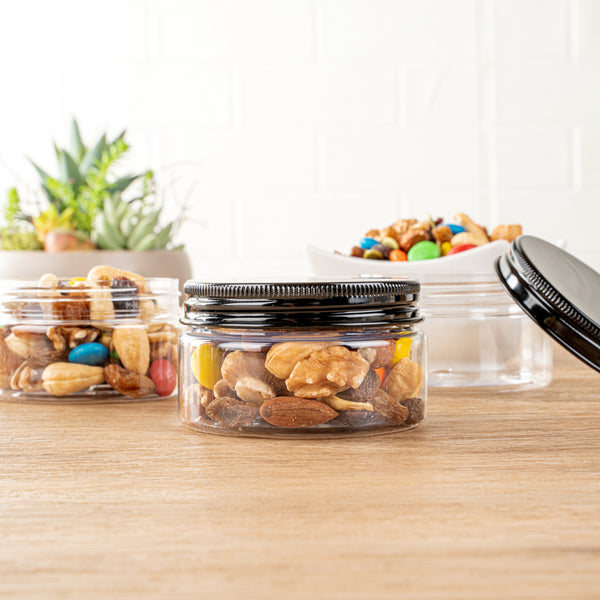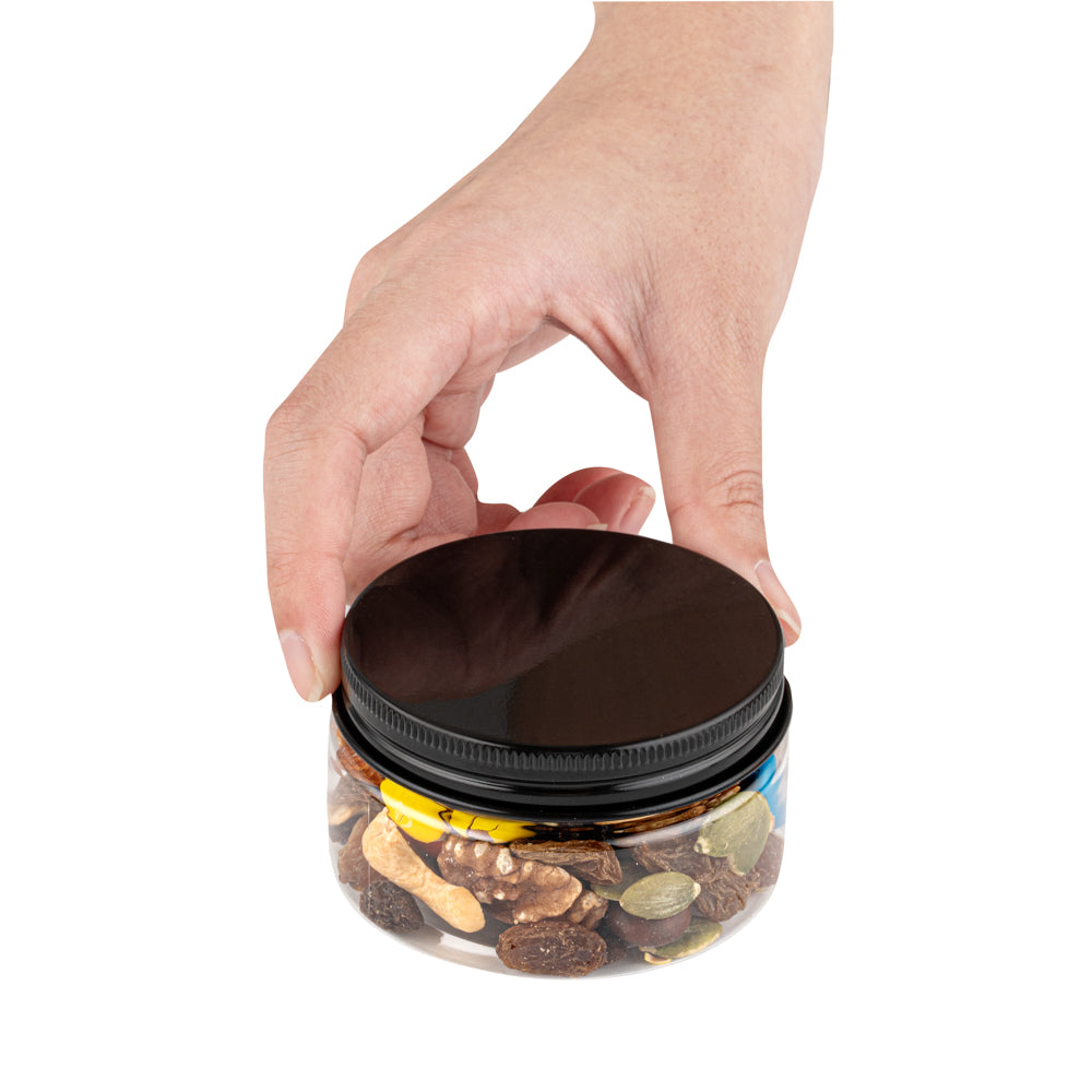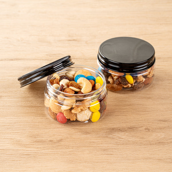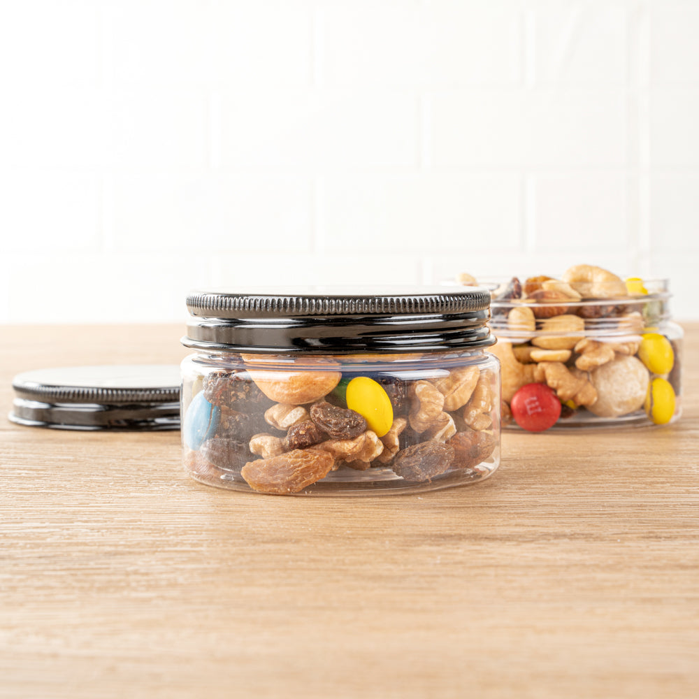 4 OZ ROUND CLEAR PLASTIC CANDY AND SNACK JAR - WITH BLACK ALUMINUM LID