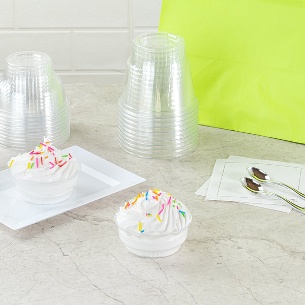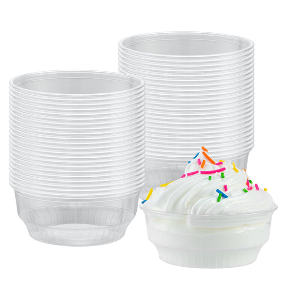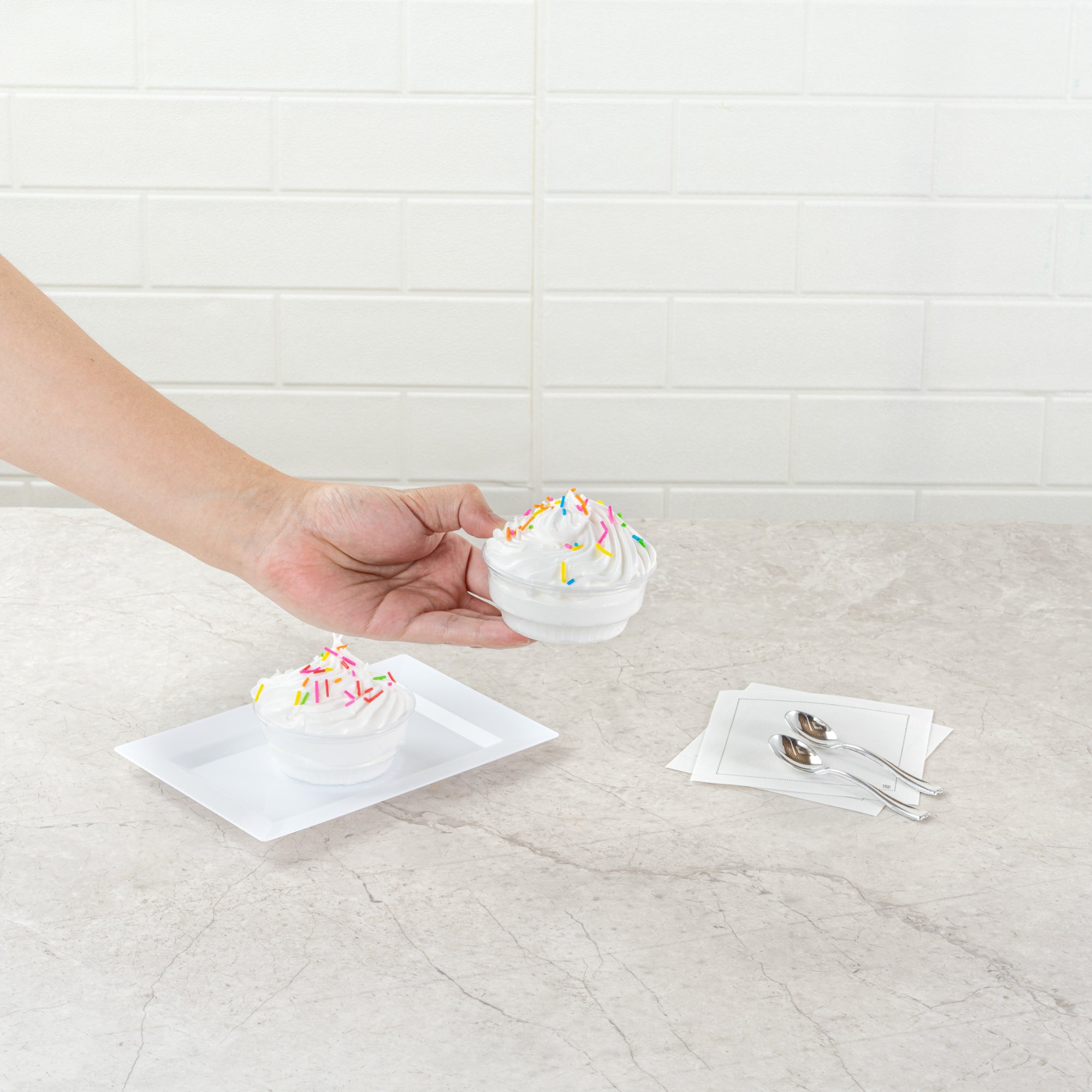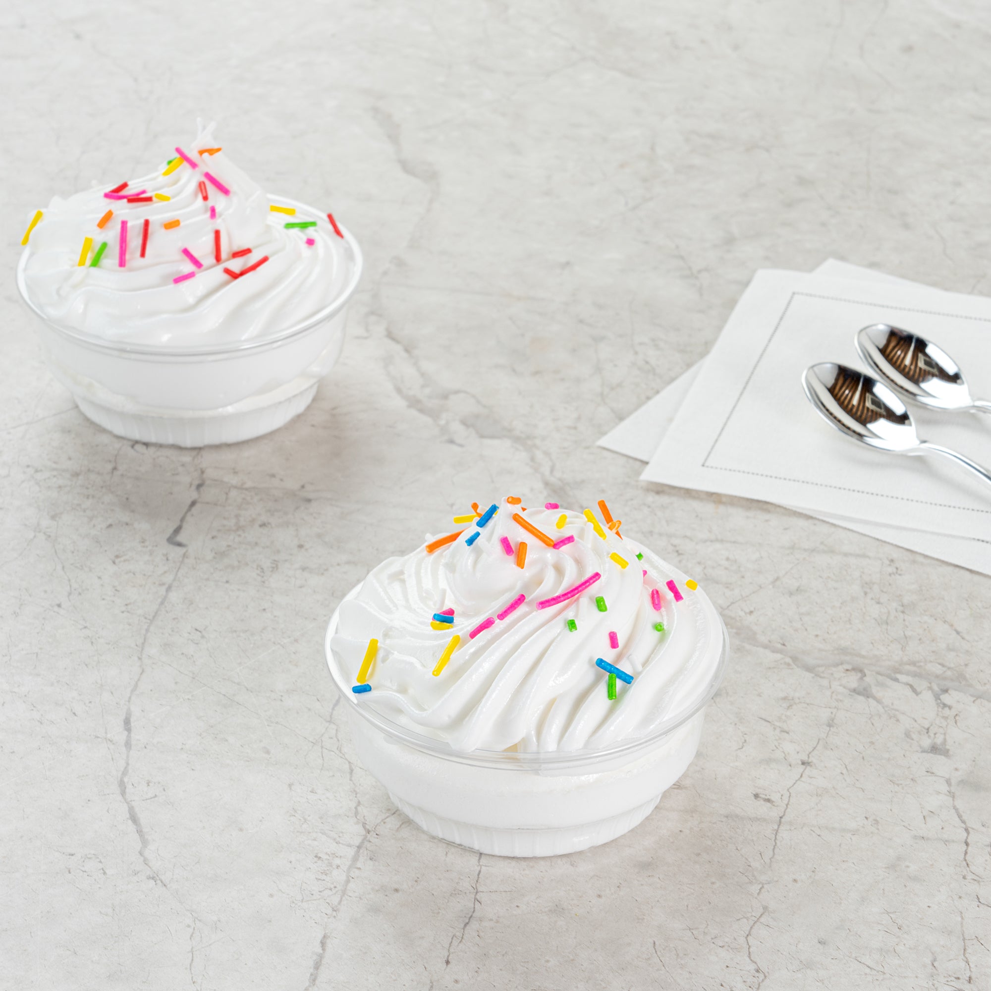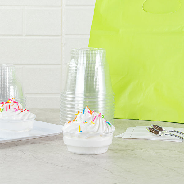 Elevate your dessert presentation with our Chef 101 4-ounce Round Clear Plastic Dessert Cups. These plastic dessert cups are designed with a tapered bottom for added stability and aesthetic appeal to serve various sweet treats. The clear finish of these parfait cups helps identify their contents quickly and elegantly showcases your delectable creations, inviting guests to indulge in every delightful layer. Made from PET plastic, these dessert cups are durable and crack-resistant, ideal for serving ice cream or puddings at ice cream parlors and concession stands. These pudding cups are recyclable and suitable for environmentally-friendly foodservice establishments. For an efficient post-meal cleanup, these disposable dessert cups can be discarded after use. Measuring 3.25 inches in diameter by 1.5 inches in height, these ice cream cups can hold up to 4 ounces, providing ample space for your delicious treats. Sold in a 50 count box.