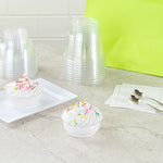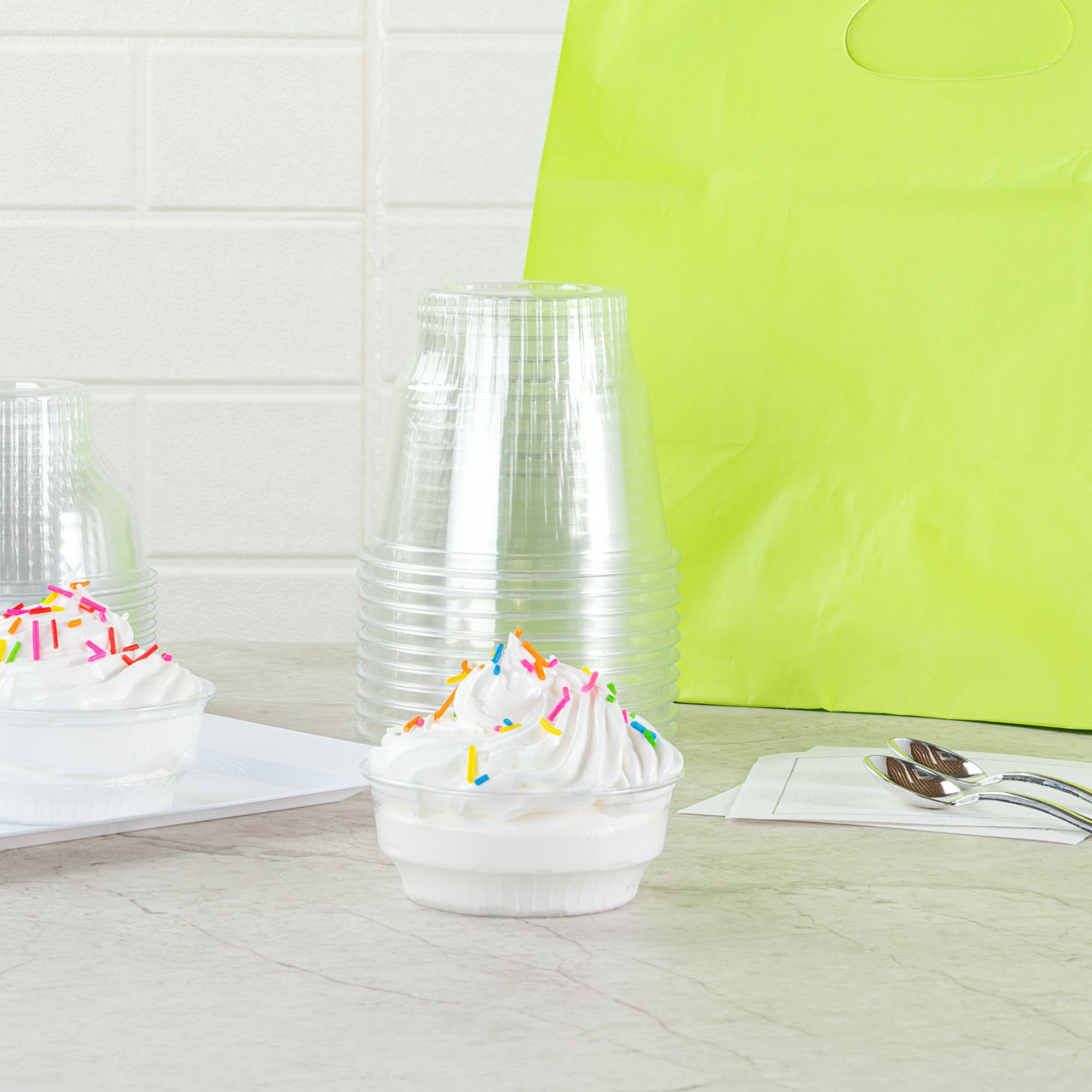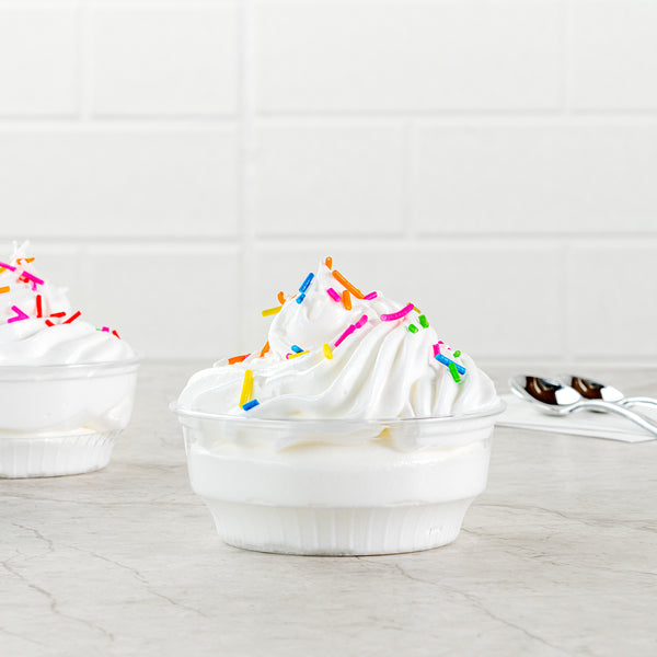 Showcase your delectable desserts effortlessly with these Chef 101 4 oz Round Clear Plastic Dessert Cups. The clear form of these plastic dessert cups allows for fast identification of contents, ensuring efficient service in bustling environments. Their durable, crack-resistant construction makes them ideal for high-traffic areas, providing a reliable serving solution for busy ice cream parlors and dessert shops. These clear ice cream cups are freezer-safe, allowing you to conveniently store frozen treats without compromising quality. Made from recyclable plastic, they present a sustainable and dependable alternative to traditional paper and foam options, aligning with eco-conscious values. With a compact size of 3.15 inches by 3.15 inches and a height of 1.39 inches, these disposable yogurt cups are perfect for sample or child-sized portions, enhancing your presentation while maintaining portion control. Sold in a 500 count box.