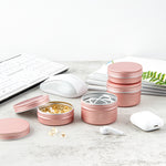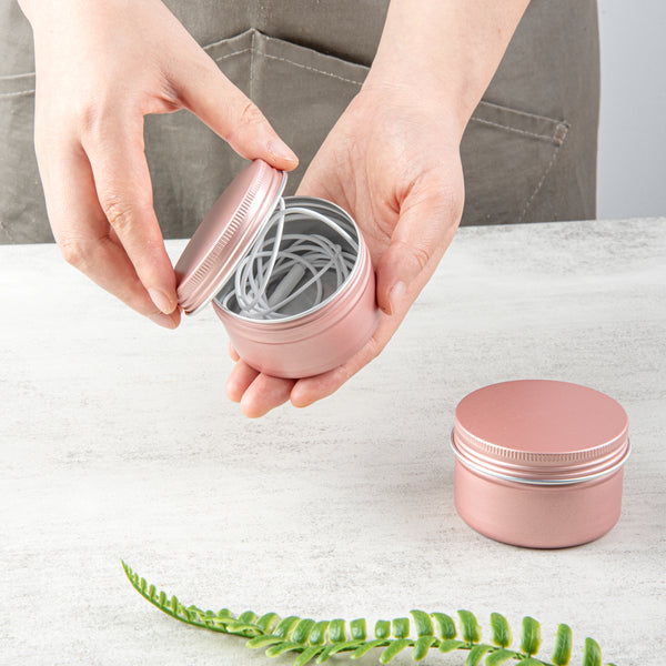 Store your tea leaves using our Chef 101 4-ounce Round Rose Gold Tin Containers. The premium construction of these aluminum storage boxes allows them to stay durable without bending or breaking. To avoid accidental leakage, these decorative storage boxes come with screwable lids that tightly seal the containers. These airtight containers are manufactured to save storage space, as they come in a compact structure. The beautiful rose gold finish of these containers for storage allows you to customize them using labels or stickers. With a 4-ounce capacity, each of these round aluminum boxes for storage measures 2.75 inches in diameter by 1.75 inches in height and can fit small clips, mints, coins, or candies. Sold in a 10 count box.
