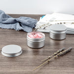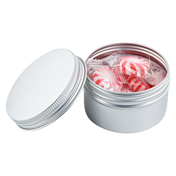 Carry your face creams for your vacation using our Chef 101 4-ounce Round Silver Tin Containers. The durable aluminum construction of these decorative storage boxes allows them to be used for a long time without rusting or breaking easily. These round storage containers have airtight lids that are screwable, allowing you to easily open and close the boxes to access the contents inside. Conveniently carry these aluminum boxes for storage wherever you go or use them to store spices in your kitchen, as they are compact and don't take up much space. The silver finish of these metal storage containers allows you to label them for identification without having to open the boxes. Measuring 2.75 inches in diameter by 1.75 inches in height, these round storage boxes can hold up to 4 ounces. Sold in a 10 count box.