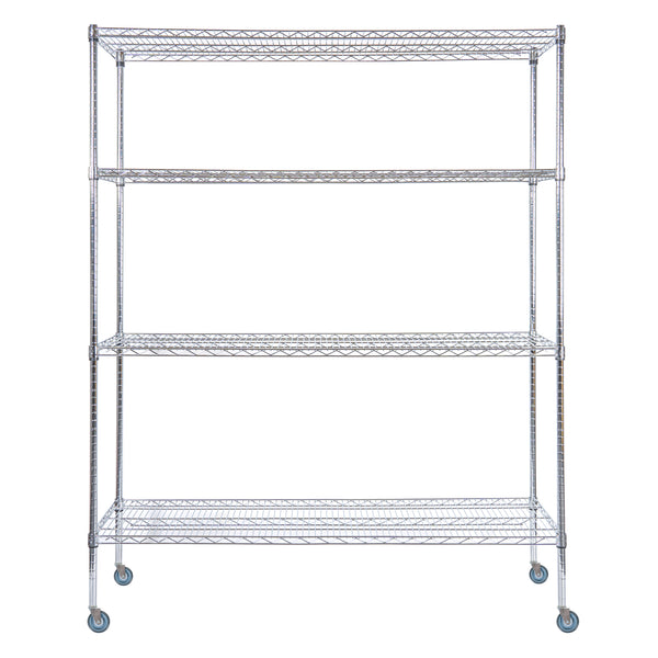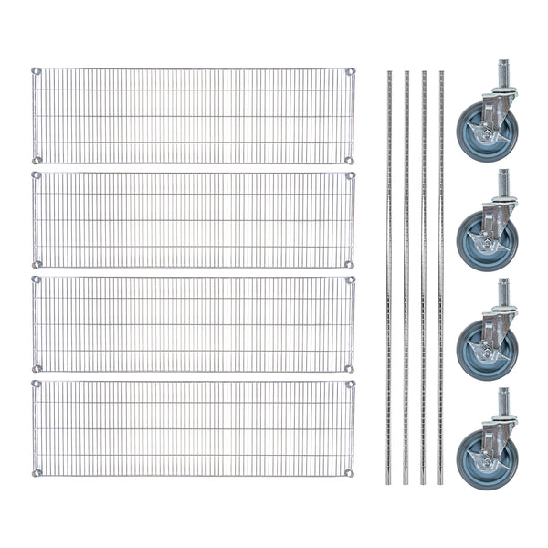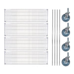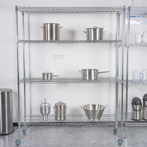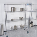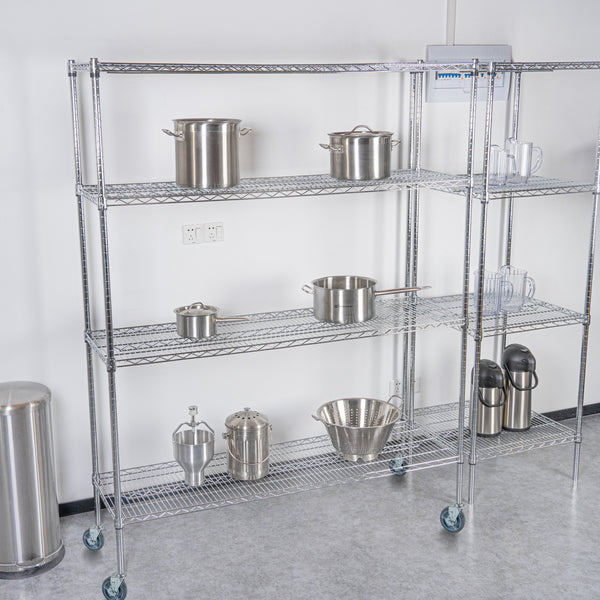 Improve your storage solutions with the Chef 101 4-Tier NSF Chrome Shelving Unit. Made from durable steel, each shelf can support up to 450 pounds, offering a sturdy storage solution. The chrome plating provides corrosion protection, ideal for dry spaces such as garages and storerooms. With vertical ribs to enhance stability, these shelves keep the unit from tipping over. The vented design promotes air circulation, reducing dust accumulation. For height adjustments of the shelves, the kit includes posts and 32 split sleeves. The kit features casters, making the shelves mobile for easy item movement. Each shelf measures 18 inches in width by 60 inches in length by 1.5 inches in height, while the posts are 74 inches tall. The casters measure 5 inches in diameter. Each order includes 4 shelves, 4 posts, and 4 casters.