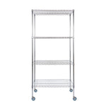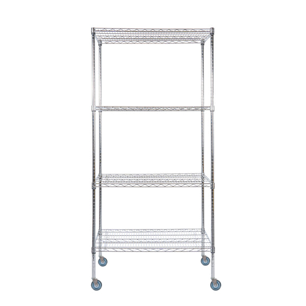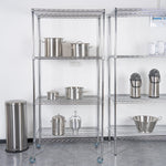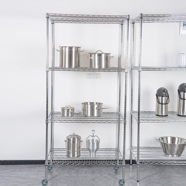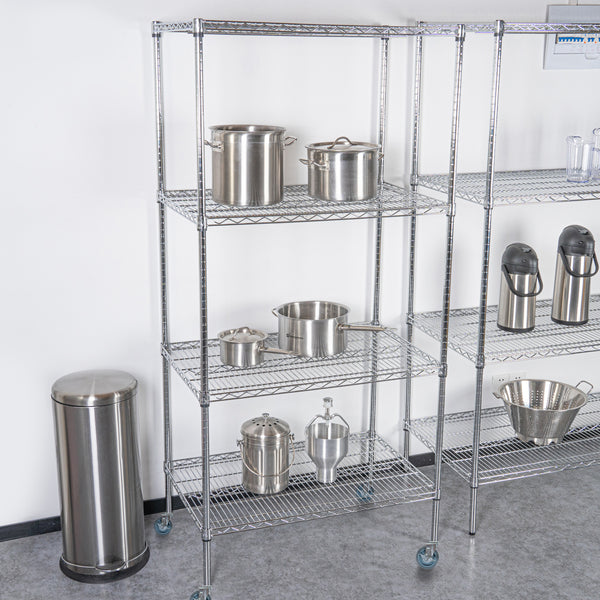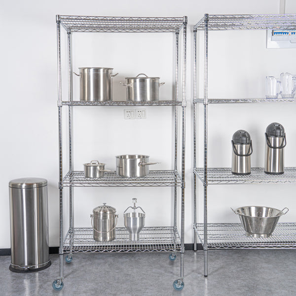Maximize your organization with our Chef 101 4-Tier NSF Chrome Shelving Unit. Built from high-quality steel, each shelf can support up to 600 pounds, providing a durable storage solution. The chrome plating of this shelving kit shields against corrosion, perfect for dry areas such as garages and storerooms. Featuring vertical ribs, this mobile shelving unit adds stability to prevent tipping over. The vented design of this rolling shelving kit allows air to circulate, keeping dust build-up to a minimum. With posts and 32 split sleeves, you can adjust the shelf heights to your preference. The included casters make the shelves mobile, so you can easily move items around. Each shelf measures 24 inches in width by 36 inches in length by 1.5 inches in height, while the posts are 74 inches tall. The casters measure 5 inches in diameter. Each order includes 4 shelves, 4 posts, and 4 casters.