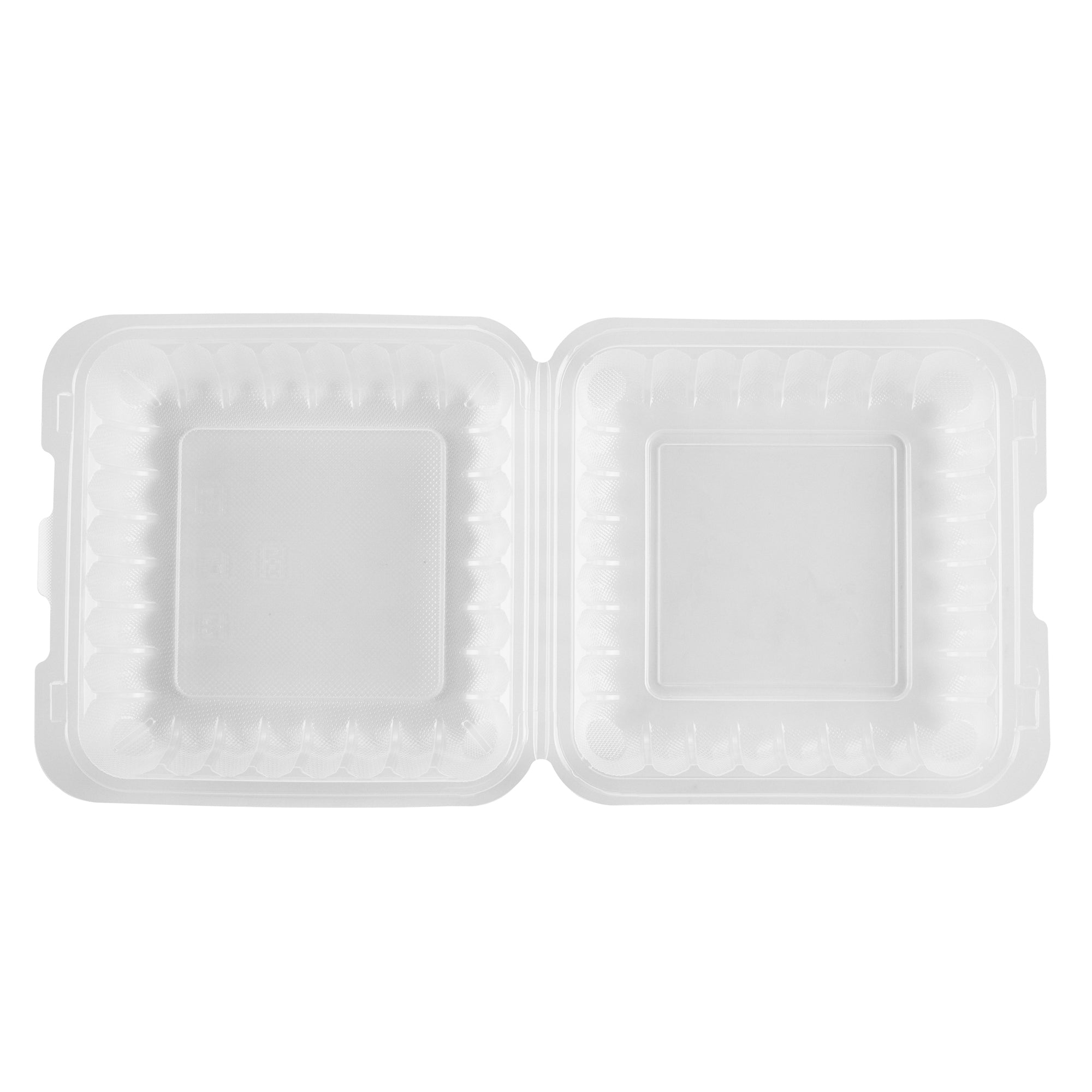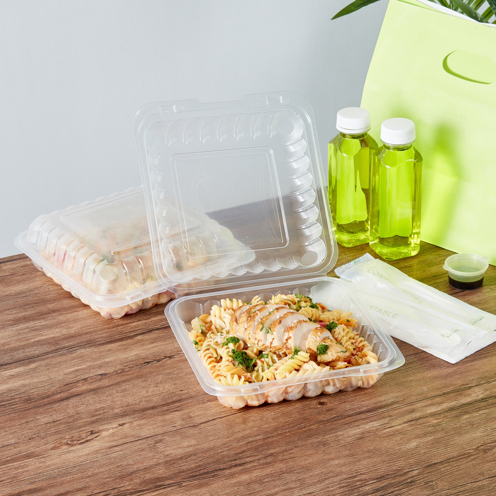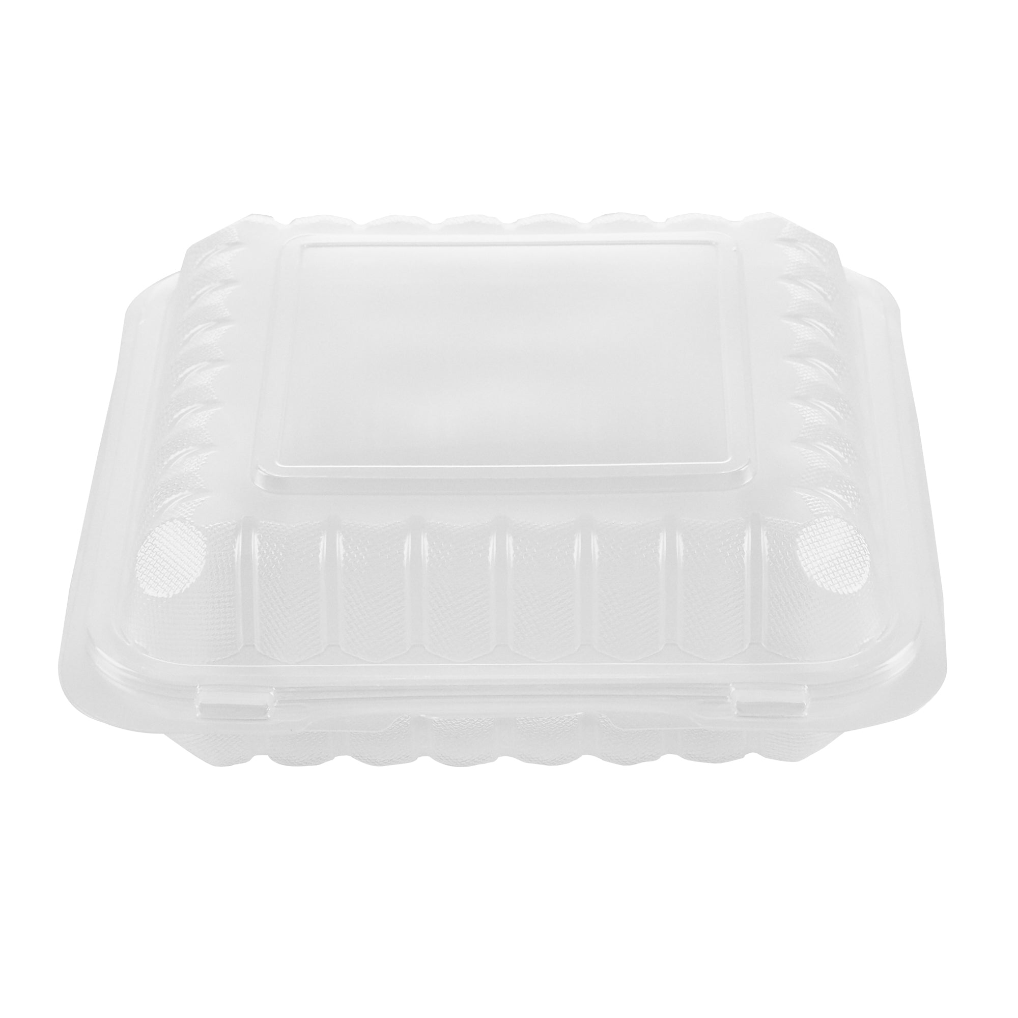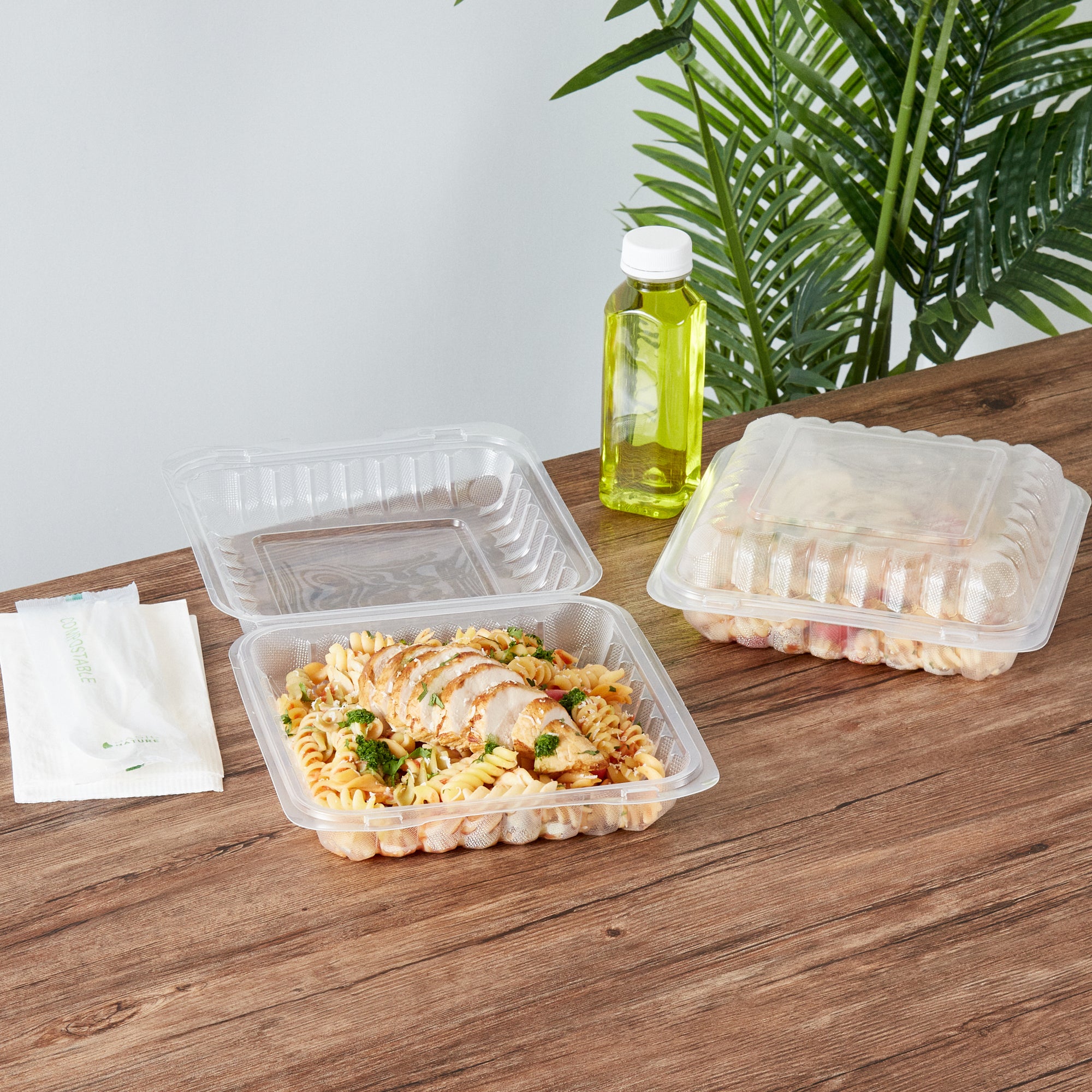 Pack yummy sandwiches with our Chef 101 40-ounce Square Clear Plastic Clamshell Containers. For maximum convenience, these to go containers are microwave-safe, enabling customers to heat their meals effortlessly. Featuring a built-in hinged lid, these to go boxes form a secure seal, providing a secure seal for a mess-free take out solution. The clear finish of these take out containers expertly showcases the contents, making them perfect for displaying your culinary creations. Crafted from durable plastic, these clamshell containers are ideal for serving both hot and cold dishes. For added versatility, these carry out containers are freezer-safe, making them perfect for storing leftovers. These take out boxes are disposable and can be discarded after use, offering the convenience of easy cleanup after use. To offer an environmentally-friendly food serving container, these plastic take out containers are recyclable and help minimize carbon footprint. Measuring 9 inches in length by 9 inches in width by 3 inches in height, these takeaway containers have a generous capacity of 40 ounces. Sold in a 50 count box.