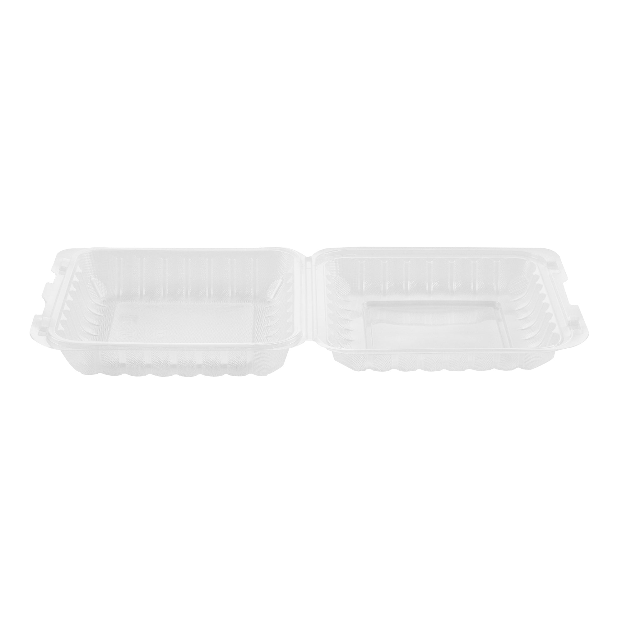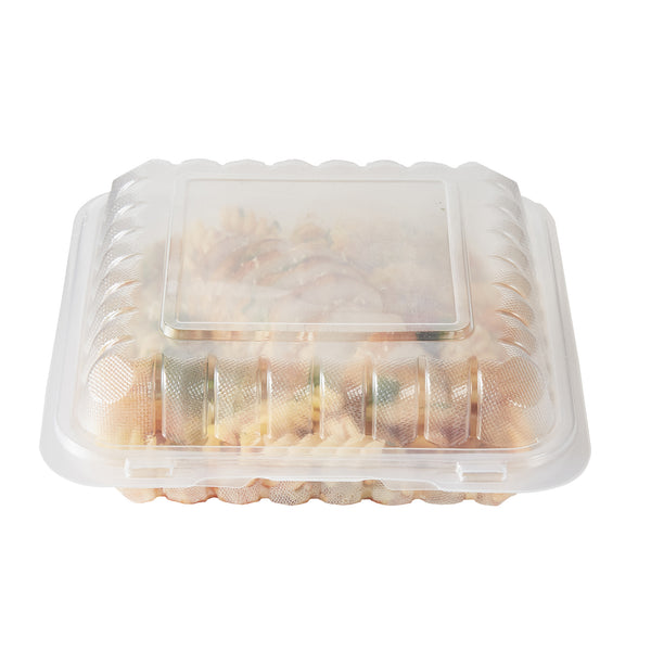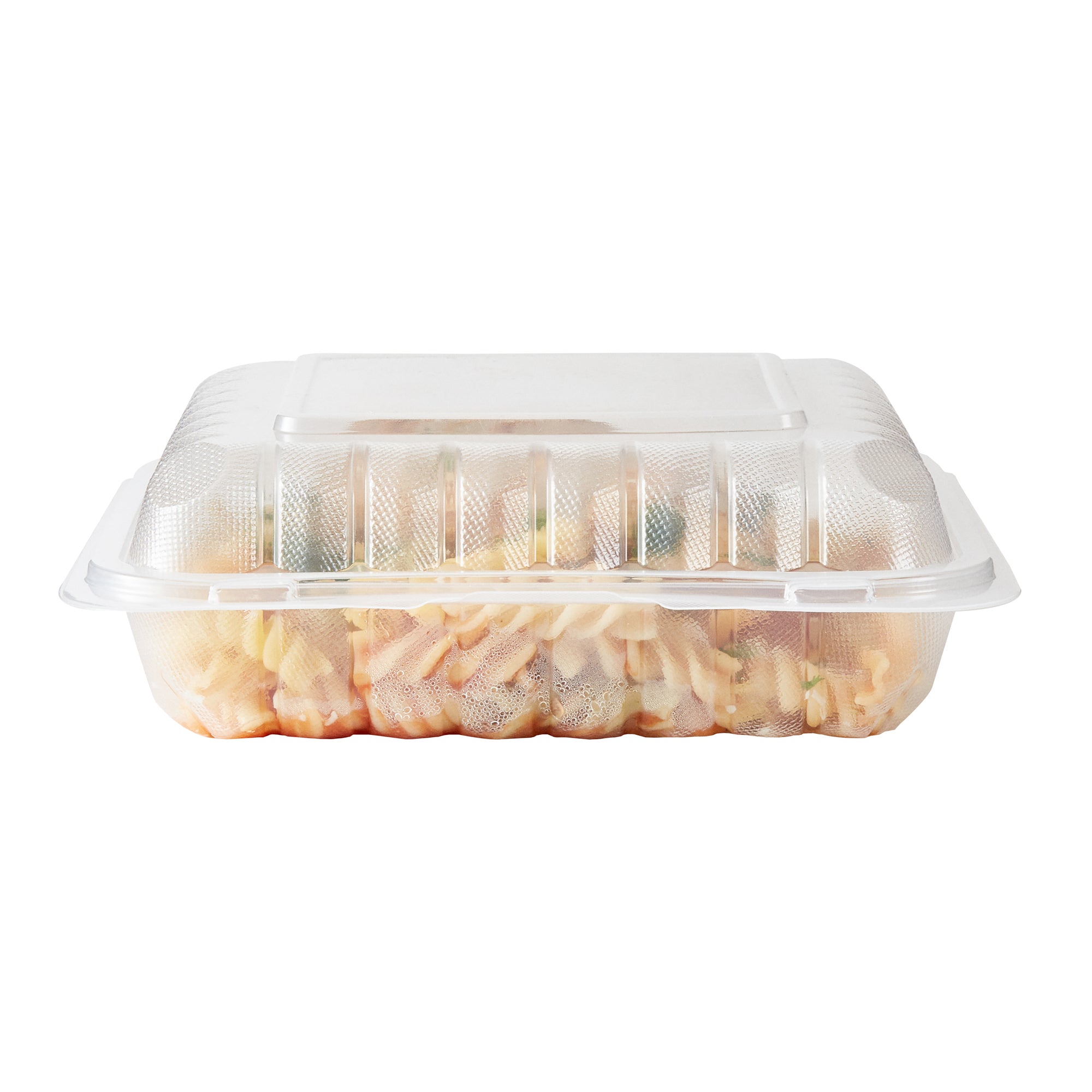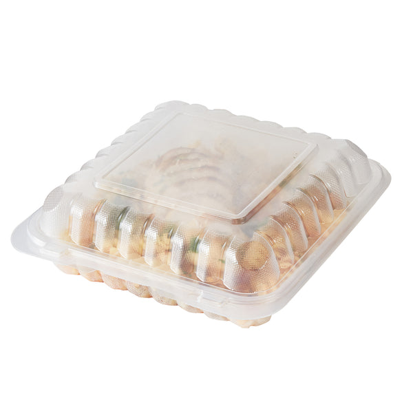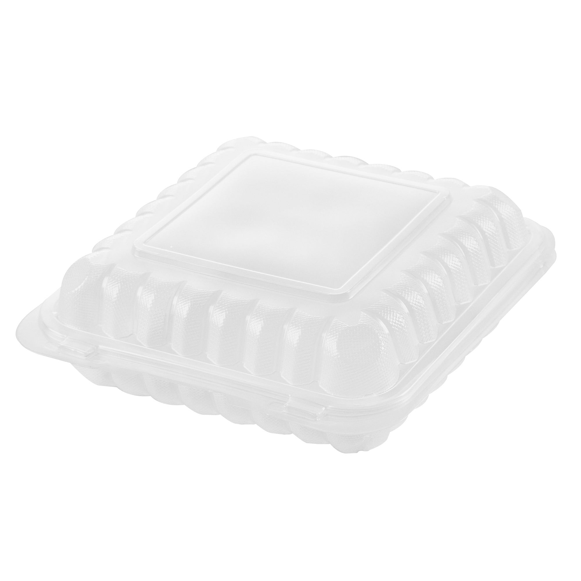 Pack yummy sandwiches with our Chef 101 40-ounce Square Clear Plastic Clamshell Containers. For maximum convenience, these to go containers are microwave-safe, enabling customers to heat their meals effortlessly. Featuring a built-in hinged lid, these to go boxes form a secure seal, providing a secure seal for a mess-free take out solution. The clear finish of these take out containers expertly showcases the contents, making them perfect for displaying your culinary creations. Crafted from durable plastic, these clamshell containers are ideal for serving both hot and cold dishes. For added versatility, these carry out containers are freezer-safe, making them perfect for storing leftovers. These take out boxes are disposable and can be discarded after use, offering the convenience of easy cleanup after use. To offer an environmentally-friendly food serving container, these plastic take out containers are recyclable and help minimize carbon footprint. Measuring 9 inches in length by 9 inches in width by 3 inches in height, these takeaway containers have a generous capacity of 40 ounces. Sold in a 50 count box.
