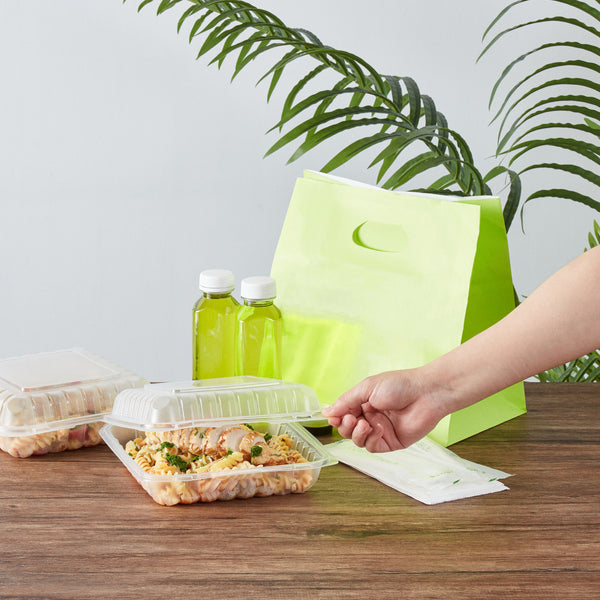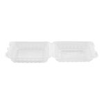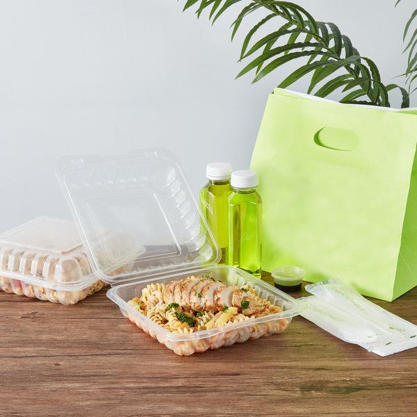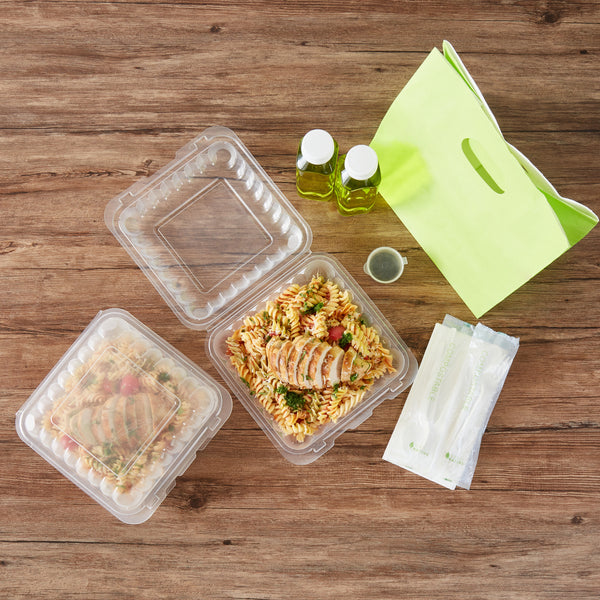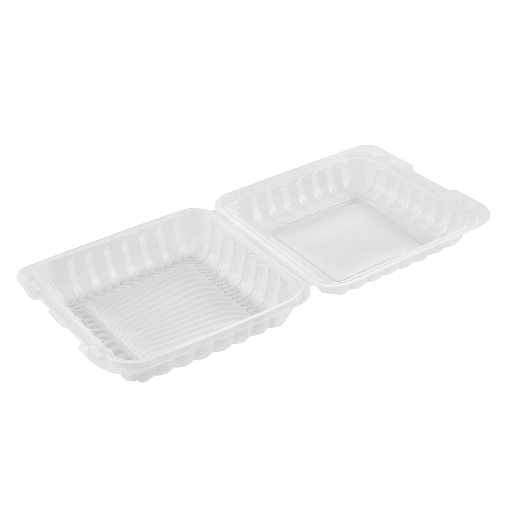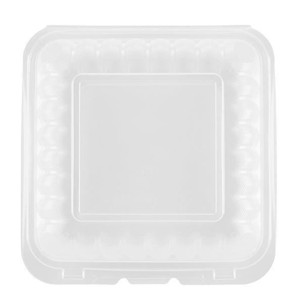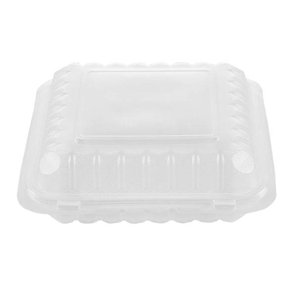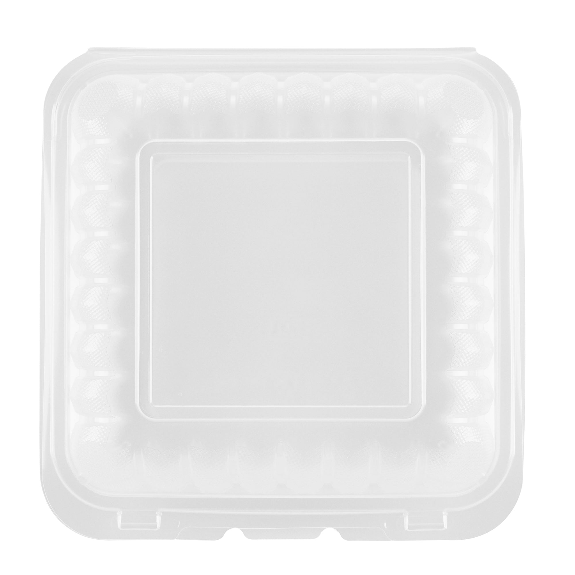 Pack yummy sandwiches with our Chef 101 40-ounce Square Clear Plastic Clamshell Containers. For maximum convenience, these to go containers are microwave-safe, enabling customers to heat their meals effortlessly. Featuring a built-in hinged lid, these to go boxes form a secure seal, providing a secure seal for a mess-free take out solution. The clear finish of these take out containers expertly showcases the contents, making them perfect for displaying your culinary creations. Crafted from durable plastic, these clamshell containers are ideal for serving both hot and cold dishes. For added versatility, these carry out containers are freezer-safe, making them perfect for storing leftovers. These take out boxes are disposable and can be discarded after use, offering the convenience of easy cleanup after use. To offer an environmentally-friendly food serving container, these plastic take out containers are recyclable and help minimize carbon footprint. Measuring 9 inches in length by 9 inches in width by 3 inches in height, these takeaway containers have a generous capacity of 40 ounces. Sold in a 50 count box.