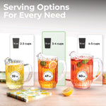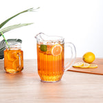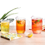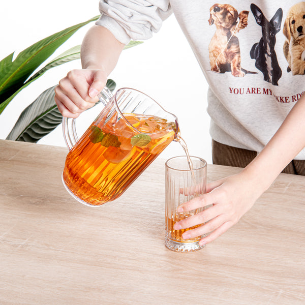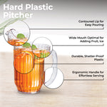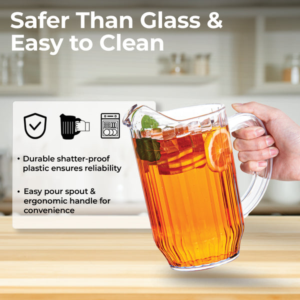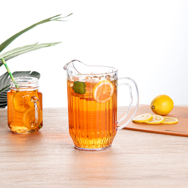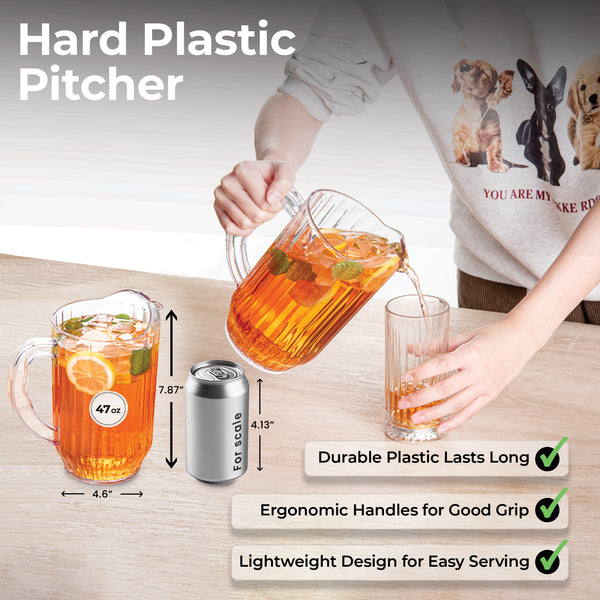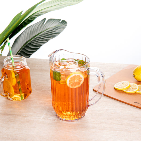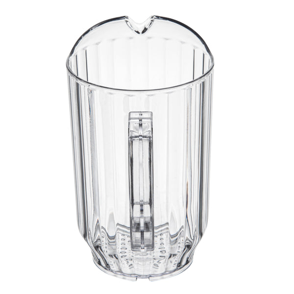 Refill guests' drinks with ease using this Chef 101 47-ounce Clear Plastic Water Pitcher. Featuring a specially designed ergonomic handle, this plastic drink pitcher has molded indents that provide a comfortable and reliable way to transport your beverages. The easy-to-grip handle provides added control to limit spills or accidents, while the deeply contoured lip makes it easy to pour beverages while preventing ice cubes from creating splashes. Manufactured from incredibly durable and lightweight plastic, this restaurant water pitcher is designed to withstand daily use in fast-paced restaurants and bars. This 47-ounce water pitcher features a crystal clear construction and classic ribbed design that allows you to stylishly showcase your beverages inside. This premium plastic pitcher measures 4.6 inches in diameter by 7.87 inches in height and has a total capacity of 47 ounces, ideal for serving water, iced tea, beer, sangria, and other refreshing beverages. Sold in a 1 count box.