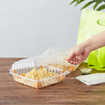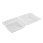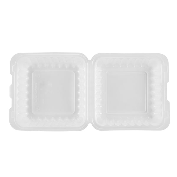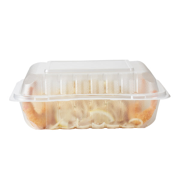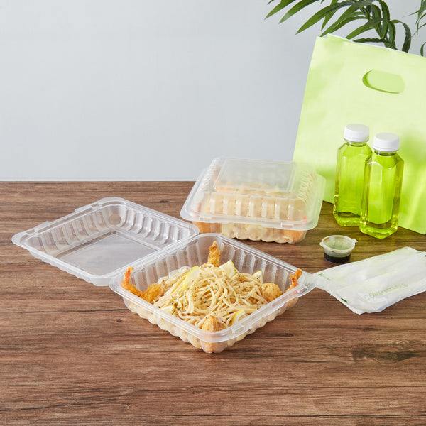 Elevate your food packaging game with our Chef 101 47-ounce Square Clear Plastic Clamshell Containers. These takeaway boxes are microwave-safe for maximum convenience, enabling customers to heat their meals easily. Designed with a built-in hinged lid, these take out boxes form a secure seal to ensure a mess-free take out solution. These take out containers have a clear finish and are perfect for showcasing food items. Crafted from durable plastic, these clamshell containers are perfect for serving hot and cold dishes. To store your leftovers, these takeaway containers are freezer-safe, providing versatile storage options. These carry out containers are disposable and can be discarded after use, offering an easy cleanup process. Perfect for eco-conscious foodservice establishments, these disposable food containers are recyclable. These to go boxes have a capacity of 47 ounces and measure 9 inches in length by 9 inches in width by 3.5 inches in height. Sold in a 50 count box.