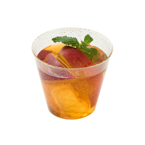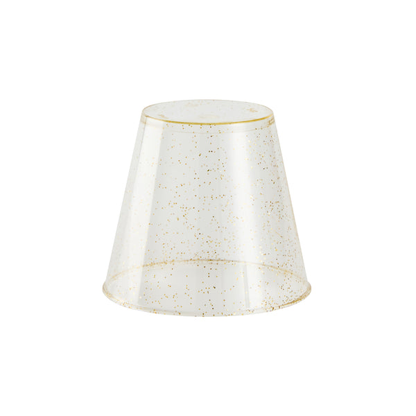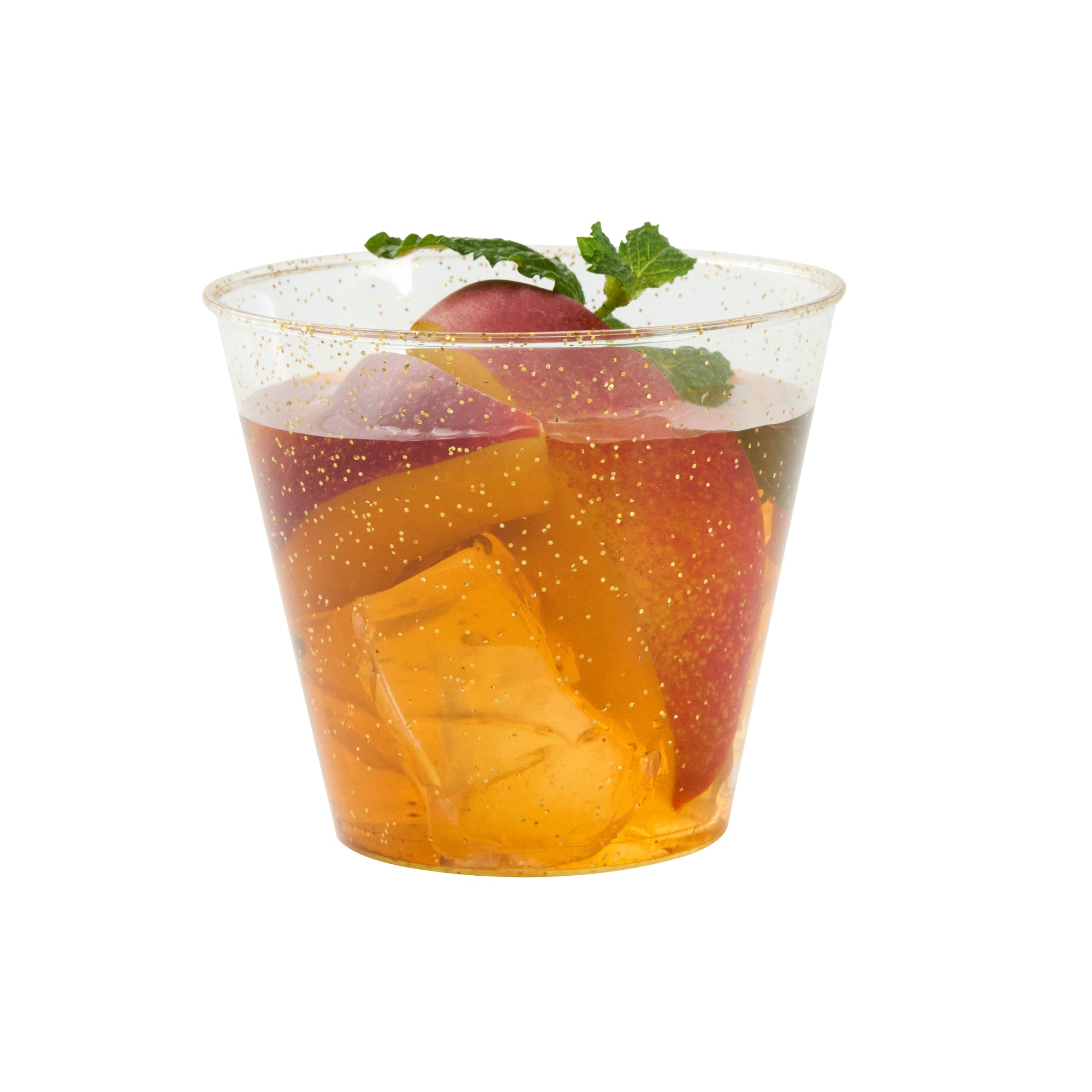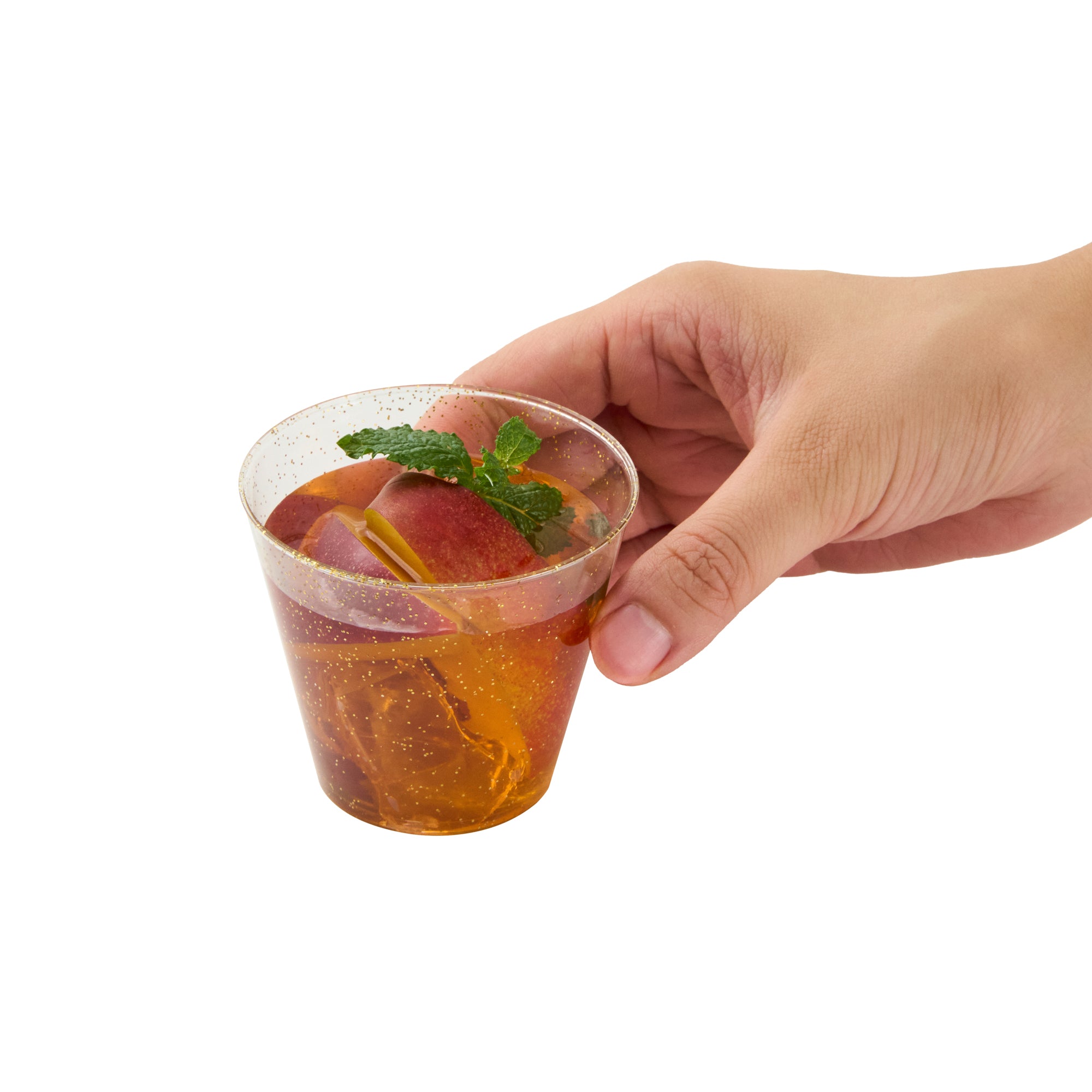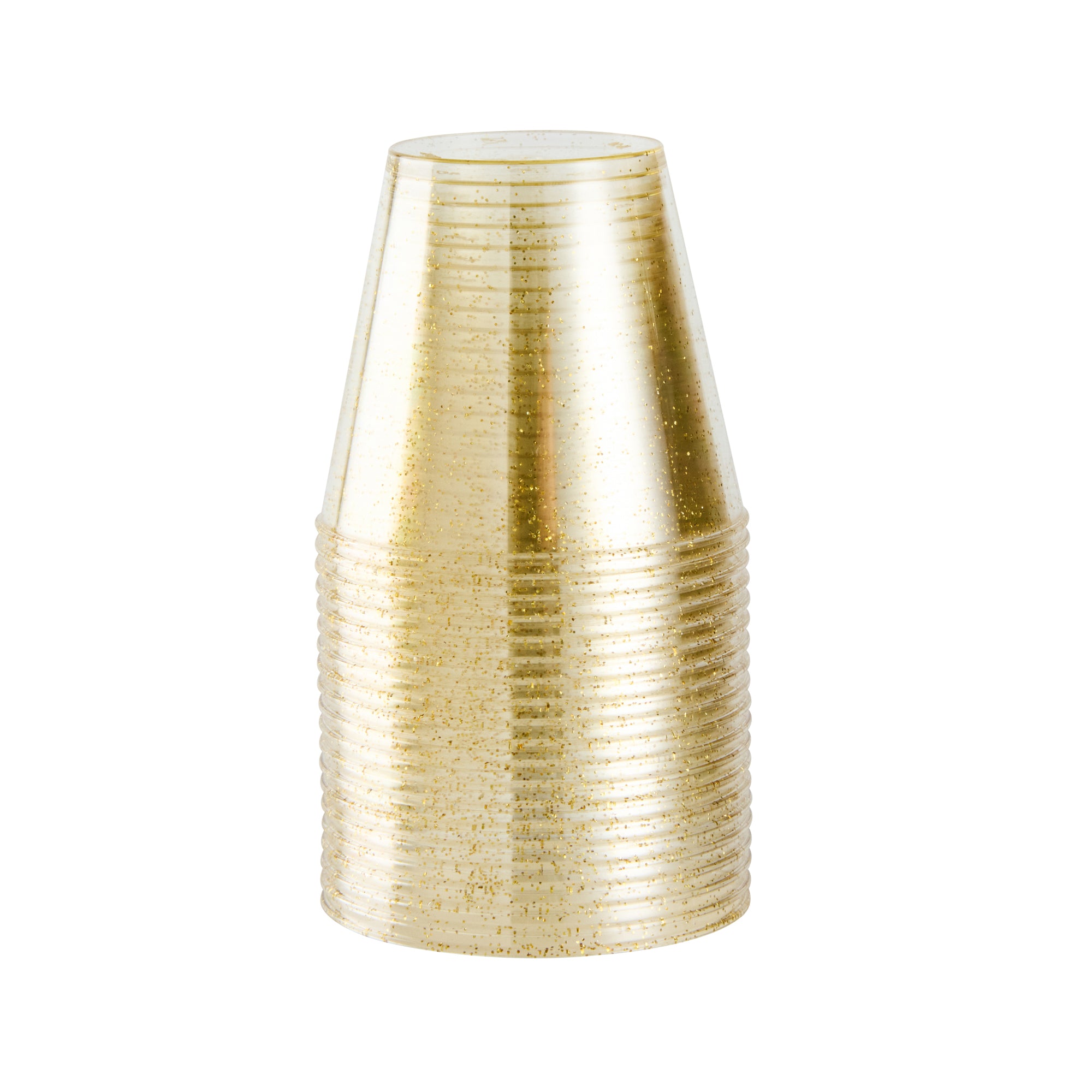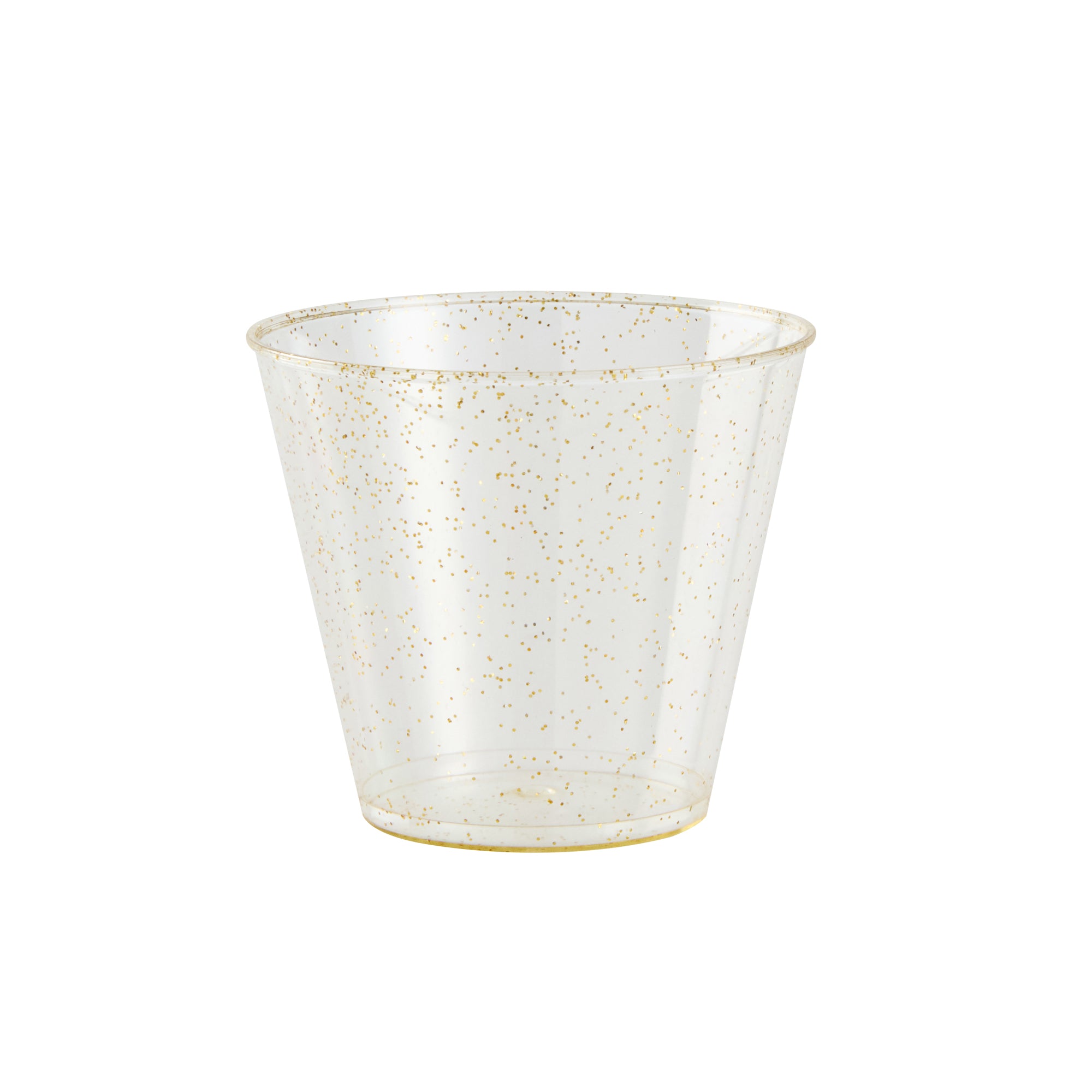 Add sparkle to your events with our Chef 101 5-ounce Gold Glitter Plastic Tumblers. With these party cups, highlight the elegance of gold glitter to elevate the aesthetics of any table setting at festive occasions. Made of hard and durable PS plastic, these glitter plastic cups can be used at weddings, birthdays, and more. These plastic glasses are cold food-friendly and ideal for chill beverages. The recyclable nature of these cocktail cups ensures a quick and sustainable cleanup, allowing you to effortlessly maintain an eco-conscious environment. Turn every occasion into a chic affair with these dazzling glasses that are disposable, providing an easy cleanup solution. At 2.8 inches in diameter and 2.3 inches in height, these 5-ounce gold plastic tumblers offer a compact size. Sold in a 20 count box.