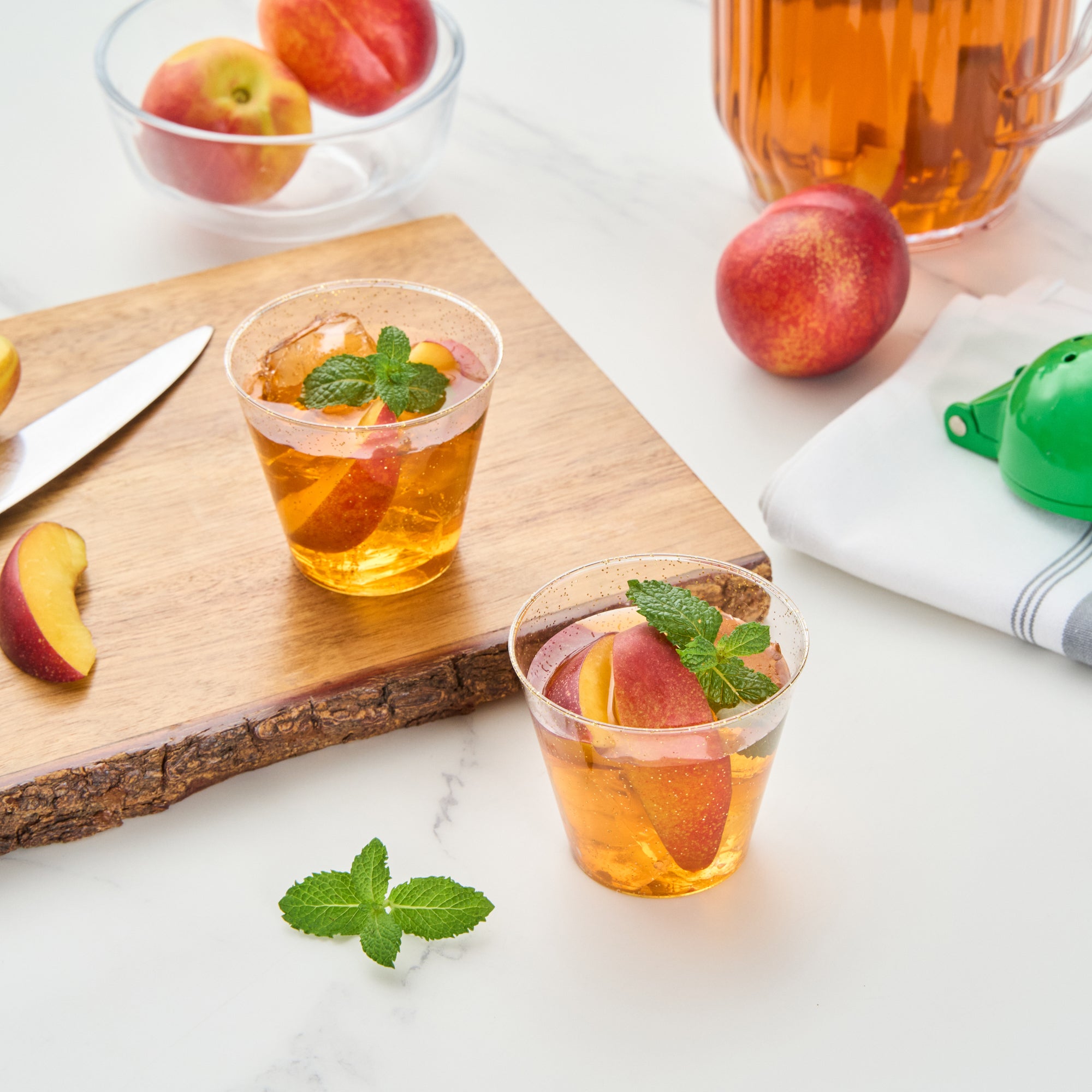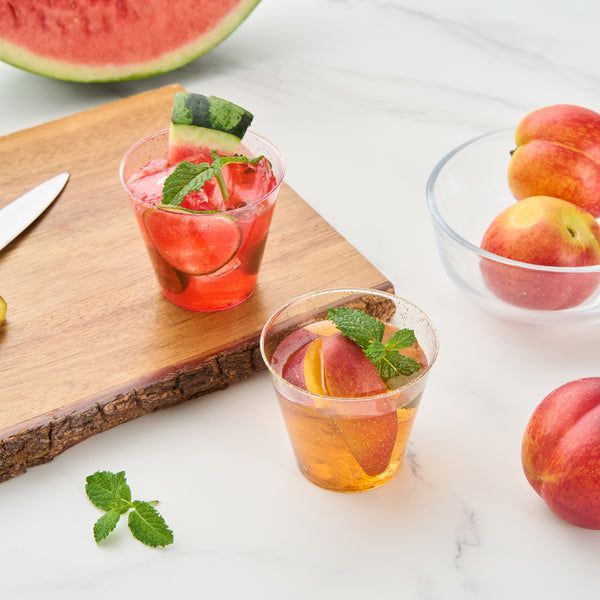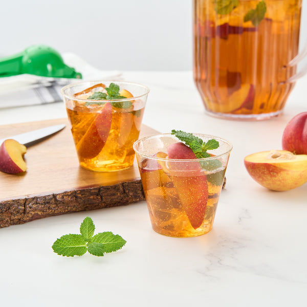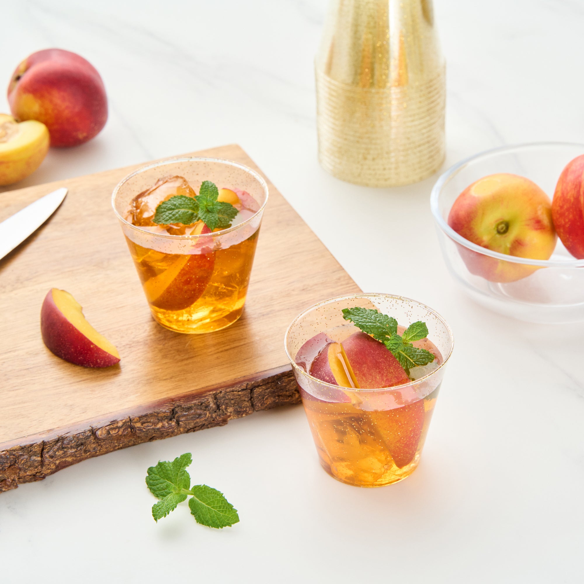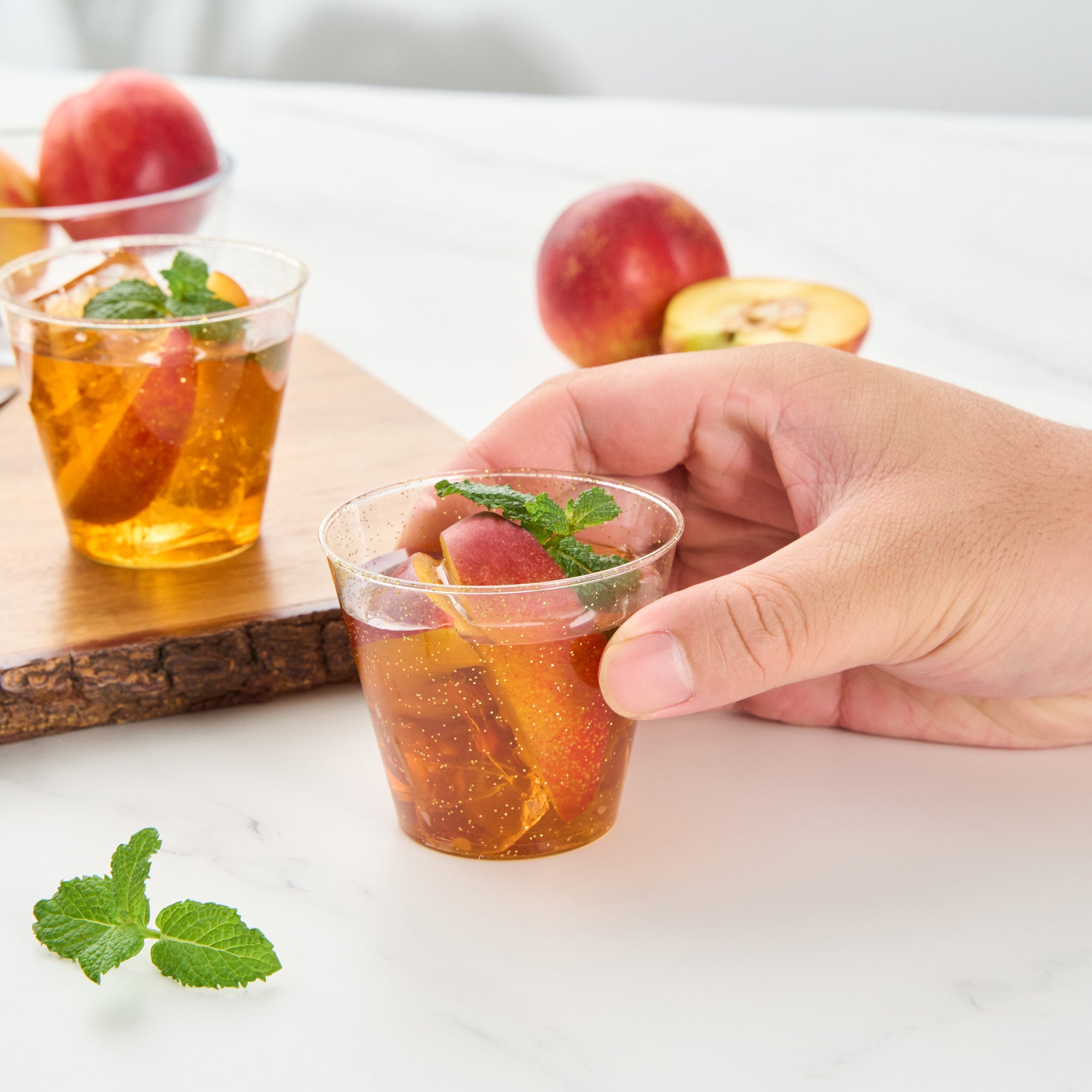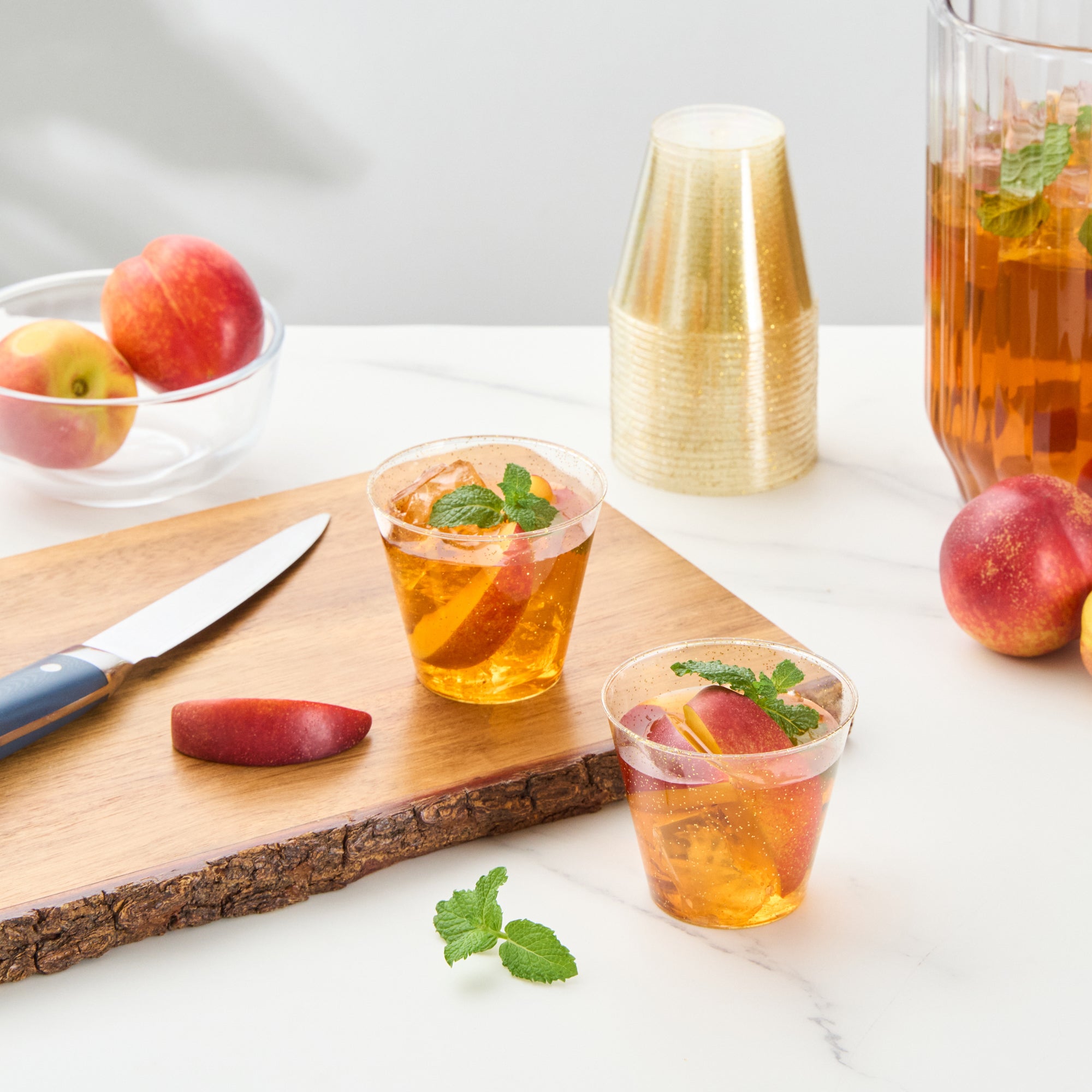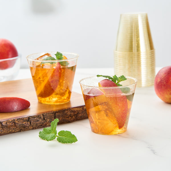 Add sparkle to your events with our Chef 101 5-ounce Gold Glitter Plastic Tumblers. With these party cups, highlight the elegance of gold glitter to elevate the aesthetics of any table setting at festive occasions. Made of hard and durable PS plastic, these glitter plastic cups can be used at weddings, birthdays, and more. These plastic glasses are cold food-friendly and ideal for chill beverages. The recyclable nature of these cocktail cups ensures a quick and sustainable cleanup, allowing you to effortlessly maintain an eco-conscious environment. Turn every occasion into a chic affair with these dazzling glasses that are disposable, providing an easy cleanup solution. At 2.8 inches in diameter and 2.3 inches in height, these 5-ounce gold plastic tumblers offer a compact size. Sold in a 20 count box.