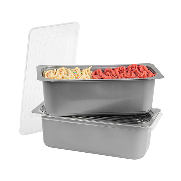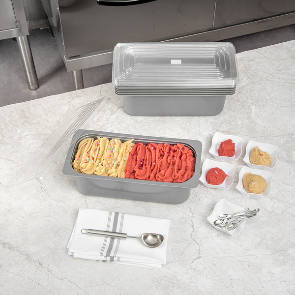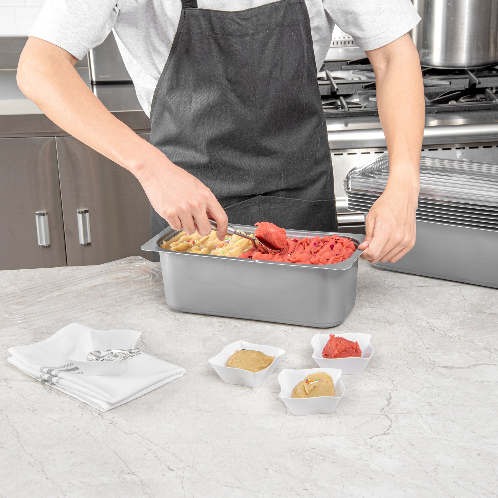 Enhance your frozen treat service with efficient storage solutions. The Chef 101 Plastic Ice Cream Tub with a Clear Lid offers a 5 quart capacity, making it perfect for storing large batches of ice cream and optimizing your inventory management. Constructed from durable PET plastic, this ice cream storage container is designed to withstand the demands of high-paced catering environments, ensuring its longevity. The clear lid design provides excellent visibility, boosting customer appeal by showcasing your culinary creations without needing to open the container. Made from BPA-free plastic, this plastic dessert container prioritizes food safety and maintains the integrity of your delicious treats. Its rectangular shape, measuring 13.58 inches in length, ensures efficient stacking and maximizes freezer space, ideal for ice cream parlors, cafes, and catering businesses. Invest in reliable ice cream storage solutions and elevate your foodservice operations. Each order includes 100 Chef 101 Plastic Ice Cream Tub with a Clear Lid.