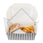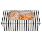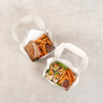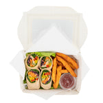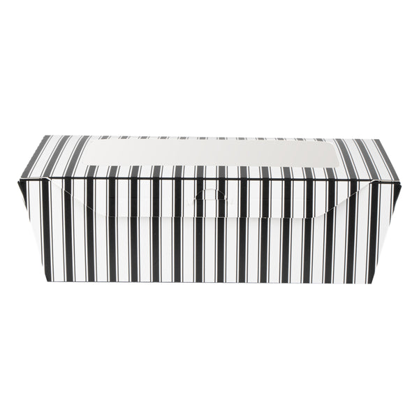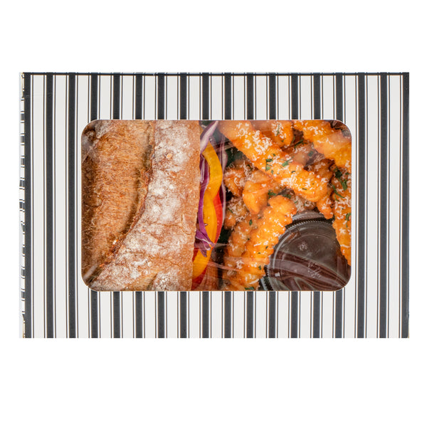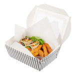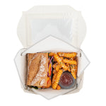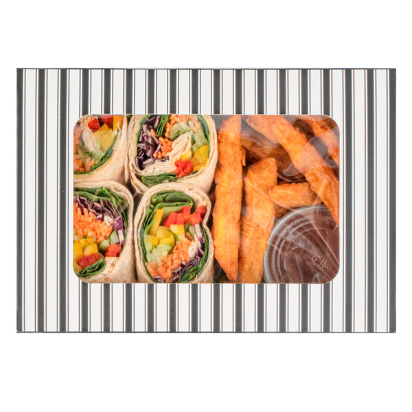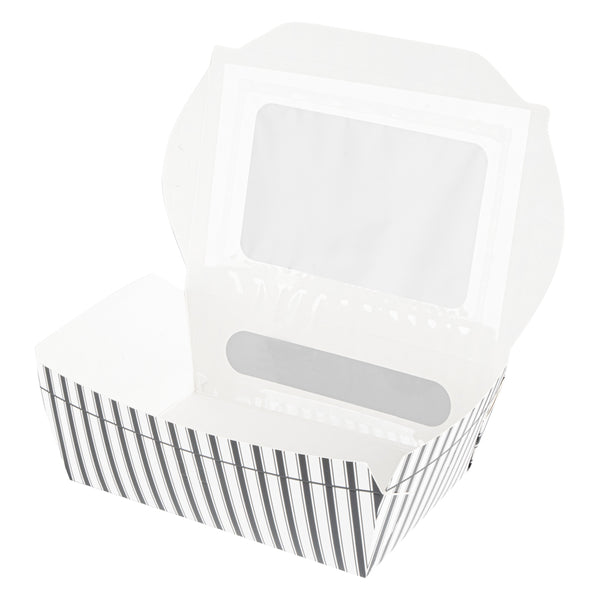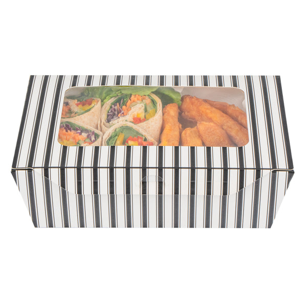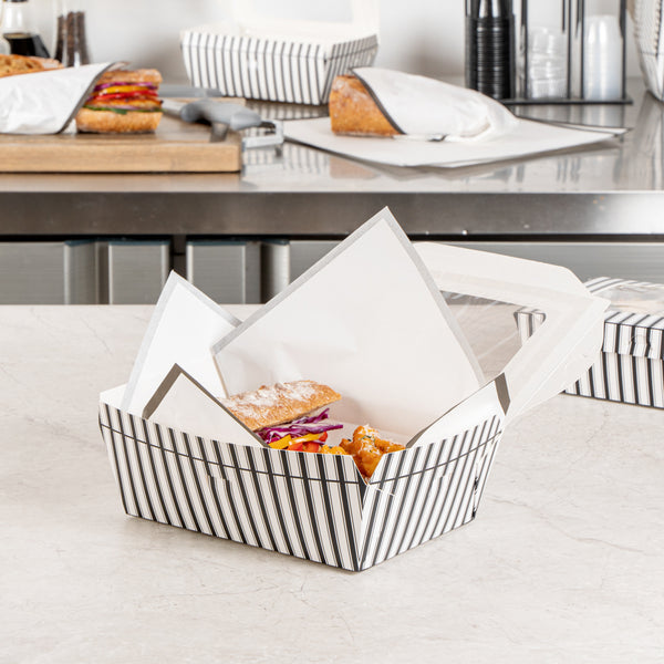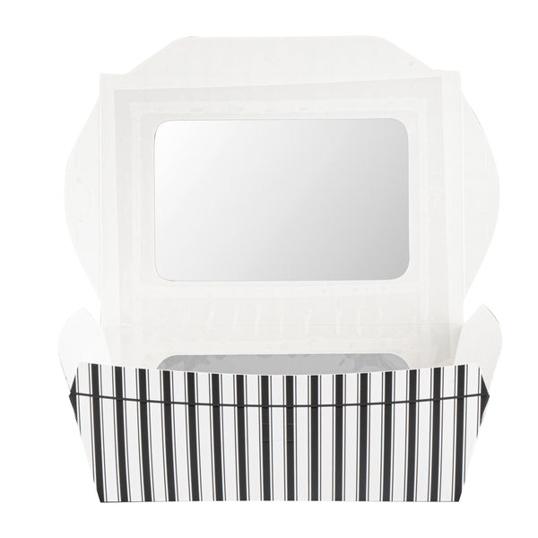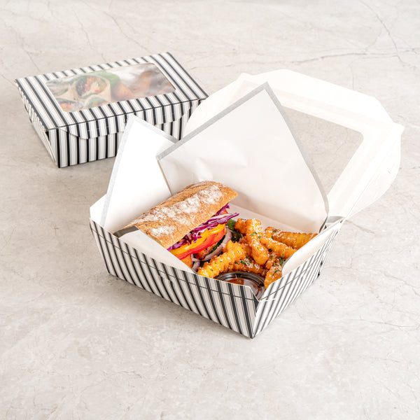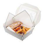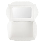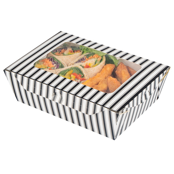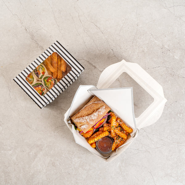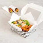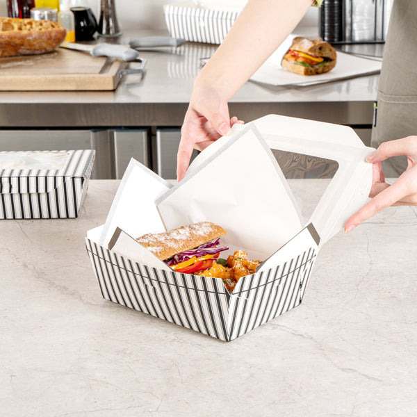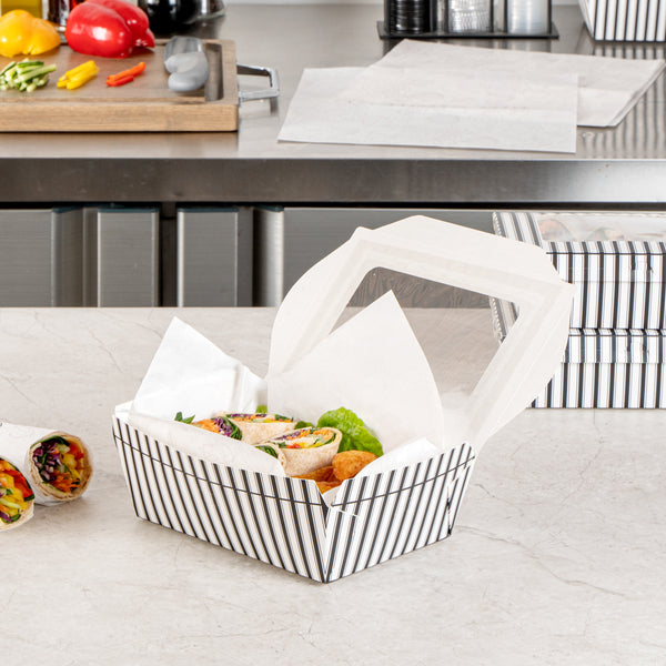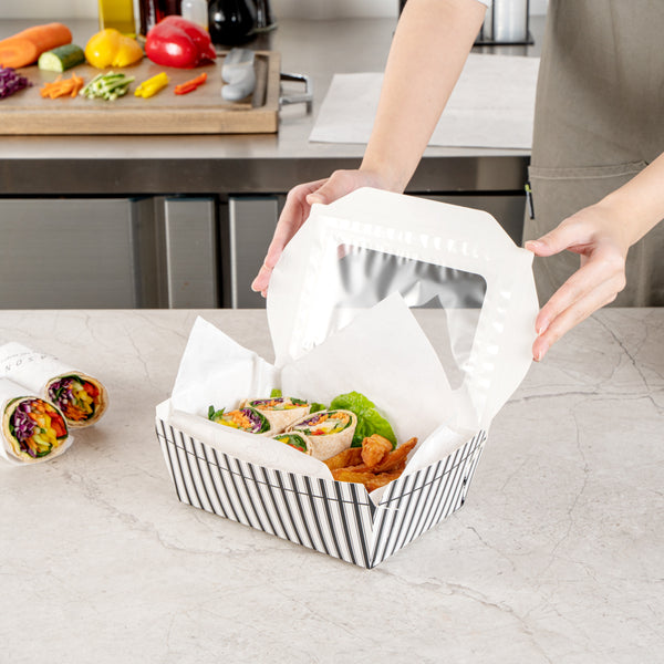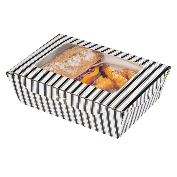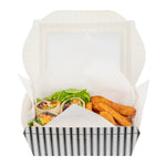 Provide an eco-friendly and stylish option for take out and delivery with our Chef 101 57-ounce Rectangle Black and White Paper Extra Large Bio Take Out Containers. These paper lunch boxes are greaseproof and PLA-coated to prevent leaks when carrying greasy or saucy foods. The clear windows on these paper lunch boxes offer a preview of meals while preserving freshness and temperature. A clamshell design on these restaurant lunch boxes allows easy opening and closing for customer and staff convenience. These black and white paper lunch boxes add a sleek touch to food presentations. Designed for hot and cold foods, these takeaway lunch boxes are compostable and biodegradable for sustainable use. These 57-ounce lunch boxes hold large portions to satisfy hearty appetites. Measuring 7.9 inches long by 5.5 inches wide by 2.4 inches tall, these paper lunch boxes offer ample space for big dishes. Sold in a 200 count box.