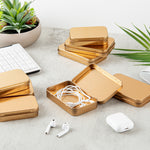 Save space in your bag by packing assorted travel necessities in our Chef 101 6-ounce Rectangle Gold Tin Containers. Manufactured using top-quality tin material, these metal storage containers with lids do not rust or break easily. To provide you with a comfortable use, these metal storage boxes come with hinged lids for easy closing and opening of the boxes. Plus, the lids of these airtight tin boxes fit perfectly to secure the contents inside the boxes. To protect your hands, these tin containers for storage have rounded edges that are smooth and seamless. With a lightweight structure, these tin boxes with hinged lids are compact and fit inside your bags easily during transit. The royal gold shade of these metal storage boxes with lids allows you to customize them with your DIY ideas. Each of these rectangular containers for storage can contain up to 6 ounces and measures 4.5 inches in length by 2.75 inches in width. Sold in a 100 count box.