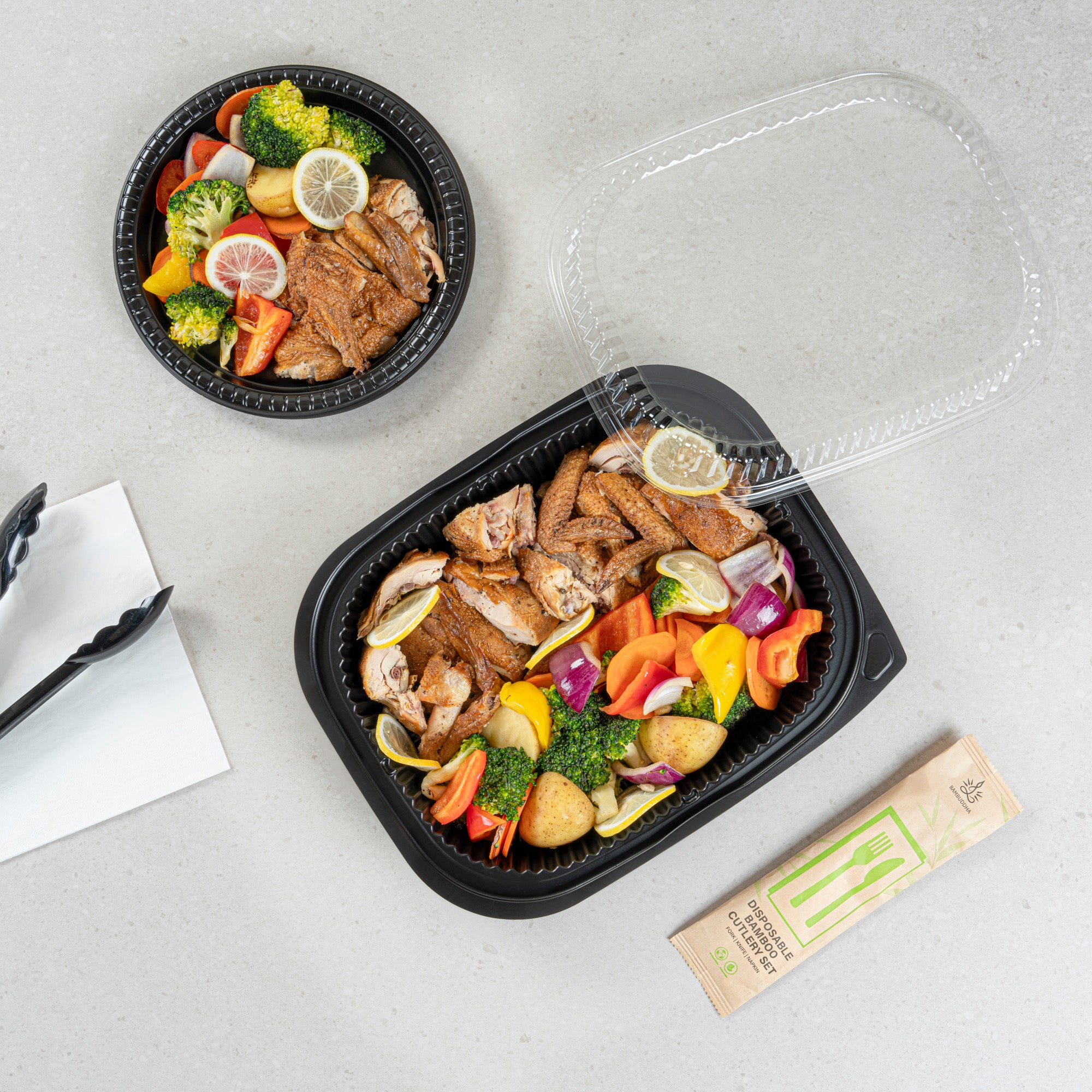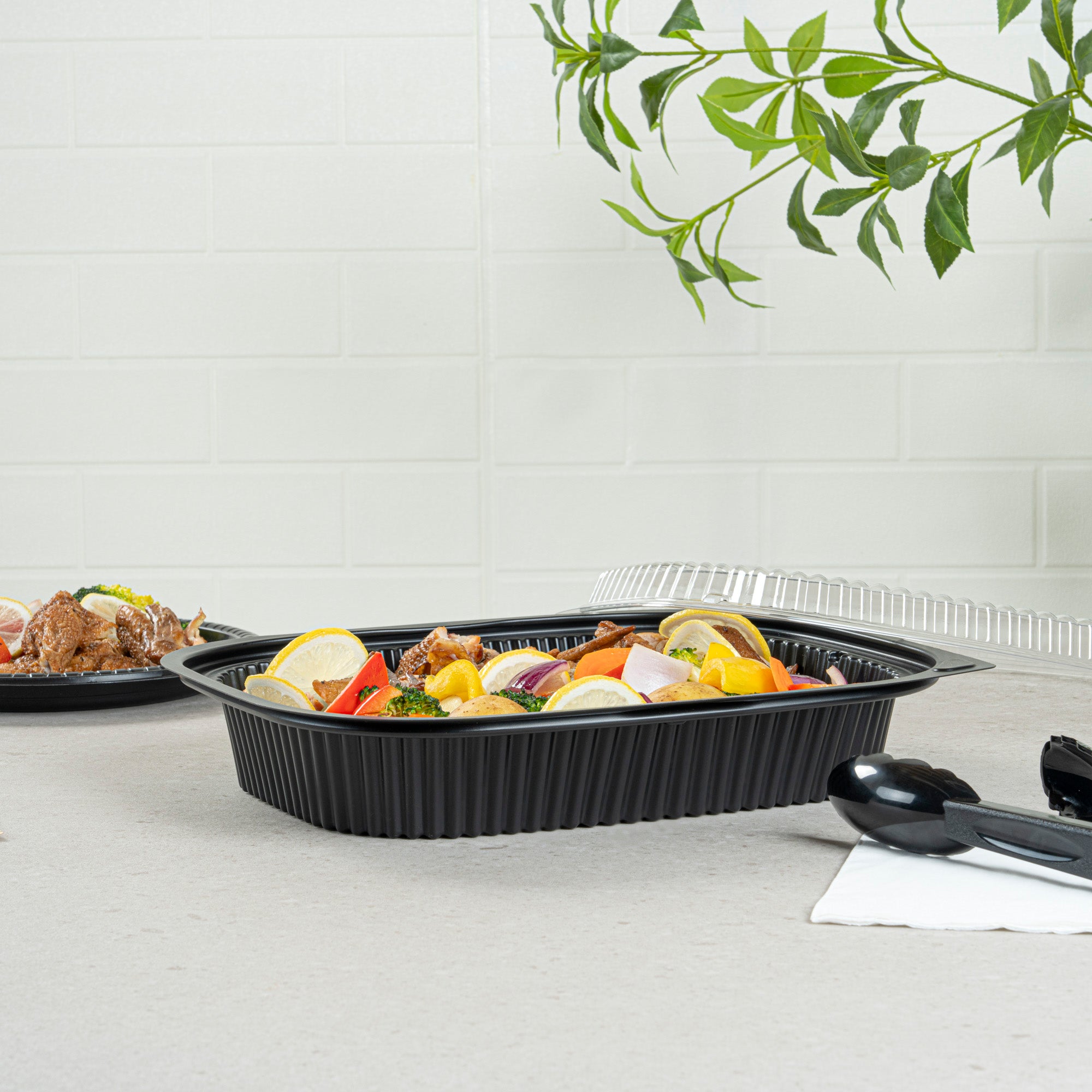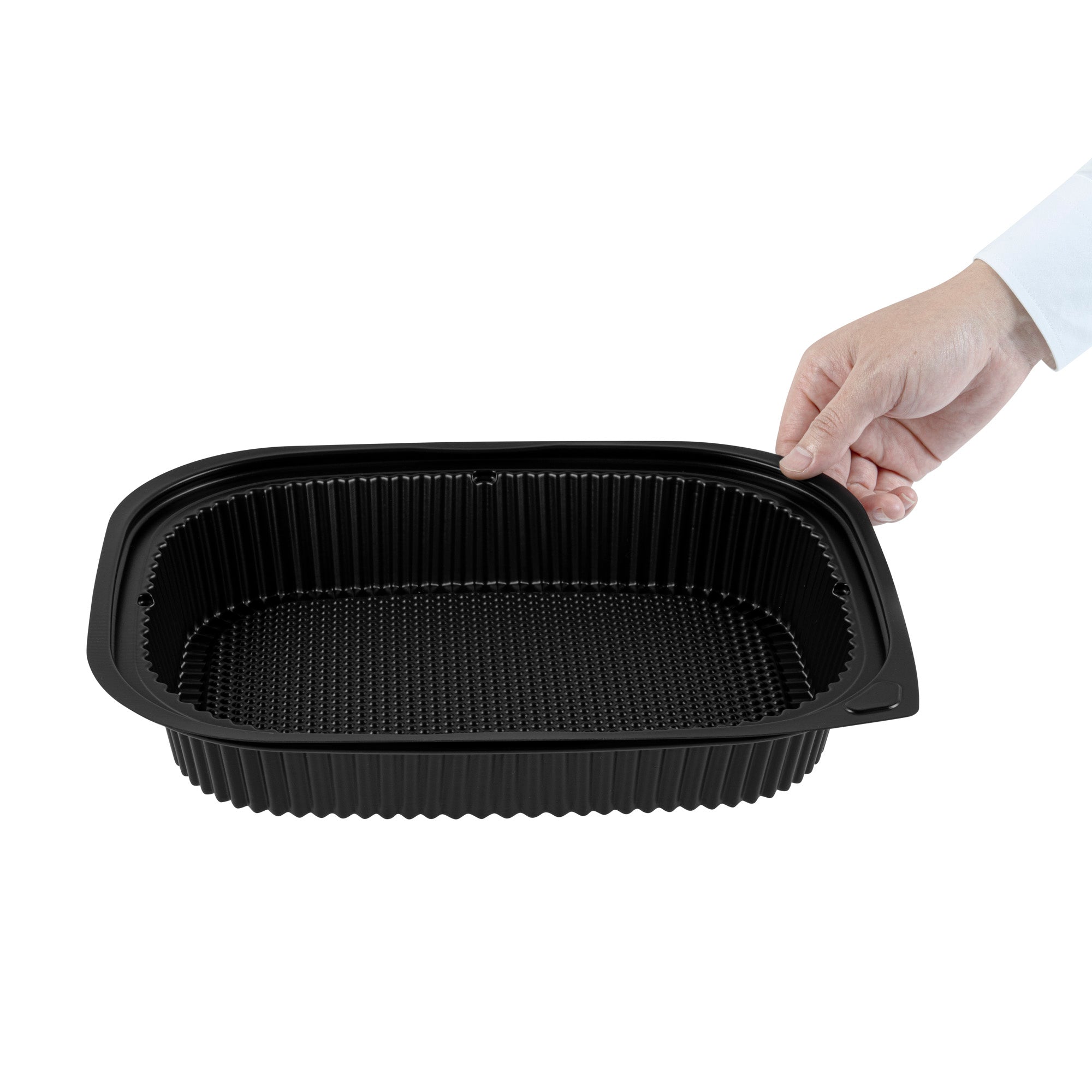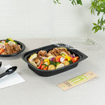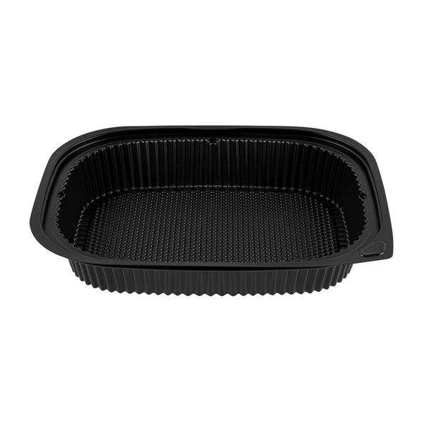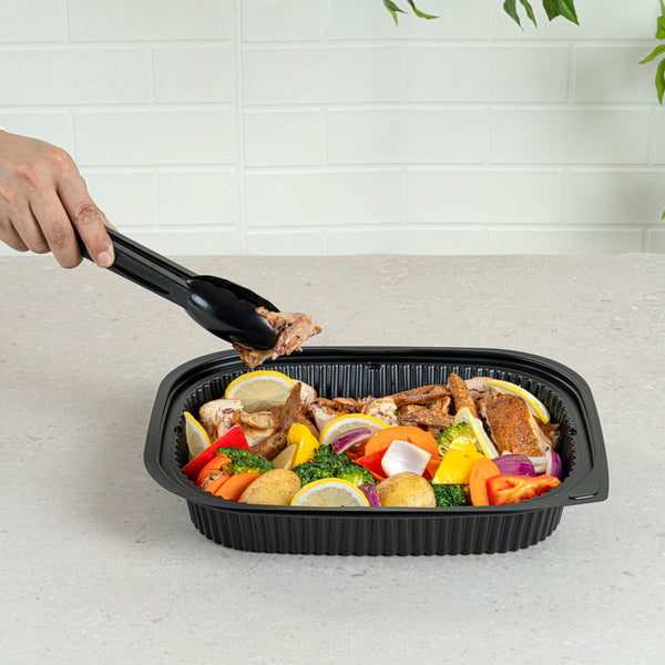 Elevate your foodservice with our Chef 101 88 oz Rectangle Black Plastic Food Containers. These microwavable food containers are perfect for reheating meals quickly and conveniently. Made from durable plastic, these heavy-duty takeaway containers are ideal for storing both hot and cold food items. With a stackable design, these to go boxes help save valuable space in your kitchen or storage area. Pair these containers with their coordinating lid (SKU: RWP1702C) for a complete and secure takeaway solution. Holding up to 59 ounces, these disposable food containers measure 13.4 inches in length by 9.5 inches in width by 2.4 inches in height. Sold in a 100 count box.