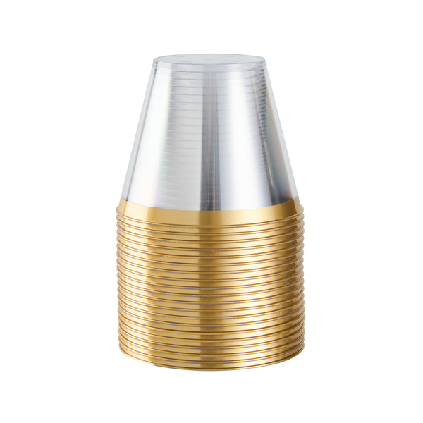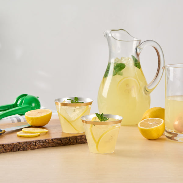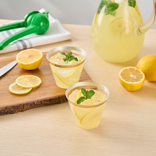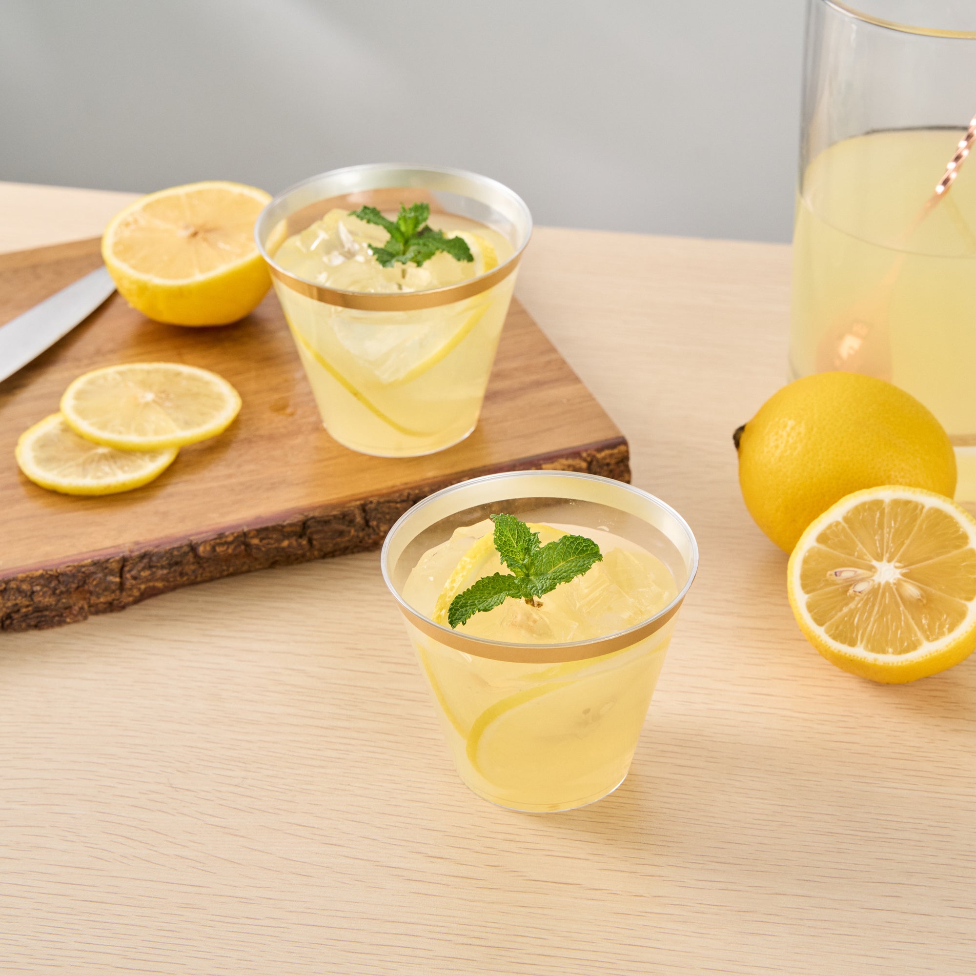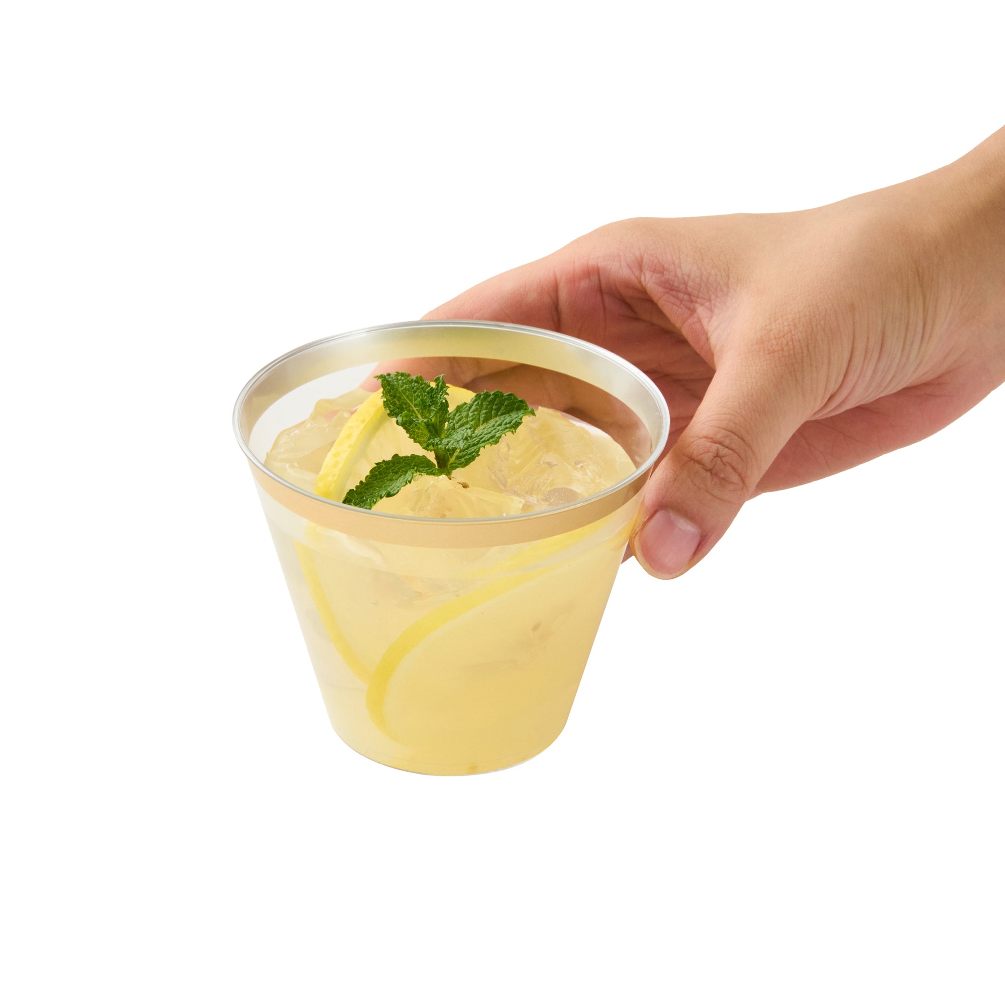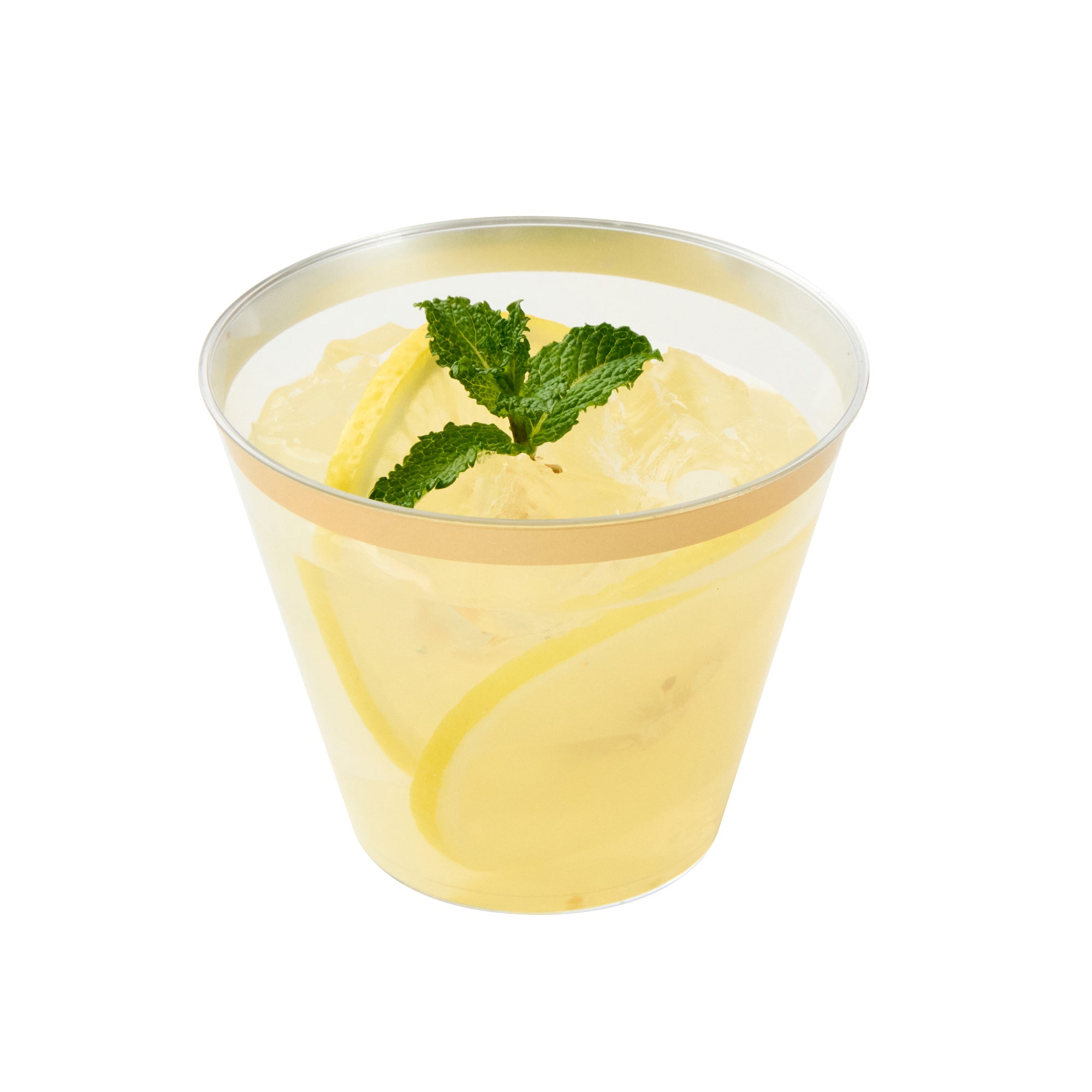 Elevate your event's drink presentation with elegance and sustainability. Chef 101 Gold Rim 9 oz Clear Plastic Cups combine a stylish gold rim design that enhances the aesthetic appeal of cocktails and desserts, making them the centerpiece of your setups. These clear plastic cups are cold food-friendly, ideal for serving fresh juices and party cocktails, offering versatility for various beverage options. Constructed from sturdy plastic, they provide a sustainable option for eco-conscious hosts, supporting environmental initiatives while ensuring durability. Measuring 3.5 inches in diameter and 2.75 inches in height, these cups are perfect for upscale events such as weddings and corporate parties, where elegant drink presentation is desired. Whether you're a catering service or a restaurant aiming to elevate drinkware aesthetics, these gold rim plastic cups are the perfect addition to your collection. Each order includes 500 Chef 101 Gold Rim Clear Plastic Cups.