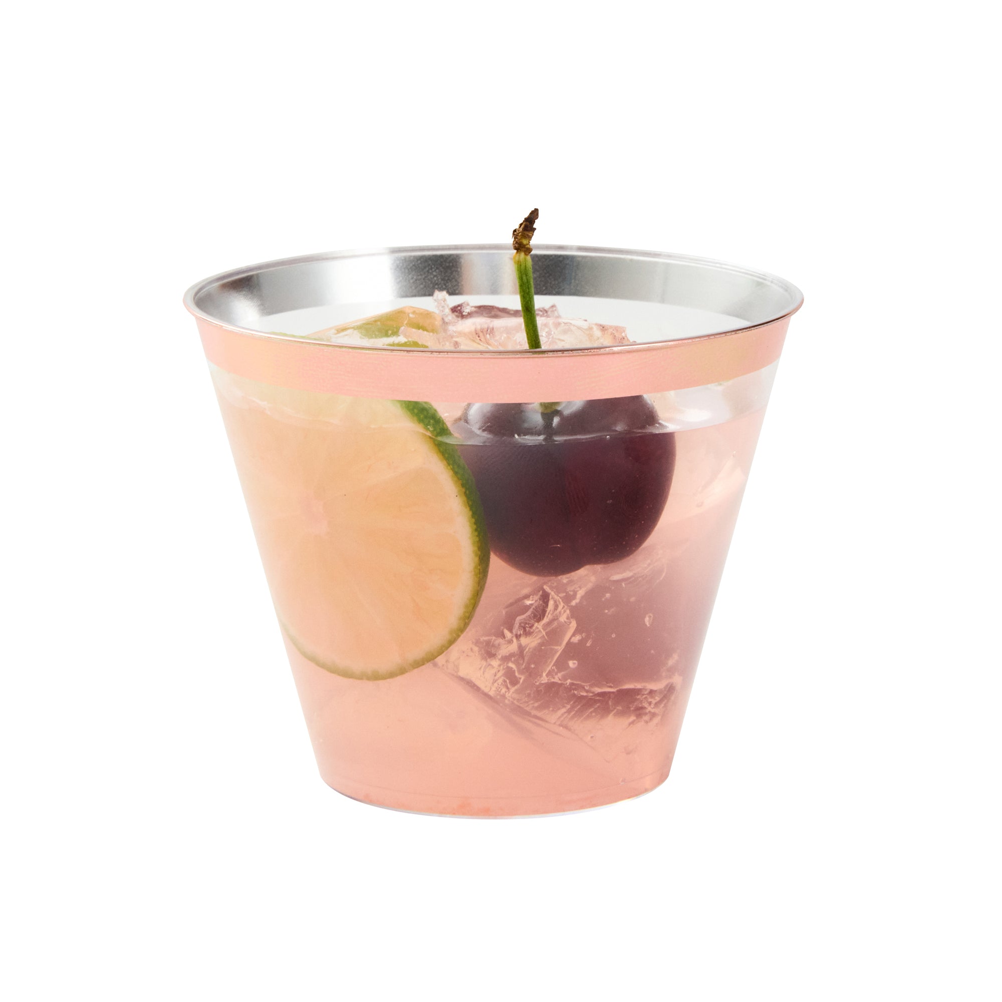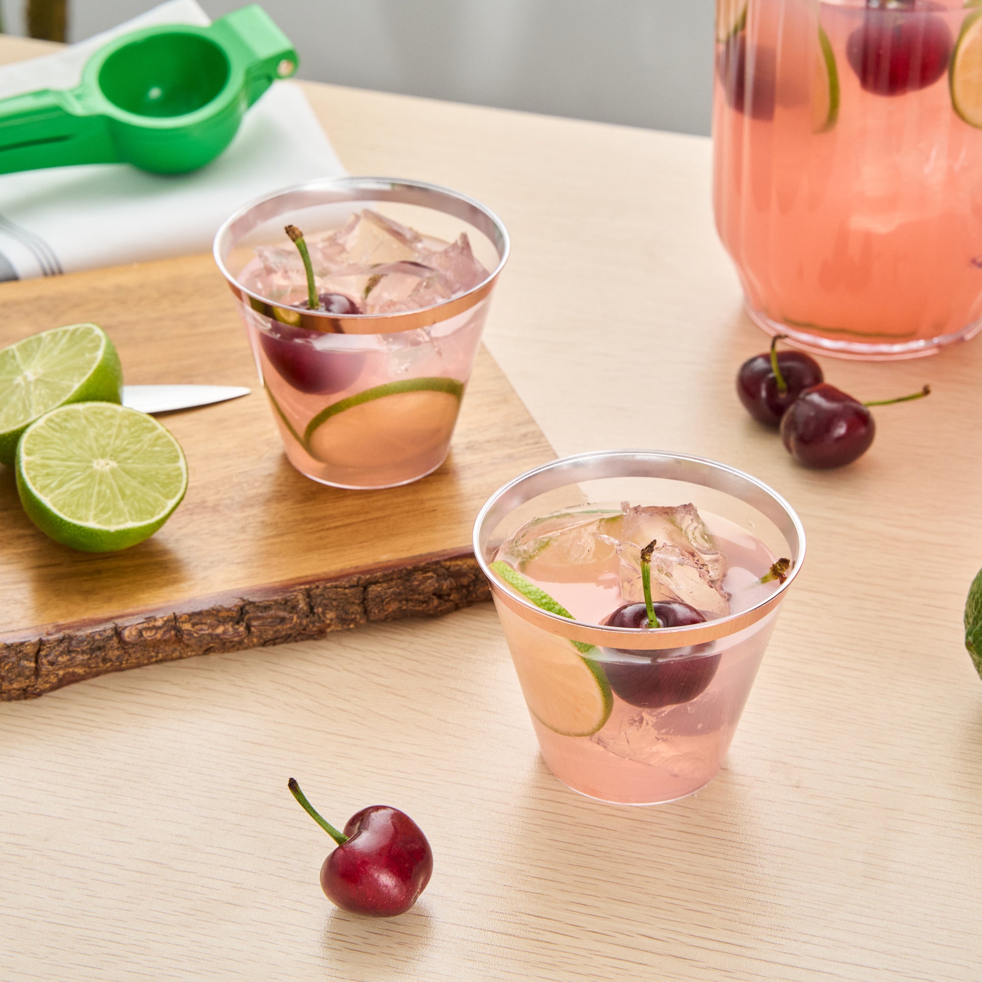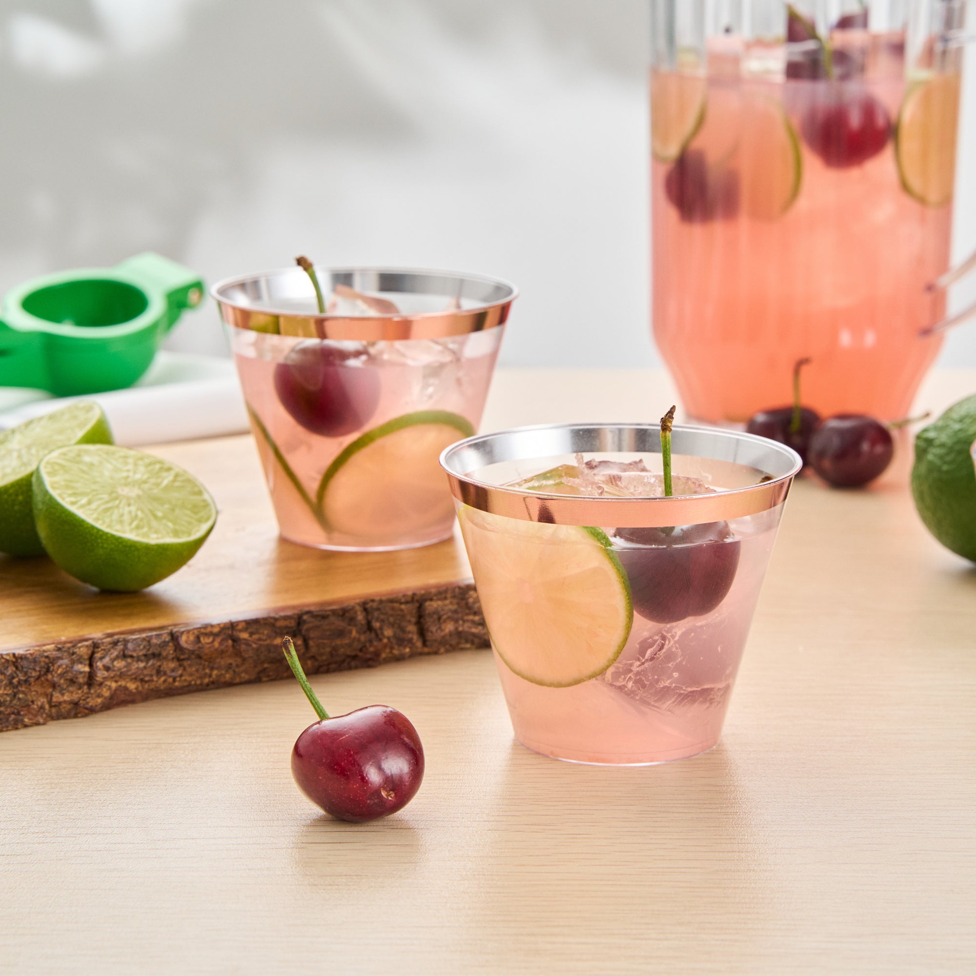 Elevate any drink station with our Chef 101 9-ounce Clear Plastic Tumblers. Made to impress, these clear glasses have a rose gold rim that elevates your dining aesthetic, enhancing the guest experience at any event. Manufactured from hard and durable PS plastic, these disposable plastic glasses simplify clean-up after large gatherings. Cold food-friendly, these clear tumblers are perfect for serving refreshingly chilled cocktails and maintaining their form throughout the event. Effortlessly complement any beverage with the rose gold finish of these elegant glasses, an ideal choice for weddings, birthdays, or any sophisticated party setting. Reliability meets practicality with these recyclable glasses, making them an indispensable addition to any foodservice arsenal. Streamline your event planning with these 9-ounce rose gold rim cups that measure 3.5 inches in diameter and 2.8 inches in height. Sold in a 20 count box.