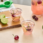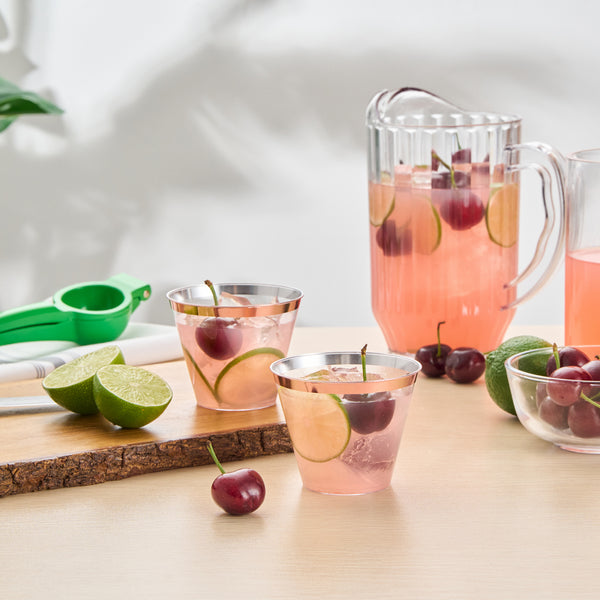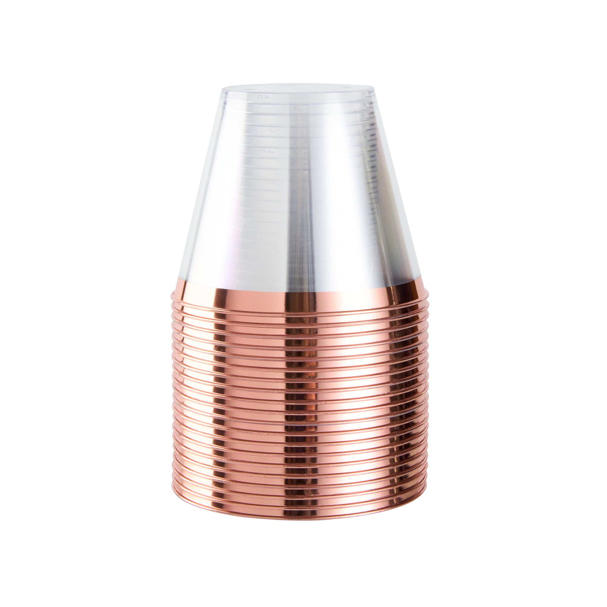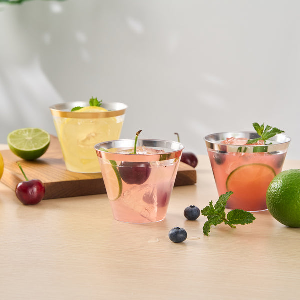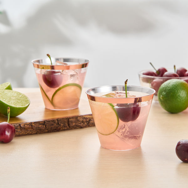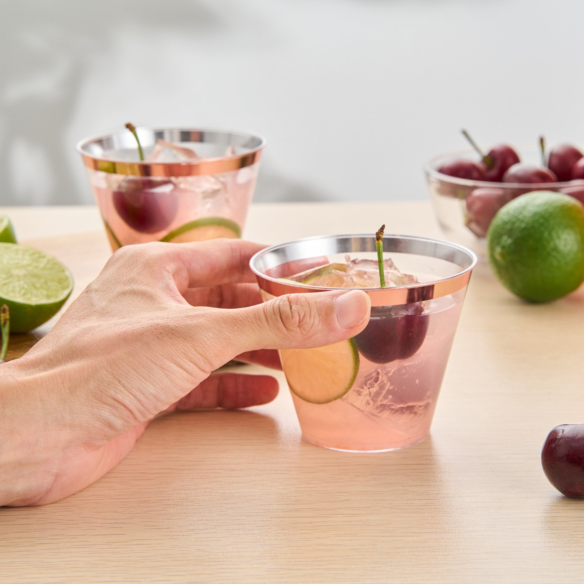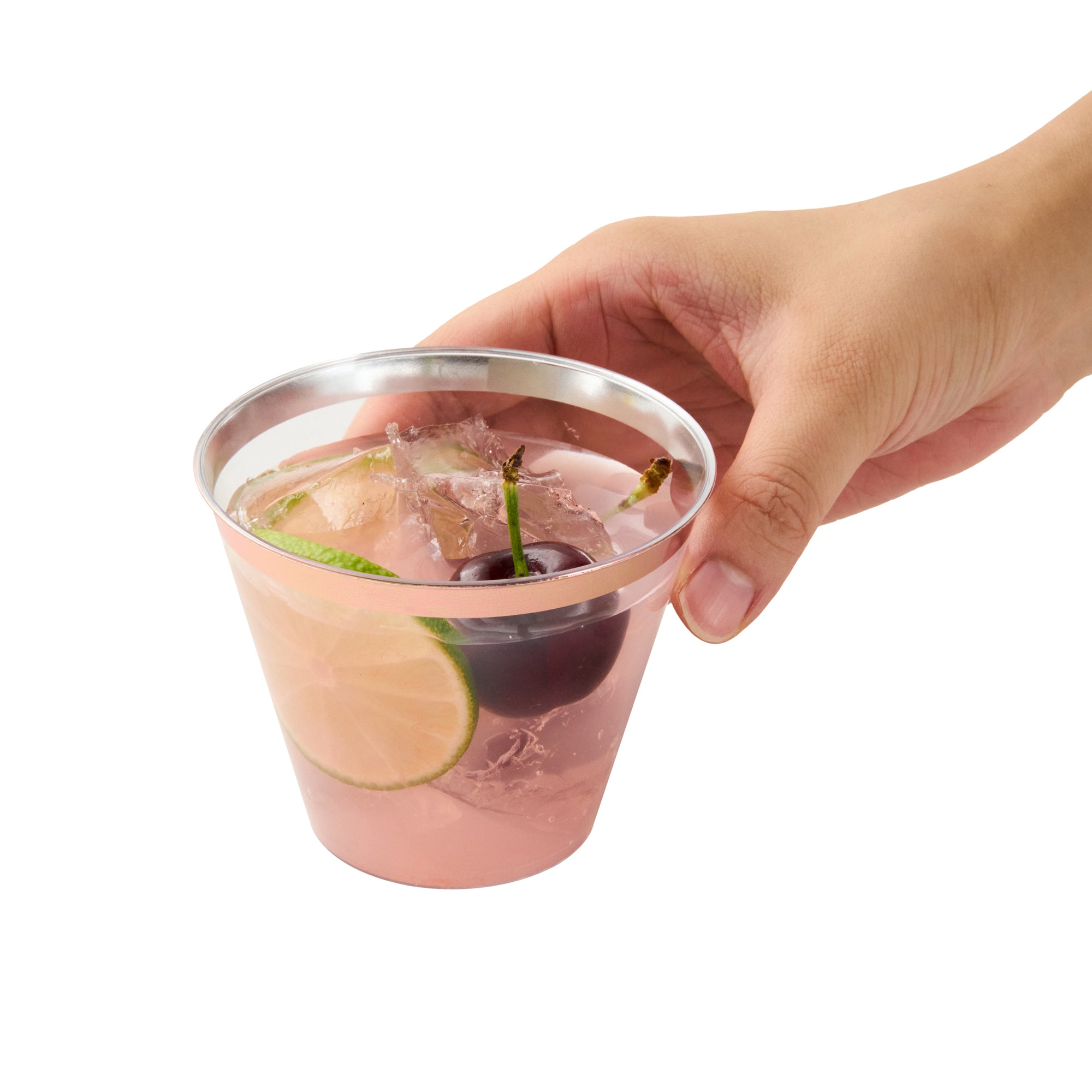 Elevate any drink station with our Chef 101 9-ounce Clear Plastic Tumblers. Made to impress, these clear glasses have a rose gold rim that elevates your dining aesthetic, enhancing the guest experience at any event. Manufactured from hard and durable PS plastic, these disposable plastic glasses simplify clean-up after large gatherings. Cold food-friendly, these clear tumblers are perfect for serving refreshingly chilled cocktails and maintaining their form throughout the event. Effortlessly complement any beverage with the rose gold finish of these elegant glasses, an ideal choice for weddings, birthdays, or any sophisticated party setting. Reliability meets practicality with these recyclable glasses, making them an indispensable addition to any foodservice arsenal. Streamline your event planning with these 9-ounce rose gold rim cups that measure 3.5 inches in diameter and 2.8 inches in height. Sold in a 20 count box.