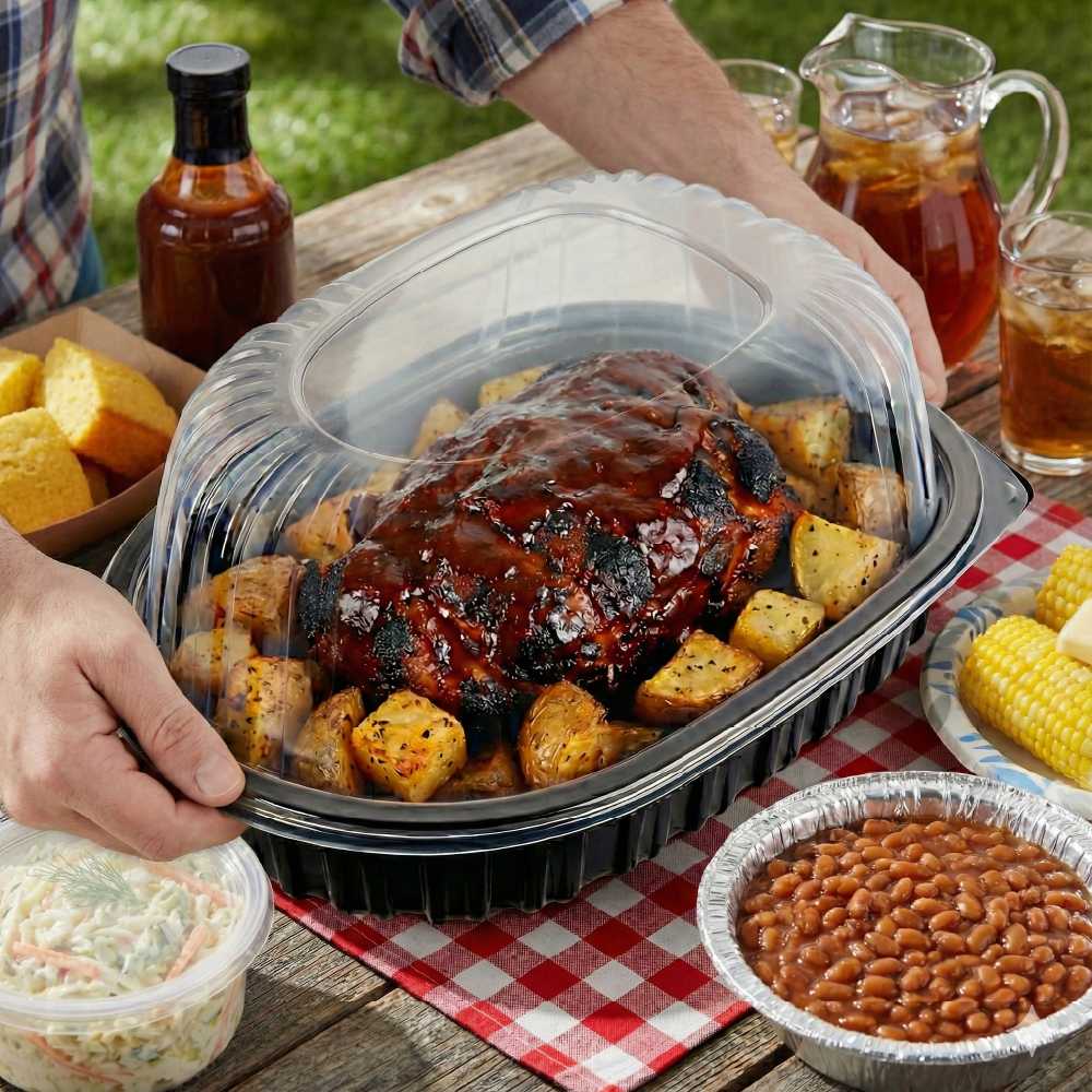 Ensure your takeout stays fresh and leak-free with our expertly designed rotisserie chicken container. The Chef 101 Leakproof Rotisserie Chicken Container features a reliable seal closure that prevents spills during transport, keeping your foodservice operations clean and efficient. The plastic roaster container is expertly crafted from sturdy plastic with a clear dome lid, offering excellent visibility for quick content identification and attractive presentation. Ideal for supermarkets, delis, and catering services, its 10-inch by 7.5-inch by 4.5-inch dimensions ensure ample space for whole roasted chickens or hot entrees. The reinforced ribbed construction adds durability, avoiding deformation while handling, making it perfect for busy kitchen settings. Enhance your food presentation and customer satisfaction with this must-have plastic roaster container. Each order includes 50 Chef 101 Leakproof Rotisserie Chicken Containers.
