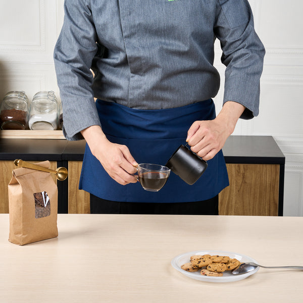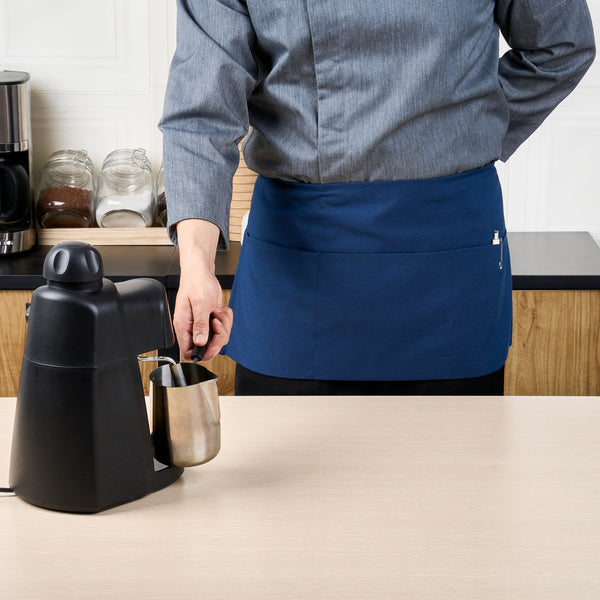 Elevate your staff's appearance and functionality with our Chef 101 Blue Standard Waist Aprons. Equipped with three spacious patch pockets on the front, these work aprons are perfect for holding all service or kitchen supplies. Featuring quick ties for effortless wear and removal, these premium aprons save time and effort in busy environments. The shortened length design of these server aprons provides convenient coverage while allowing for greater freedom of movement and ease of wear. Made from a durable poly-cotton blend, these aprons with pockets keep their shape and resist wrinkles through repeated washings. The back ties on these bartender aprons offer a customizable fit, ensuring that the apron stays securely in place while allowing for easy adjustments. Machine washable for easy maintenance, these waist aprons are designed to withstand frequent laundering while retaining their color and shape. The vibrant blue color ensures a fresh, fun presentation, making these waitress aprons ideal for both front and back-of-the-house use. Measuring 24 inches in length by 12 inches in width, these blue aprons provide ample coverage without compromising comfort. Sold in a 100 count box.