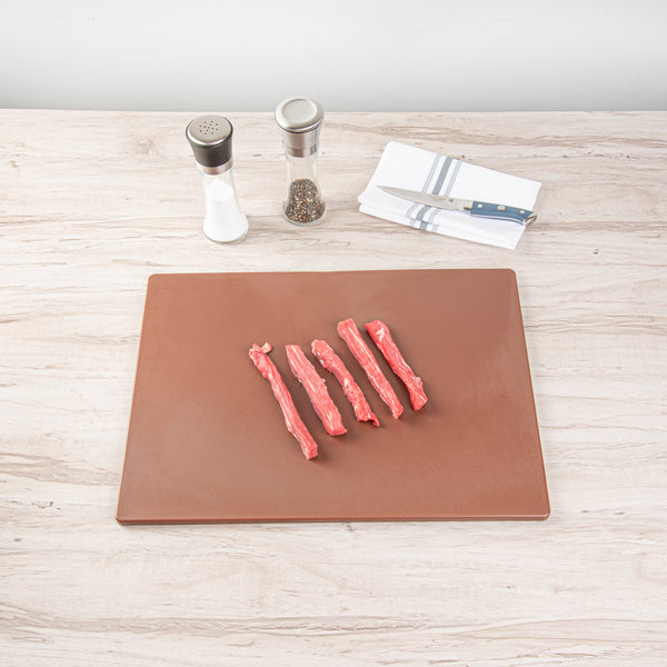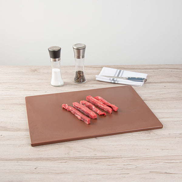 Unleash your culinary talents with our Chef 101 Brown Plastic Cutting Board. This commercial-grade cutting board is made from high-density polyethylene, ensuring a durable and long-lasting surface that resists cut grooving without dulling your knives. Built to withstand heavy usage, this plastic chopping board makes it an ideal choice for restaurants or caterers. This plastic chopping board for vegetables doesn't absorb juice, bacteria, or odor, ensuring a clean and hygienic surface for food prep. The non-skid design of this plastic food prep board securely holds the board in place during use, enhancing safety and precision. This color-coded chopping board system is a key feature that prevents cross-contamination and ensures compliance with HACCP standards, making it a must-have in any professional kitchen. With dimensions of 20 inches in length by 15 inches in width, this brown commercial plastic cutting board is spacious enough for a variety of food prep tasks. Sold in a 1 count box.