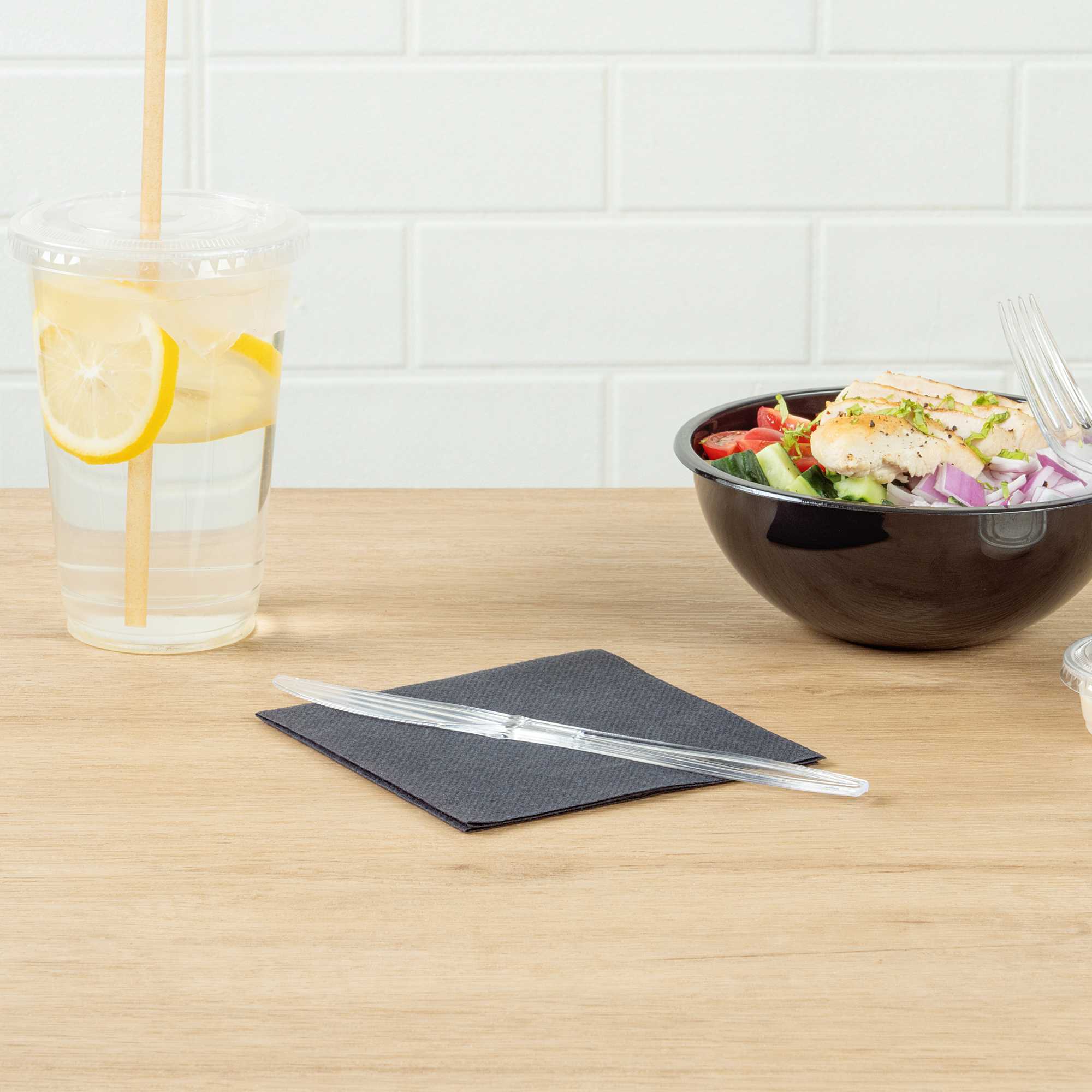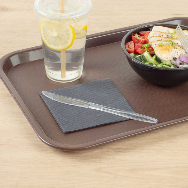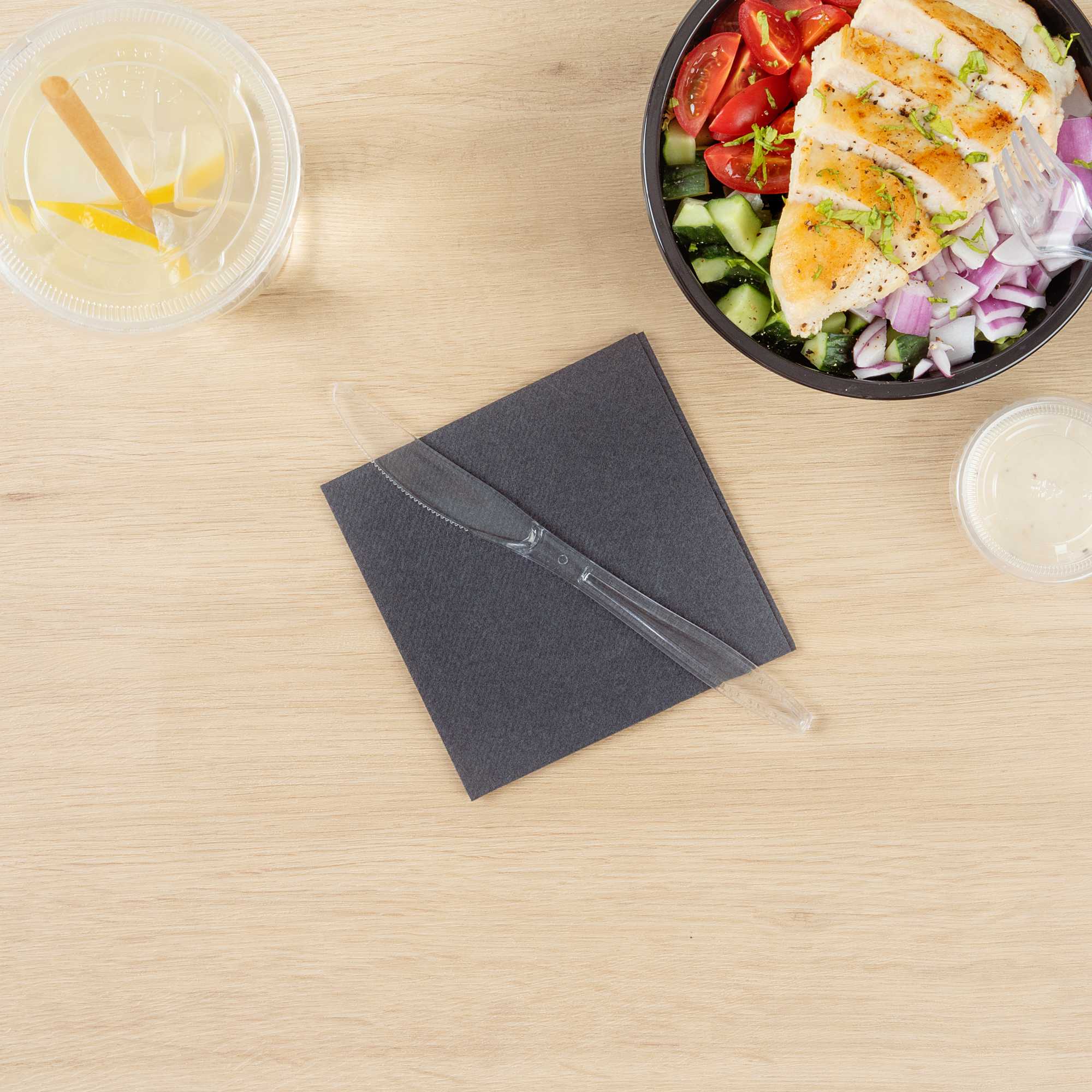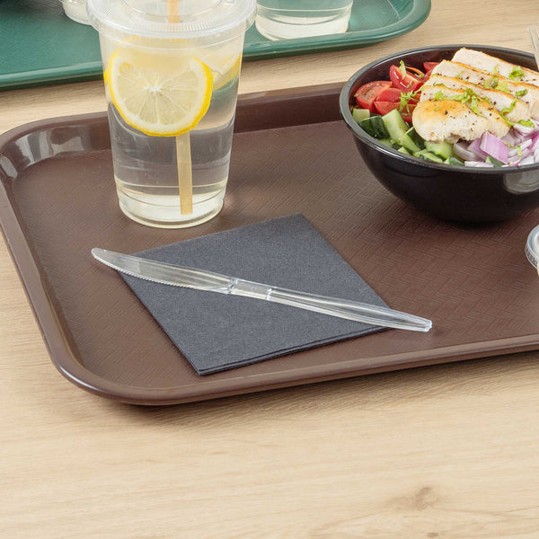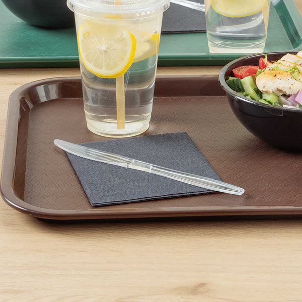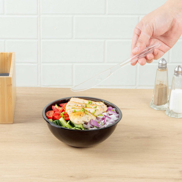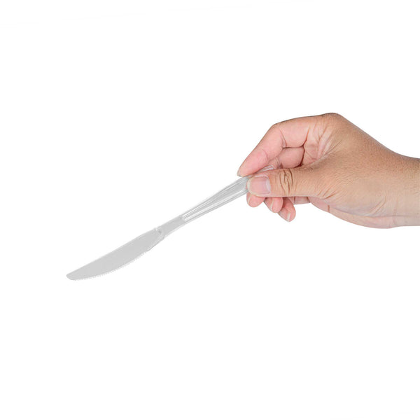 Make every order special with our Chef 101 Clear Plastic Knives. Ideal for food trucks, cafes, and catering companies, these clear plastic knives combine elegant design and durability. With long handles, these serrated knives are designed for a comfortable grip. The finely serrated edges of these plastic knives enable easy and efficient cutting. With their durable plastic construction, these disposable knives work to resist cracking and bending during use. Featuring a recyclable construction, these sturdy knives help reduce your carbon footprint. To streamline your cleaning process, these plastic take out knives are disposable. Adorning a crystal clear finish, these plastic disposable knives easily match any venue or decor. Each of these full-size plastic knives measures 7.25 inches in length. Shipped in a 250 count box.