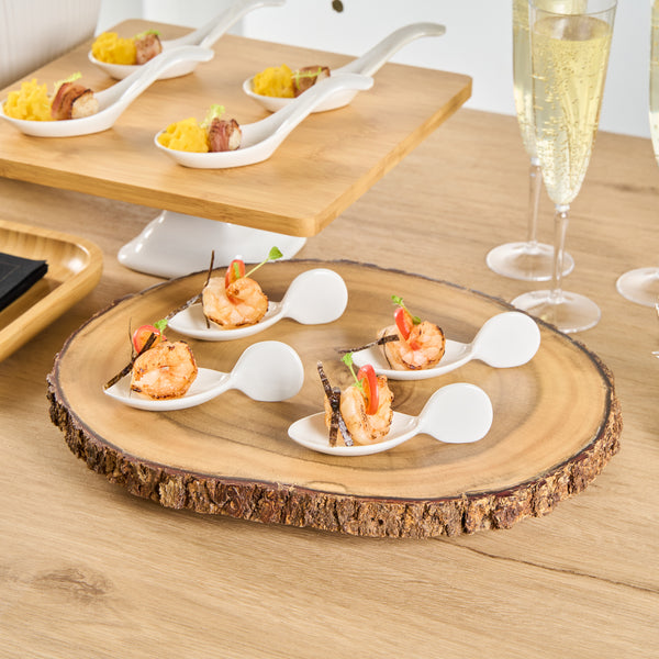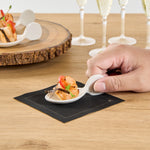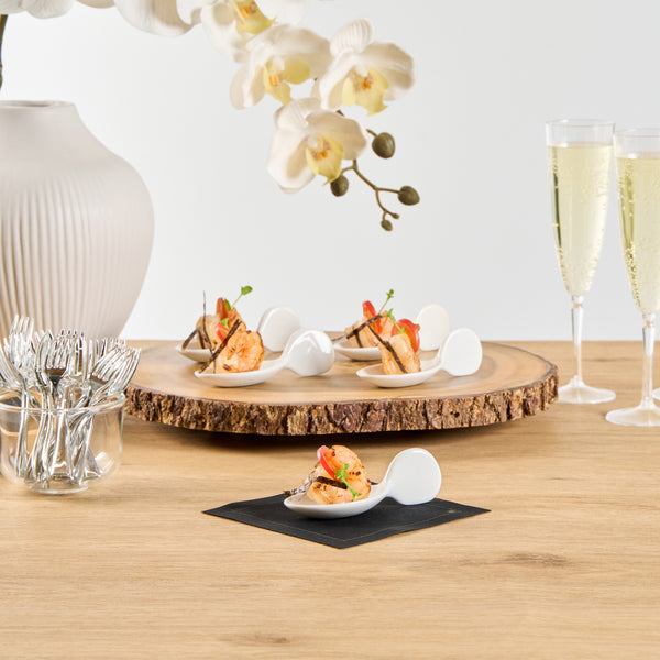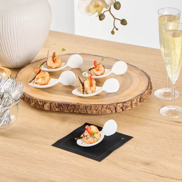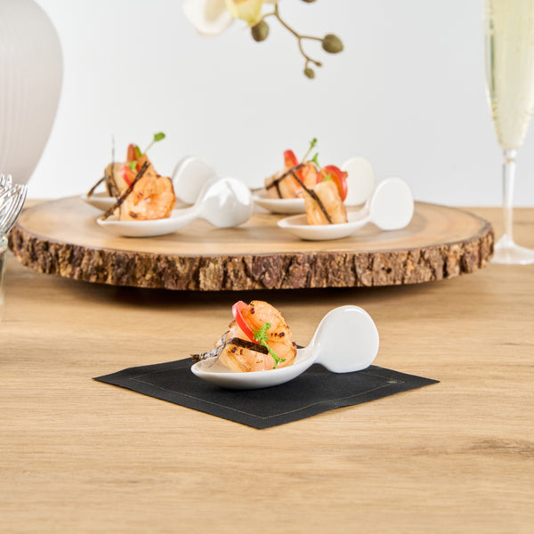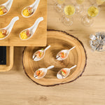Instantly upgrade your presentation with these trendsetting Chef 101 Porcelain Fish Spoons. The sleek edges of these fish-shaped tasting spoons bring simplistic elegance to tapas, hors d'oeuvres, miniature appetizers, and more! Each of these freestanding appetizer spoons is designed with an indented basin that measures 2.5 inches long and is perfect for plating small tasting courses and bite-sized desserts. Constructed from high-quality white porcelain, these appetizer spoons are built to be long-lasting, chip-resistant, and easy to maintain. These fashion-forward amuse bouche spoons measure 4 inches in total length, which includes their easy-to-grip handle. These porcelain tasting spoons are sold in a 10 count box.