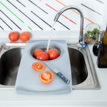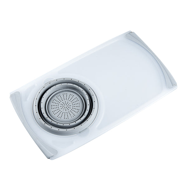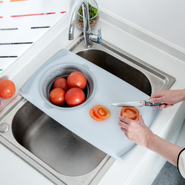 GRAY PLASTIC OVER THE SINK CUTTING BOARD - WITH COLLAPSIBLE STRAINER