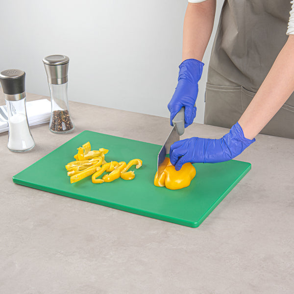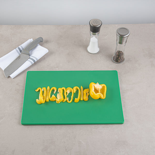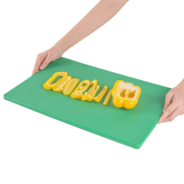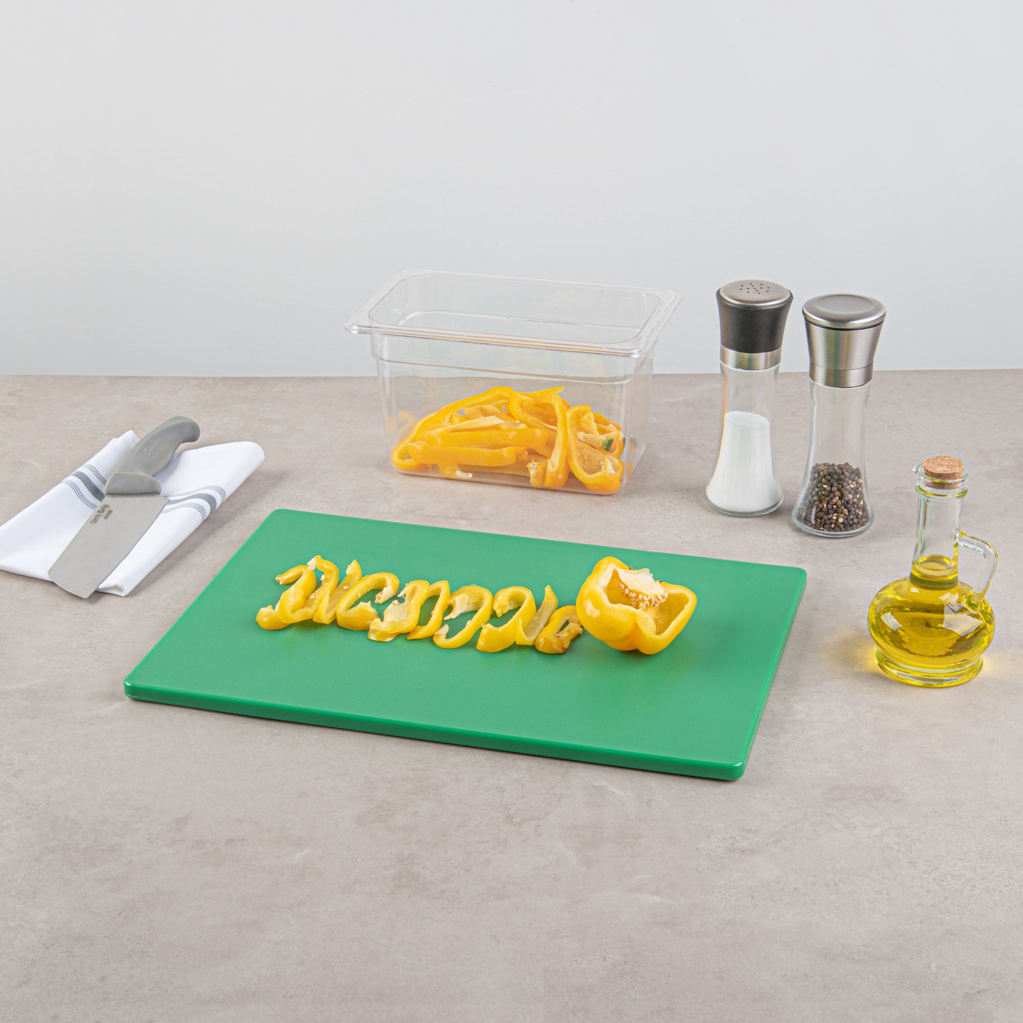 These color-coded cutting boards establish a system of assigning red to raw meats, green to fruits and vegetables, and yellow to poultry significantly increases cleanliness and enables the kitchen staff to quickly identify and use the correct board for each food type. These cutting boards come in different colors to comply with the HACCP standards.