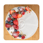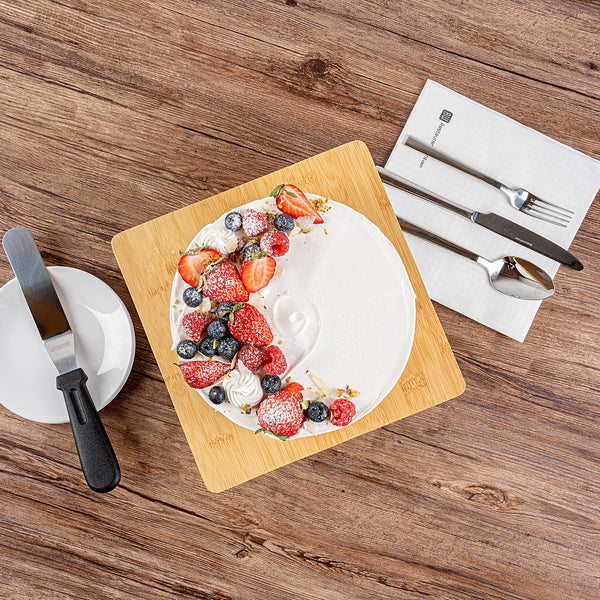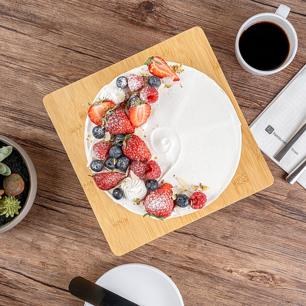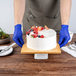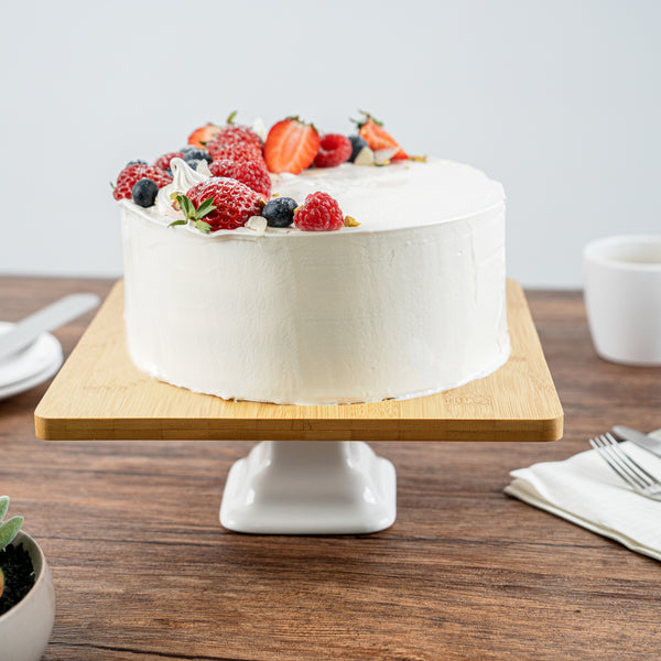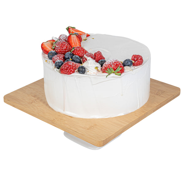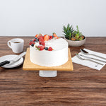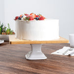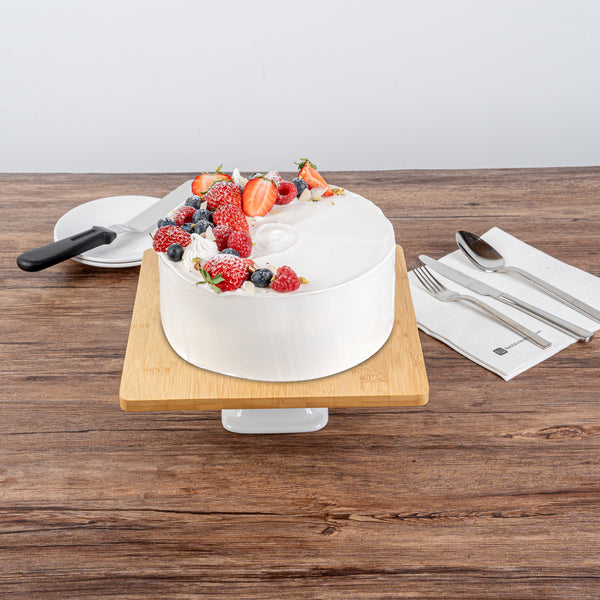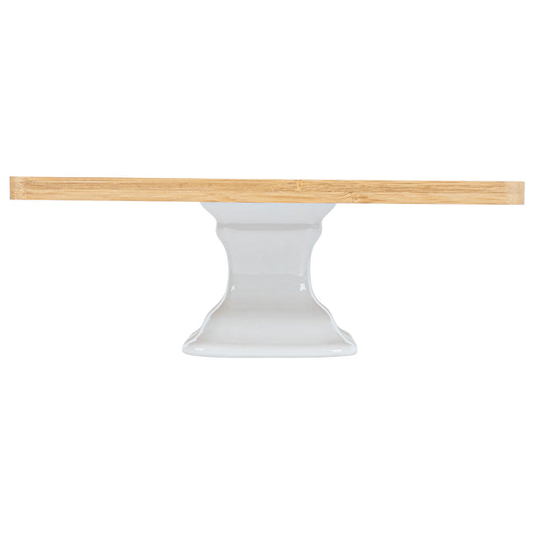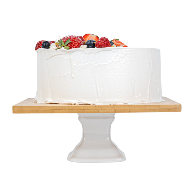 Beautifully display sweet and savory treats with our Chef 101 Hamptons Square Bamboo Serving Stand. This large plate stand is crafted from bamboo and its stand from porcelain, making them break-resistant, scratch-resistant and ideal for long-lasting commercial heavy-duty use. The natural bamboo finish and the elegant white porcelain base of this serving stand brings a charming element to your food presentations and effortlessly showcases them. The sturdy porcelain base of this cake display stand ensures stability and adds a touch of elegance and sophistication to your dessert presentations, making it a standout centerpiece for any occasion. This cake stand is dishwasher-safe and freezer-safe to shorten your cleanup and store your leftovers. Each wood serving tray measures 9.75 inches long by 9.75 inches wide by 4 inches tall. Shipped in a 1 count box.