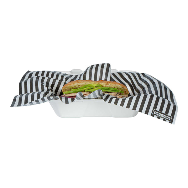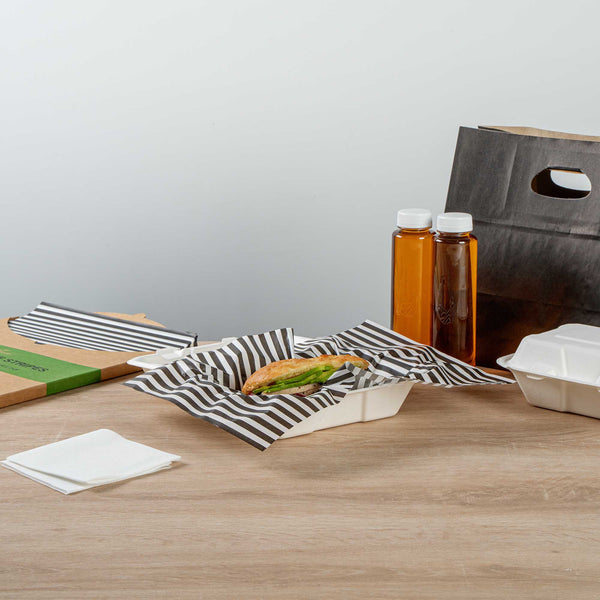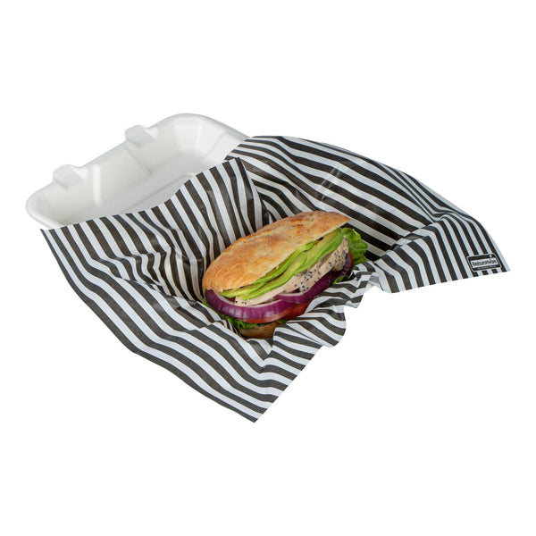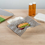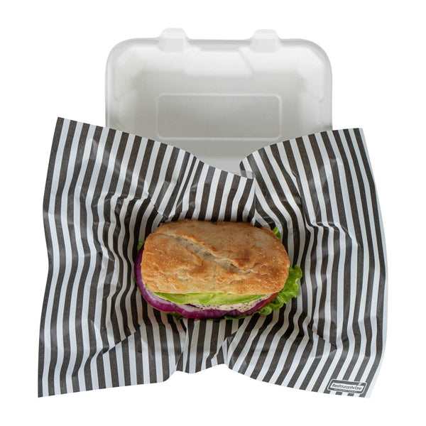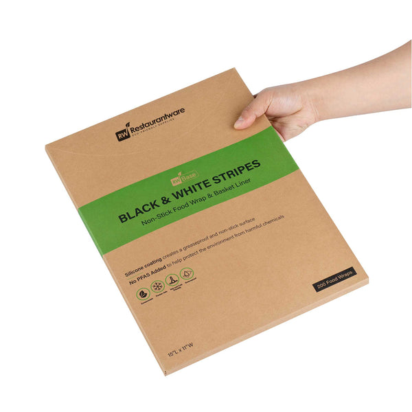 Elevate your food presentation with our Chef 101 No PFAS Added Black and White Stripe Paper Food Wraps and Basket Liners. Made with no added PFAS, these food tray liners are commercially compostable and recyclable. These food wraps feature a durable paper construction, ensuring your food items are securely wrapped and easy to handle. Adorned with a modern and chic black and white striped design, these taco paper wraps will instantly add a touch of sophistication to your foodservice operations. The greaseproof silicone coating of these sandwich wrap papers avoids leaks and messes, making them ideal for serving greasy foods. For added convenience, these basket liners are freezable, allowing you to store meals as needed. These deli papers are pre-cut to a perfect size of 15 inches in length by 11 inches in width, facilitating quick and easy wrapping. Sold in a 2,000 count box.