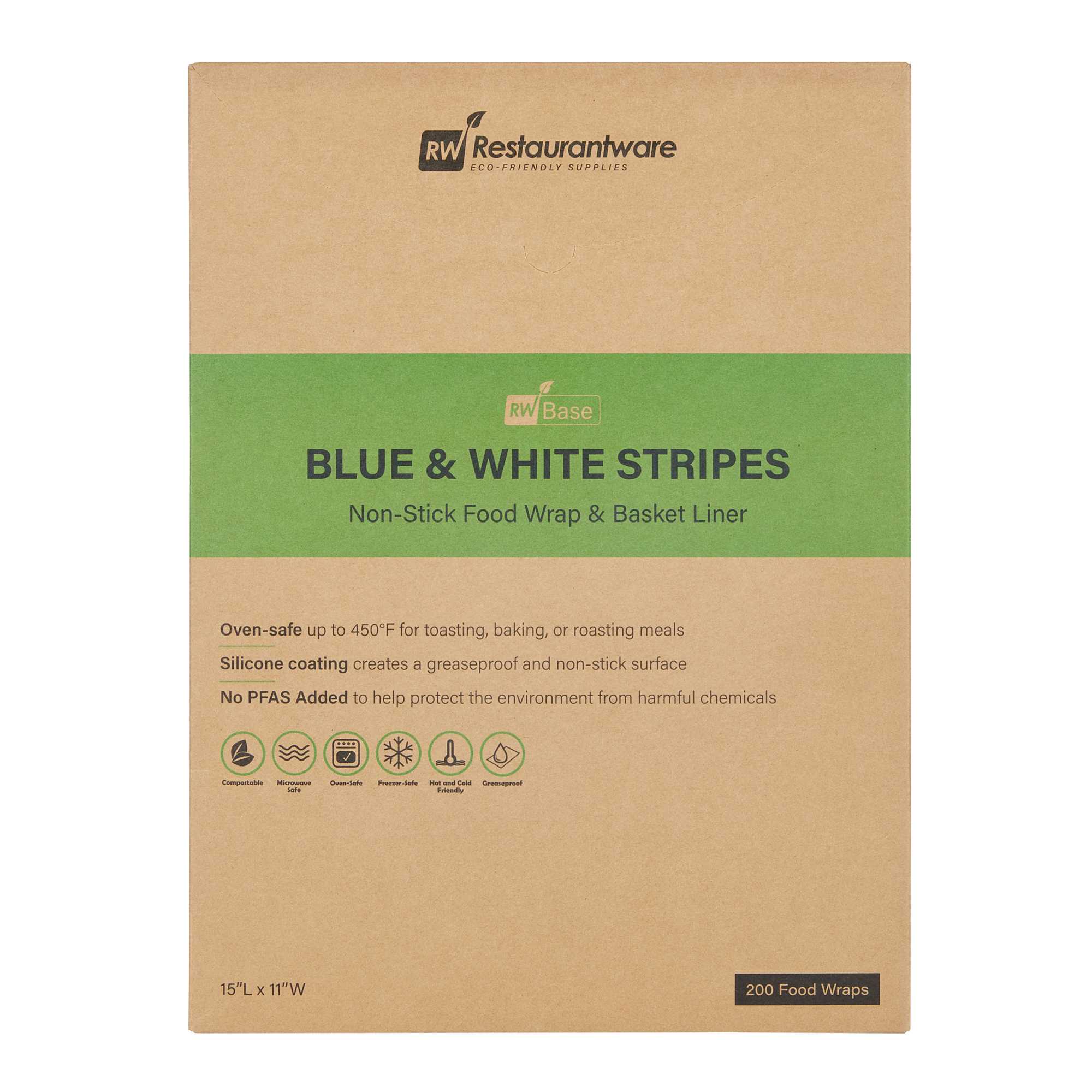Our Chef 101 No PFAS Added Blue and White Stripe Paper Food Wraps and Basket Liners are a sustainable choice for your food service needs. With their durable paper construction and no added PFAS, these food wraps provide a sturdy base for your delicious meals. The greaseproof silicone coating on our taco paper wraps ensures your meals stay fresh while keeping your customers' hands clean. Adorned with a vibrant blue and white striped design, these sandwich wrap papers enhance your food presentation, making every meal a feast for the eyes. These disposable basket liners are freezable, allowing your customers to store their leftovers. Plus, these recyclable pre-cut deli papers for food provide the perfect size for wrapping tacos, sandwiches. Each bakery liner measures 15 inches in length by 11 inches in width. Sold in a 2,000 count box.