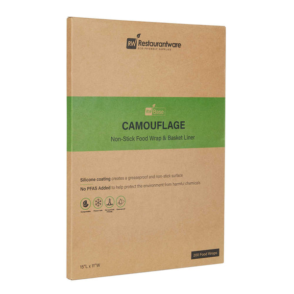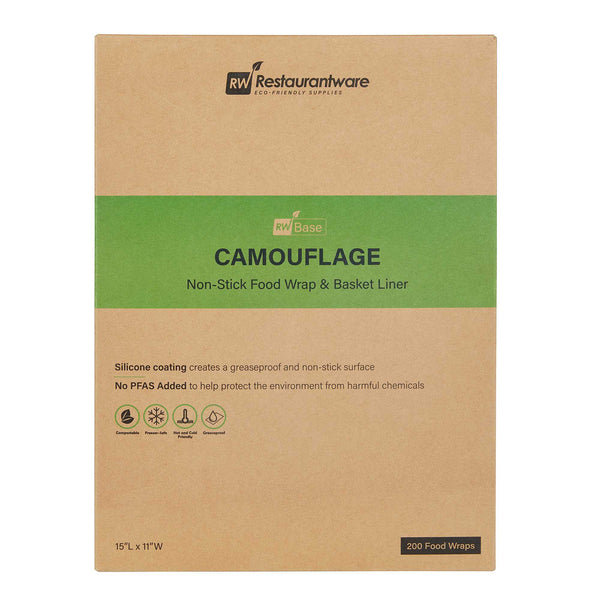 Add a pop of style to your food presentation with our Chef 101 No PFAS Added Camouflage Paper Food Wraps and Basket Liners. These food wraps boast a durable paper construction, ensuring your dishes remain intact and presentable. Styled with a unique camouflage design, these taco paper wraps add a fun twist to your traditional food packaging, making your offerings more appealing. With the greaseproof silicone coating, these sandwich wrap papers keep oils and sauces contained, maintaining the cleanliness of your customer's hands and dining area. These basket liners are freezable, offering you a versatile solution for serving a variety of cold food items. Perfect for fast-paced foodservice establishments, these deli papers are precut, speeding up your wrapping process and enhancing efficiency. Measuring 15 inches in length by 11 inches in width, these sandwich wraps are ideal for food trucks, catered events, or cafes. Sold in a 200 count box.