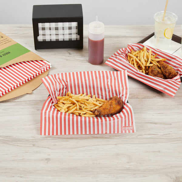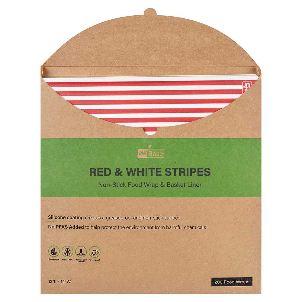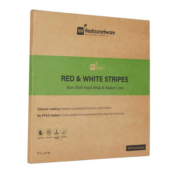 Experience the superior quality of our Chef 101 No PFAS Added Red and White Stripe Paper Bakery Wraps and Basket Liners, designed to meet the highest standards of the foodservice industry. These food wraps, boasting a durable paper construction, offer strength and reliability to handle your most delectable dishes. With their greaseproof silicone coating, these taco paper wraps are perfect for serving oily or moist foods without any mess. Display your baked goodies with a charm, as the red and white striped design of these bakery wraps adds an authentic touch to your presentation. These pre-cut sandwich wrap papers, measuring 12 inches in length by 12 inches in width, are versatile enough to accommodate a variety of food items, from burgers to wraps and everything in between. With an unwavering commitment to our environment, these disposable deli papers are reprocessable, ensuring your foodservice operation leaves a minimal carbon footprint. Sold in a 200 count box.
