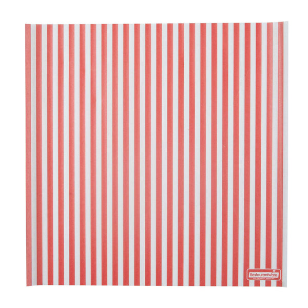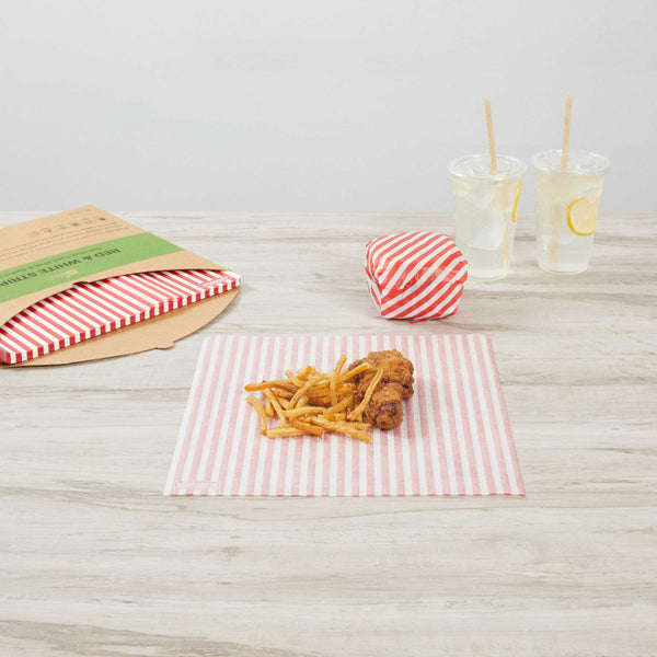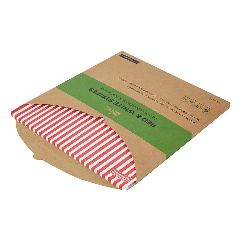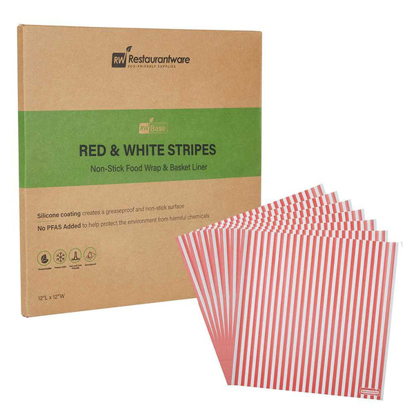 Experience the superior quality of our Chef 101 No PFAS Added Red and White Stripe Paper Bakery Wraps and Basket Liners, designed to meet the highest standards of the foodservice industry. These food wraps, boasting a durable paper construction, offer strength and reliability to handle your most delectable dishes. With their greaseproof silicone coating, these taco paper wraps are perfect for serving oily or moist foods without any mess. Display your baked goodies with a charm, as the red and white striped design of these bakery wraps adds an authentic touch to your presentation. These pre-cut sandwich wrap papers, measuring 12 inches in length by 12 inches in width, are versatile enough to accommodate a variety of food items, from burgers to wraps and everything in between. With an unwavering commitment to our environment, these disposable deli papers are reprocessable, ensuring your foodservice operation leaves a minimal carbon footprint. Sold in a 2,000 count box.