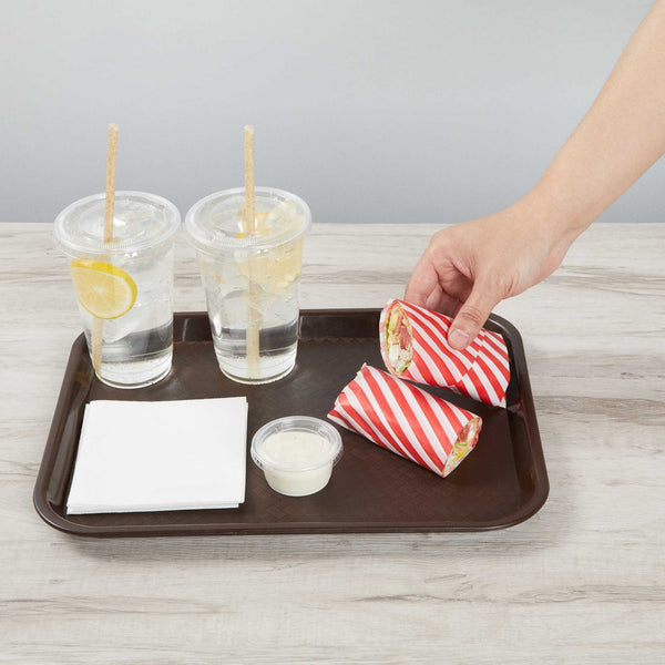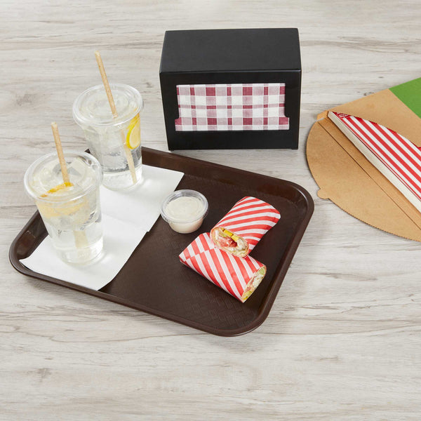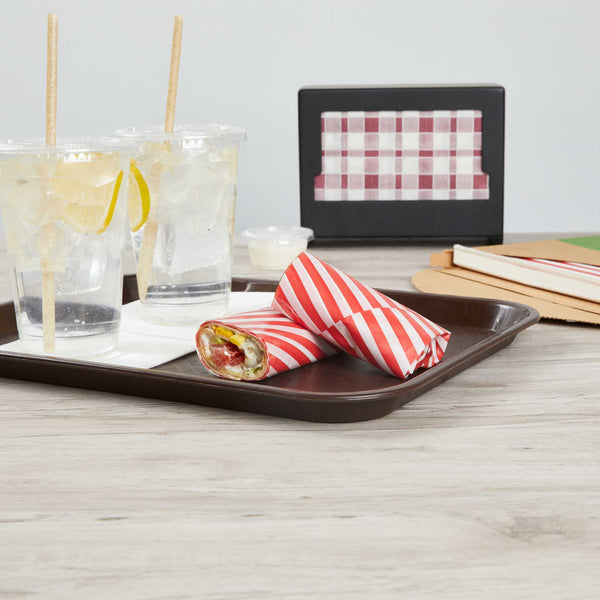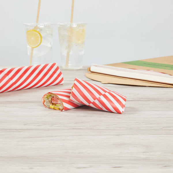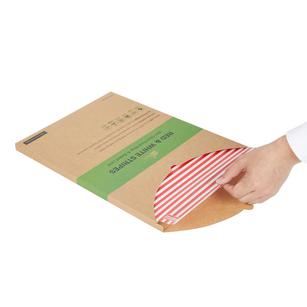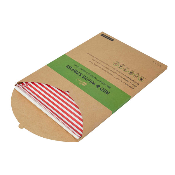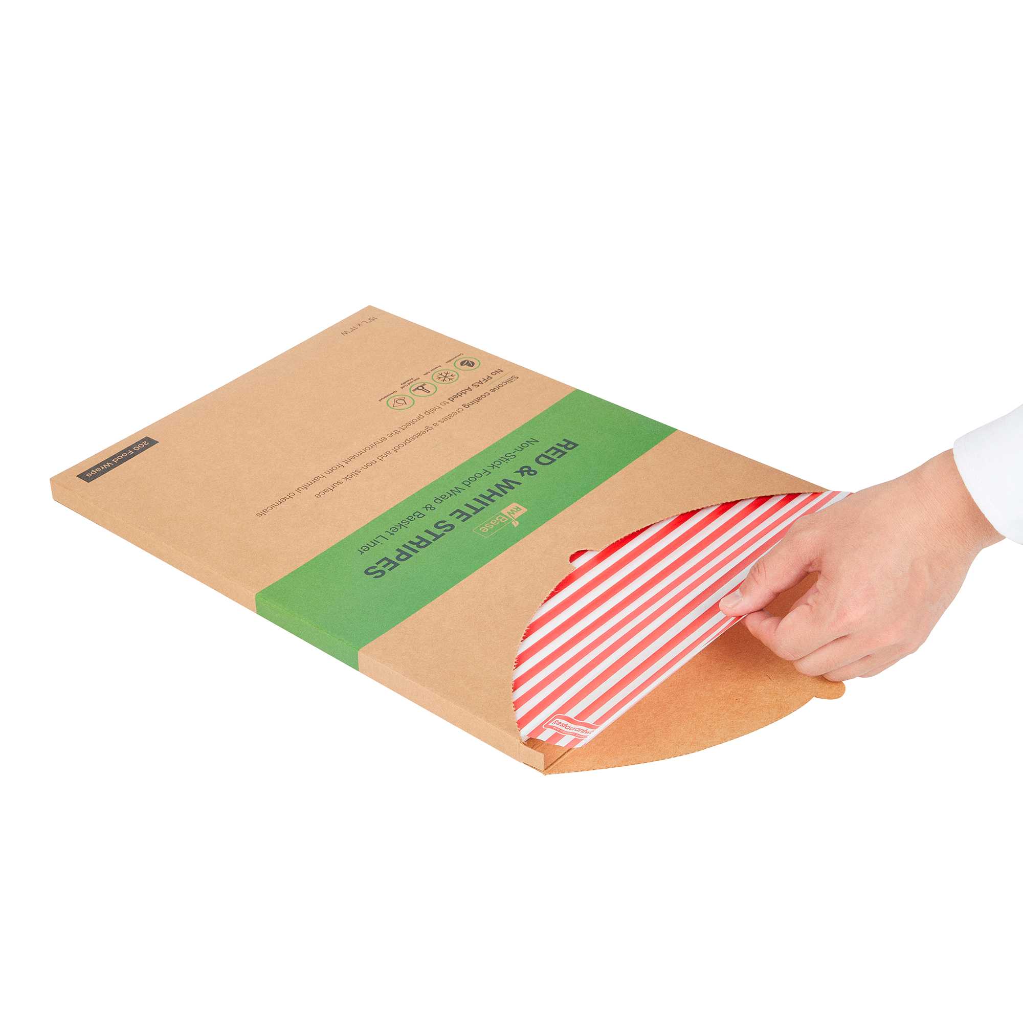 Meet our Chef 101 No PFAS Added Red and White Stripe Paper Food Wraps and Basket Liners, an essential addition to your foodservice supplies. These food wraps are crafted from durable paper with no added PFAS, ensuring a sturdy hold for a variety of food items. Featuring a greaseproof silicone coating, these taco paper wraps avoid oil seepage, maintaining the integrity of your tacos, sandwiches, and more. These sandwich wrap papers have a trendy red and white striped design, which gives a timeless, clean look that complements any food presentation. These basket liners demonstrate their versatility by being freezable, accommodating cold food items with ease. Plus, these deli papers are conveniently precut, saving you time and effort in your busy kitchen. These disposable food wraps are reprocessable and sustainable. With dimensions that measure 15 inches in length by 11 inches in width, they provide ample space to wrap, line, and serve a variety of food items. Sold in a 200 count box.