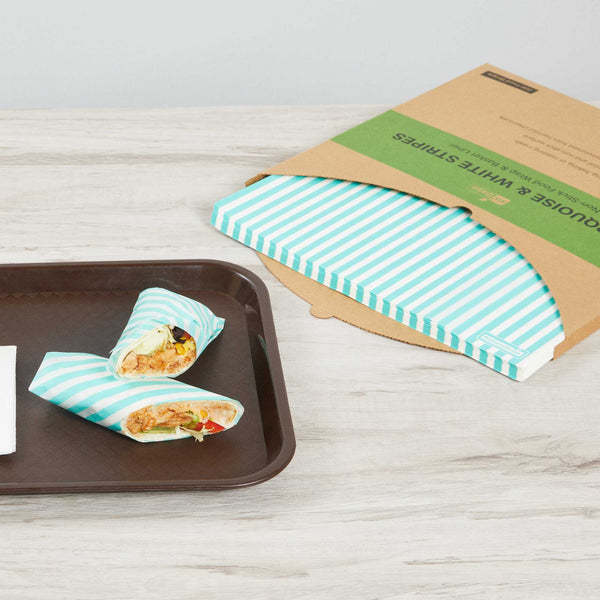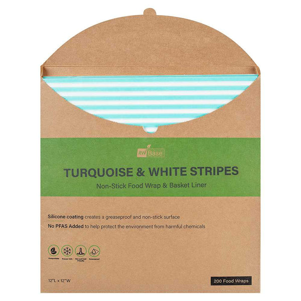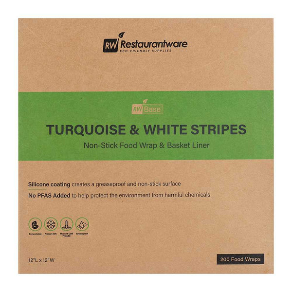 Upgrade your food presentation with our Chef 101 No PFAS Added Turquoise and White Stripe Paper Bakery Wraps and Basket Liners. Crafted from durable kraft paper construction with no added PFAS, these bakery wraps prioritize safety and sustainability. Designed as versatile food wraps, these papers are perfect for wrapping tacos, sandwiches, and more. With their greaseproof silicone coating, these taco paper wraps ensure your dishes stay without any mess. Enhance your deli papers with this turquoise and white striped design, providing a stylish alternative. The freezable properties of these sandwich wrap papers make them suitable for various applications in your bakery, restaurant, or food truck. Conveniently disposable, these basket liners offer a convenient cleanup solution. Measuring 12 inches in length by 12 inches in width, these recyclable food wraps come precut and are perfect for handling a variety of dishes. Sold in a 2,000 count box.
