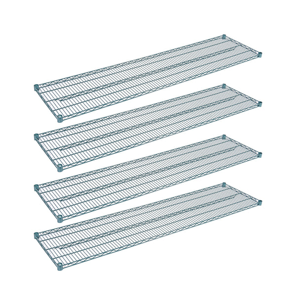 Expand your storage capabilities with our Chef 101 NSF Green Epoxy Shelves. Constructed from durable steel, these wire shelves can handle a hefty 450 pounds per shelf, creating ample storage for your commercial kitchen gear. With a green epoxy coating, these wire storage racks are corrosion-resistant and designed to thrive in humid and wet storage settings. These storage shelves can be with their compatible mobile shelving posts (SKU: RWT1426G) or stationary shelving posts (SKU: RWT1427G), offering you the convenience of a versatile storage setup. Equipped with vertical ribs, these NSF wire shelves provide an extra layer of support and durability. These epoxy-coated shelves come with 32 split sleeves that effortlessly snap onto each other for easy assembly. The distinct vented design of these storage racks ensures improved airflow and prevent dust buildup, effectively maintaining the freshness of stored items. These metal shelves measure 18 inches in width and 72 inches in length by 1.5 inches in height. Sold in a 4 count box. Shelving posts are available and sold separately.