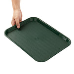 Streamline tray service with our Chef 101 Rectangle Forest Green Plastic Fast Food Trays. Designed with a textured surface to prevent sliding, these restaurant trays support safe and stable food transport in fast-paced environments. The deep green hue adds a fresh, clean feel to dining halls, cafés, and quick-service counters. Built from high-quality plastic, these serving trays are resistant to wear and dishwasher-safe for repeated use. A raised outer rim ensures better grip and reduced mess during movement. Each plastic tray measures 10 inches in length by 14 inches in width. Sold in a 10 count box.