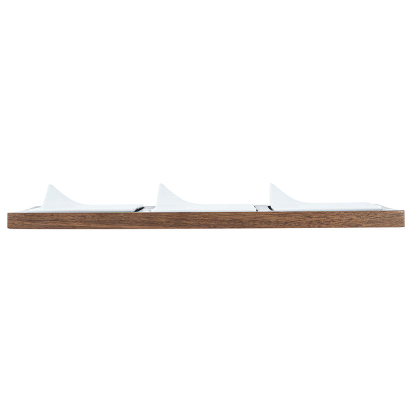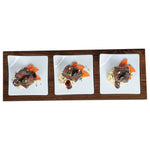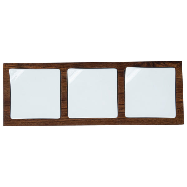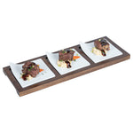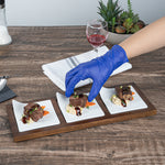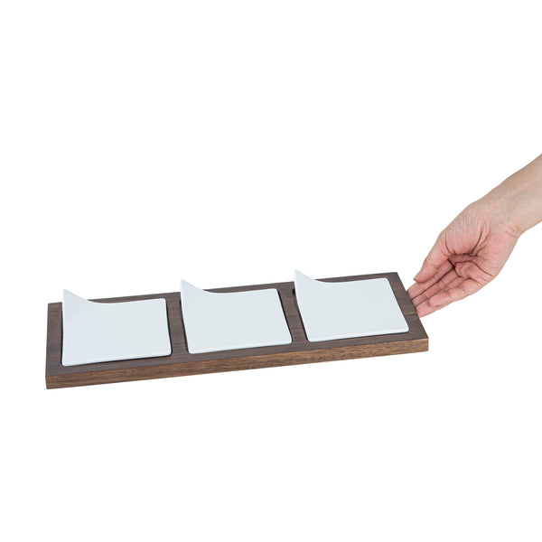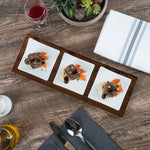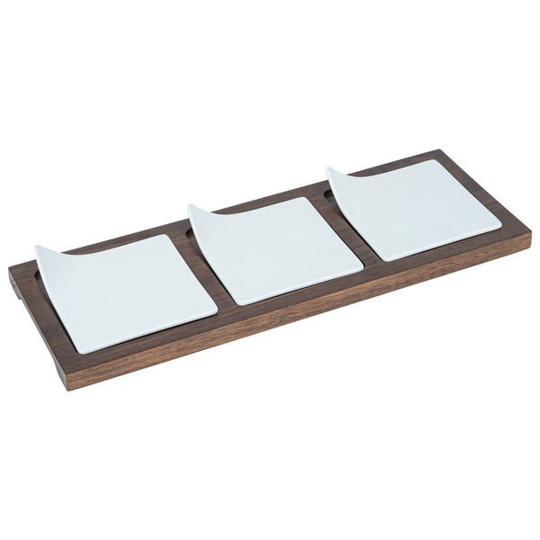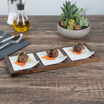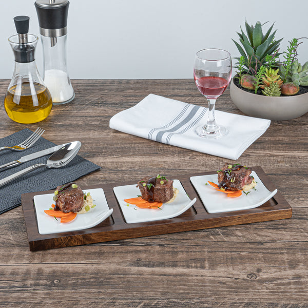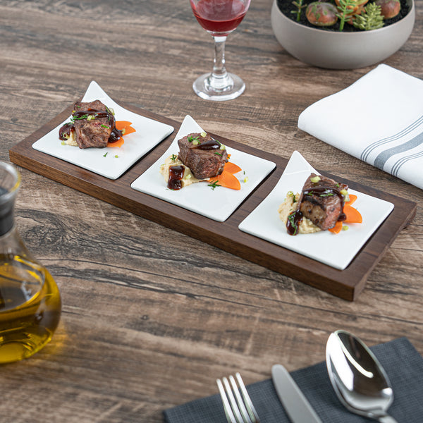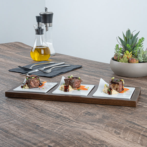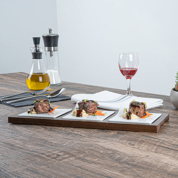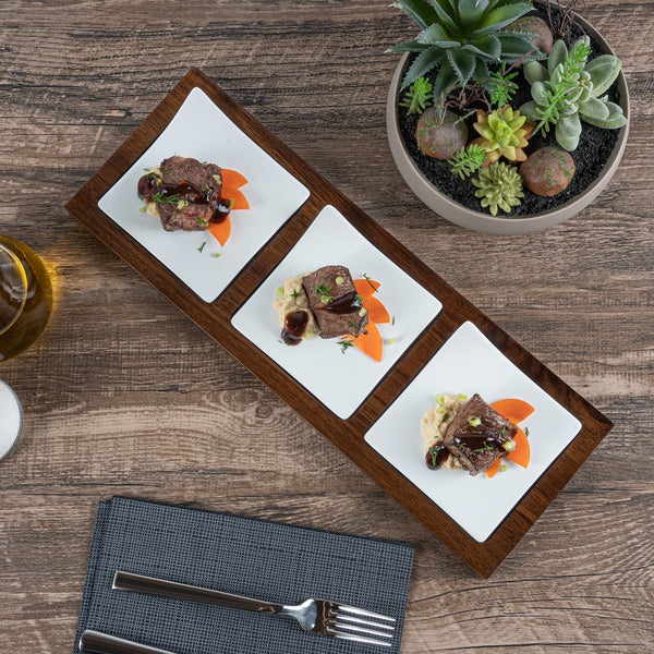 Showcase savory tasting dishes with our Chef 101 Rectangle White Porcelain Modern Flat Plate Set. Featuring 3 square porcelain plates and a bamboo wood tray, this serving platter set effortlessly enhance food presentations at your bistro, buffet, catering event, and more. With a flared handle, these tasting plates provide a convenient way for guests to choose their desired dish. This durable wooden tray to hand out plated small portions of savory chicken parmesan, cheese raviolis, and fresh bruschetta crostinis at your next catering event. Constructed from premium porcelain, these white serving dishes are chip-resistant and durable, making them suitable for serving various hot or cold food items. These porcelain plates are microwave-safe and oven-safe, offering you diverse way to reheat your food. Dishwasher-safe and freezer-safe, these white plates simplify your cleanup process while letting your store leftovers. These platter tray set measure 14.25 inches long by 5 inches wide by 1.5 inches tall. Shipped in a 1 count box.